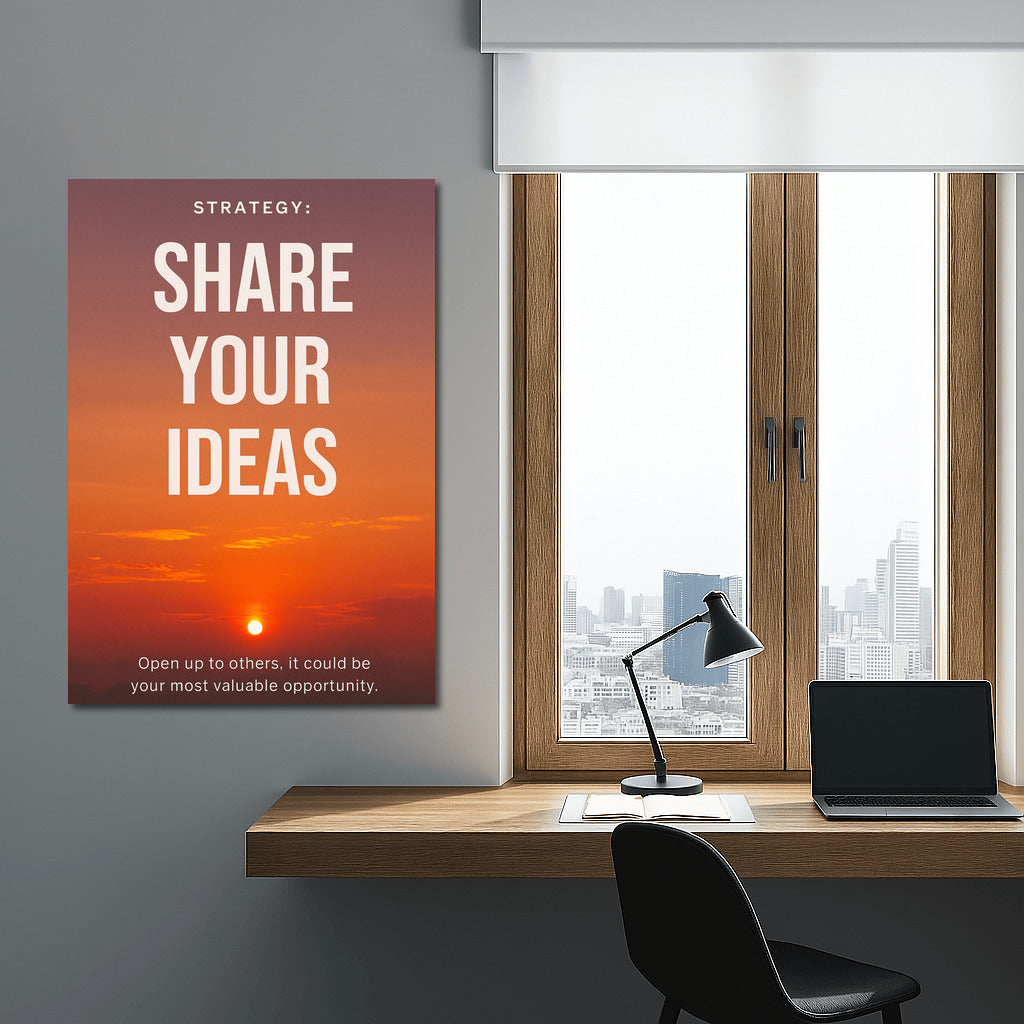 SHARE YOUR IDEAS poster: against a sunset backdrop, inspiration to open up to the world. Art that turns strategy into opportunity. See more from the collection: Dreams & Vision Quotes Art