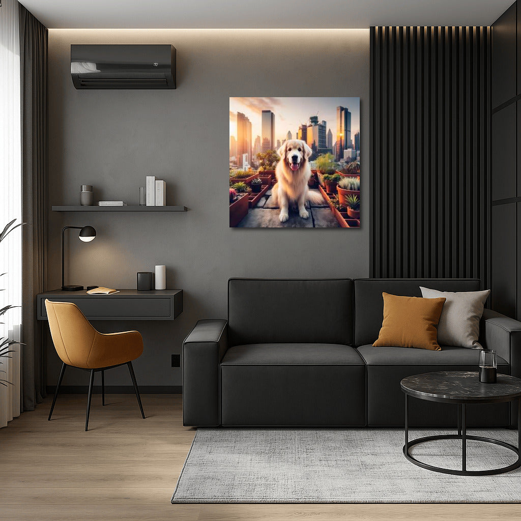 Sunset on the Roof: Dog in Urban Landscape Wall Art