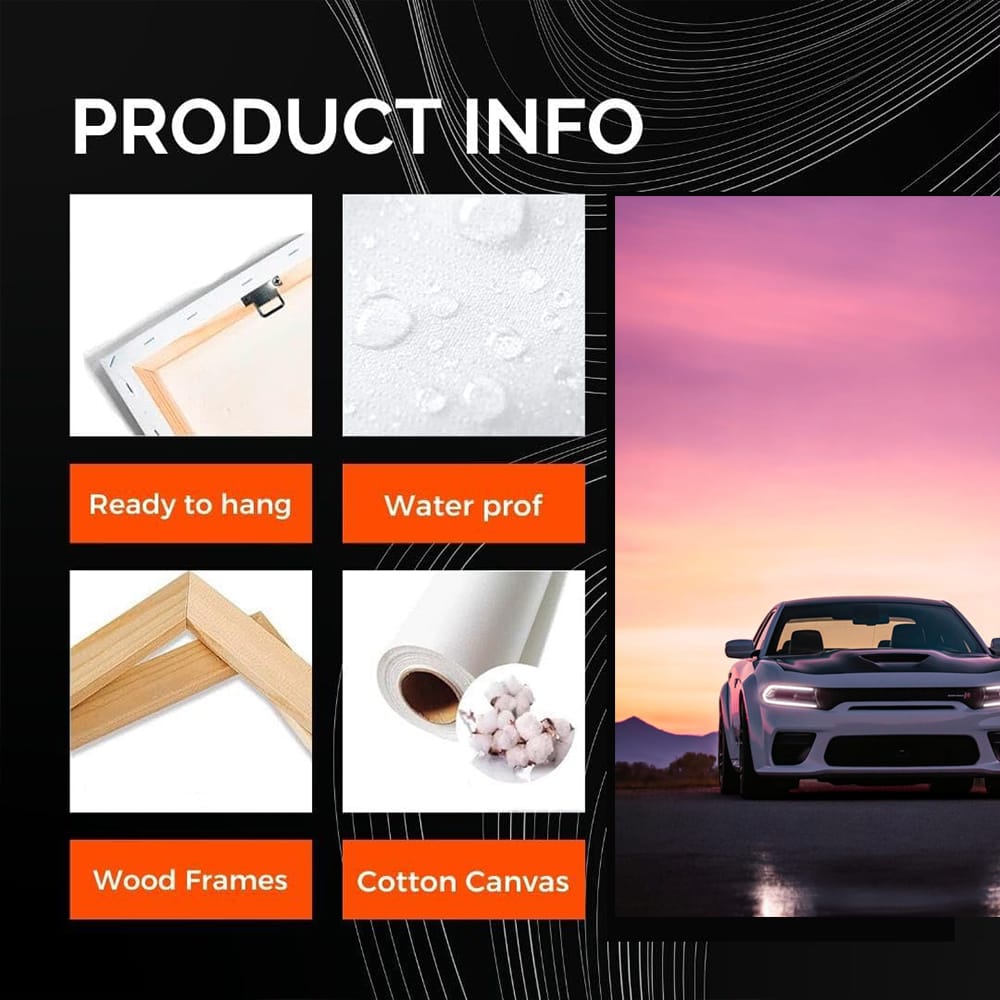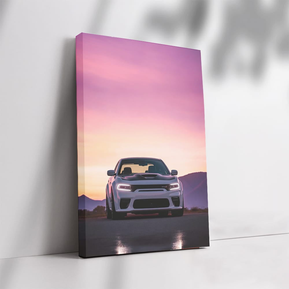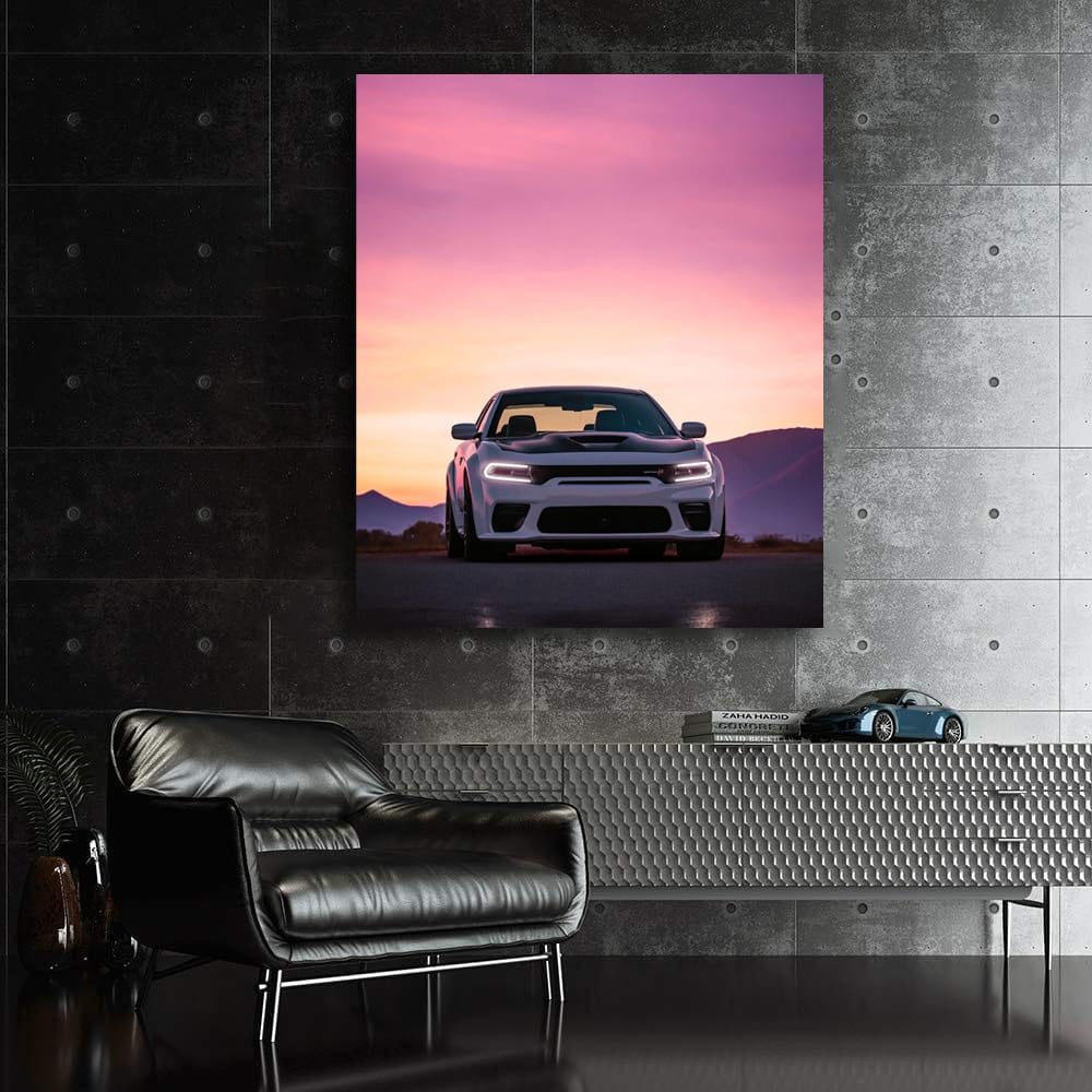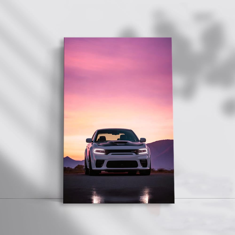 This painting is a legend on the wall. The Dodge Sunset poster is like a wild animal on the road, frozen in the sunset rays. Wall art for those who are always in search of speed and adrenaline. This is not just a painting, it is a piece of the road in your room. See more from the collection: Dodge Art