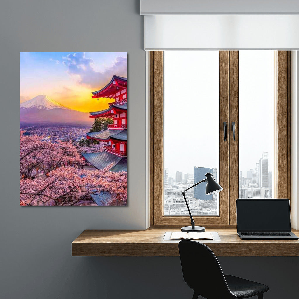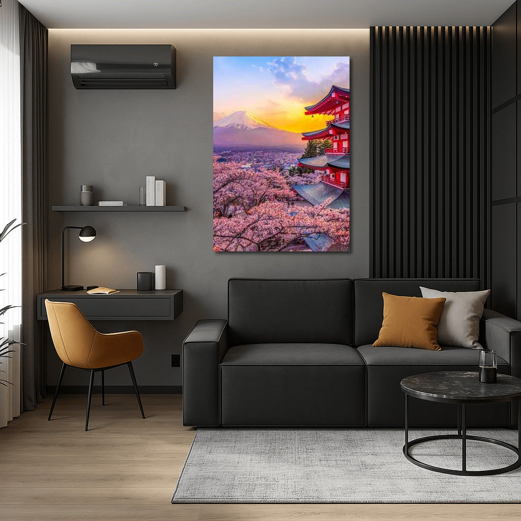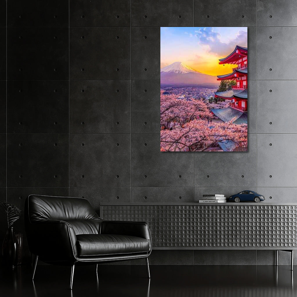 Immerse yourself in the harmony of Japan with wall art: distant Mount Fuji, cherry blossoms in full bloom, and an elegant temple against the backdrop of sunset. See more from the collection: Country Art