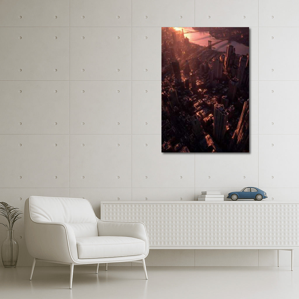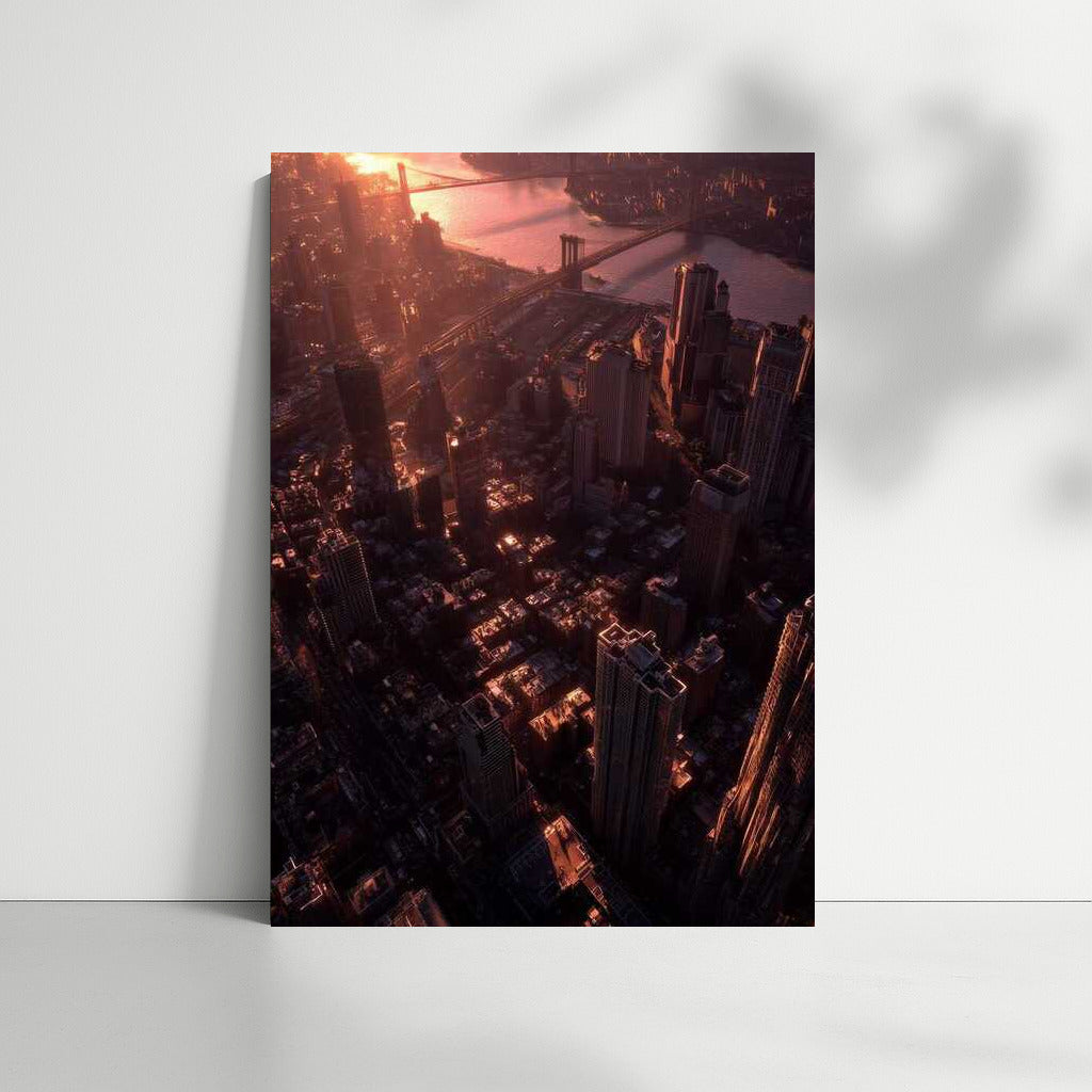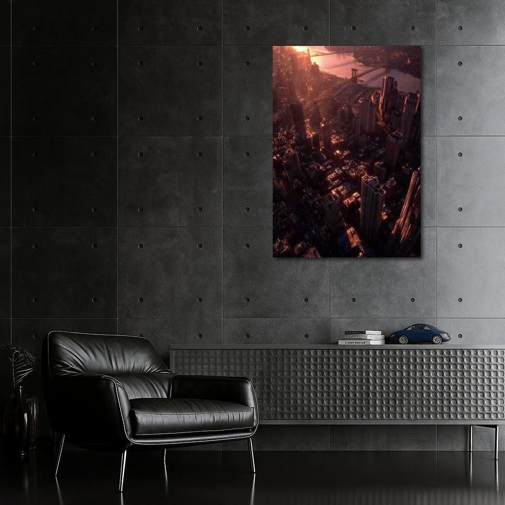 The sunset over New York comes to life in this poster, capturing the atmosphere of the city and the grandeur of its skyscrapers. Wall art. See more from the collection: Country Art