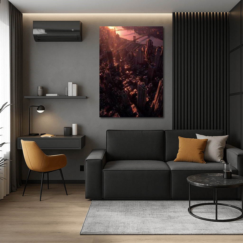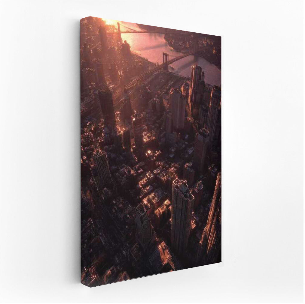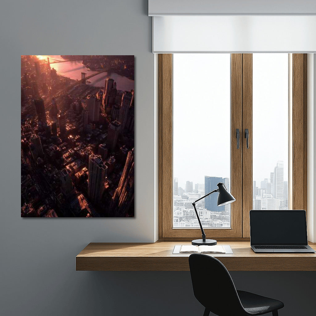 The sunset over New York comes to life in this poster, capturing the atmosphere of the city and the grandeur of its skyscrapers. Wall art. See more from the collection: Country Art