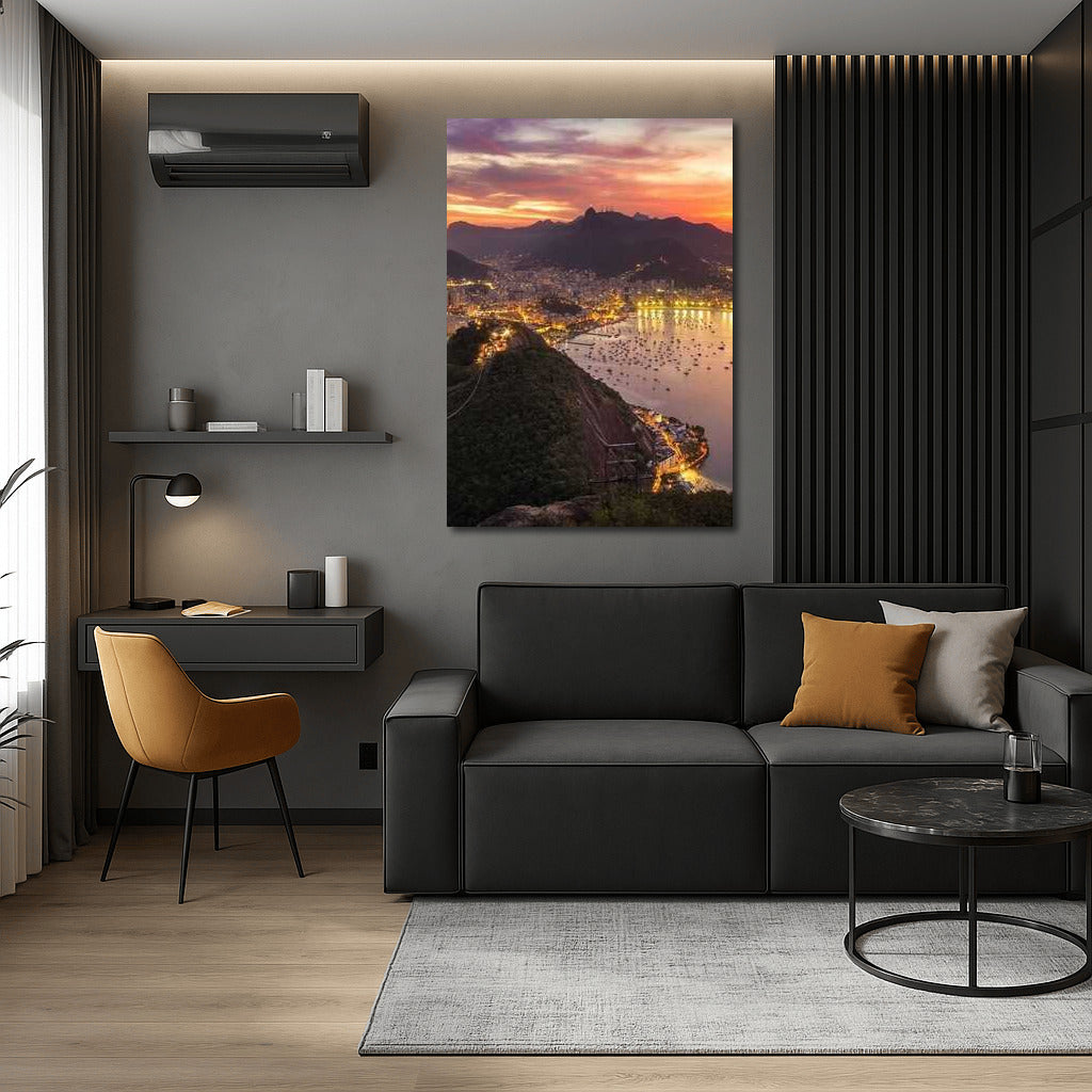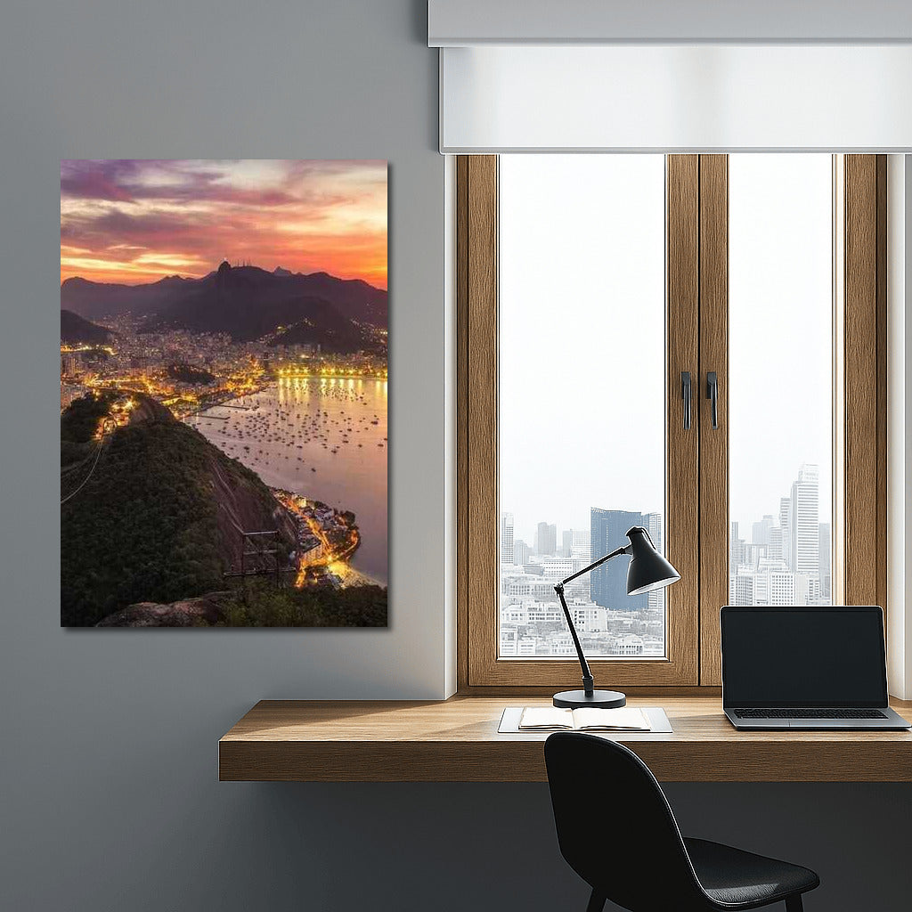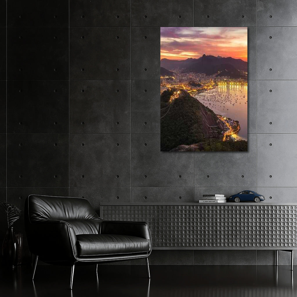 Sunset in shining Rio: the grandeur of nature and the city in one poster. Wall art from the heart of Brazil. See more from the collection: Brazil Art