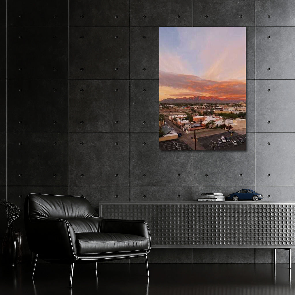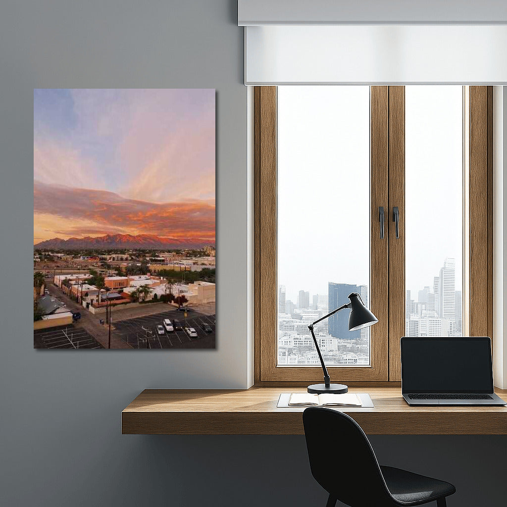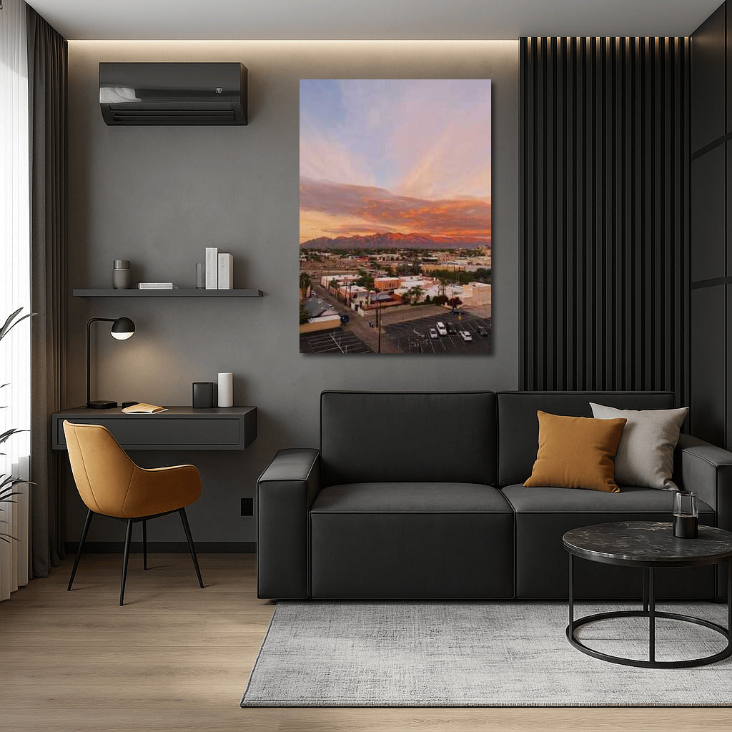 Experience the Arizona vibe with this poster: sunset over the city and mountains creates unique wall art. See more from the collection: Country Art