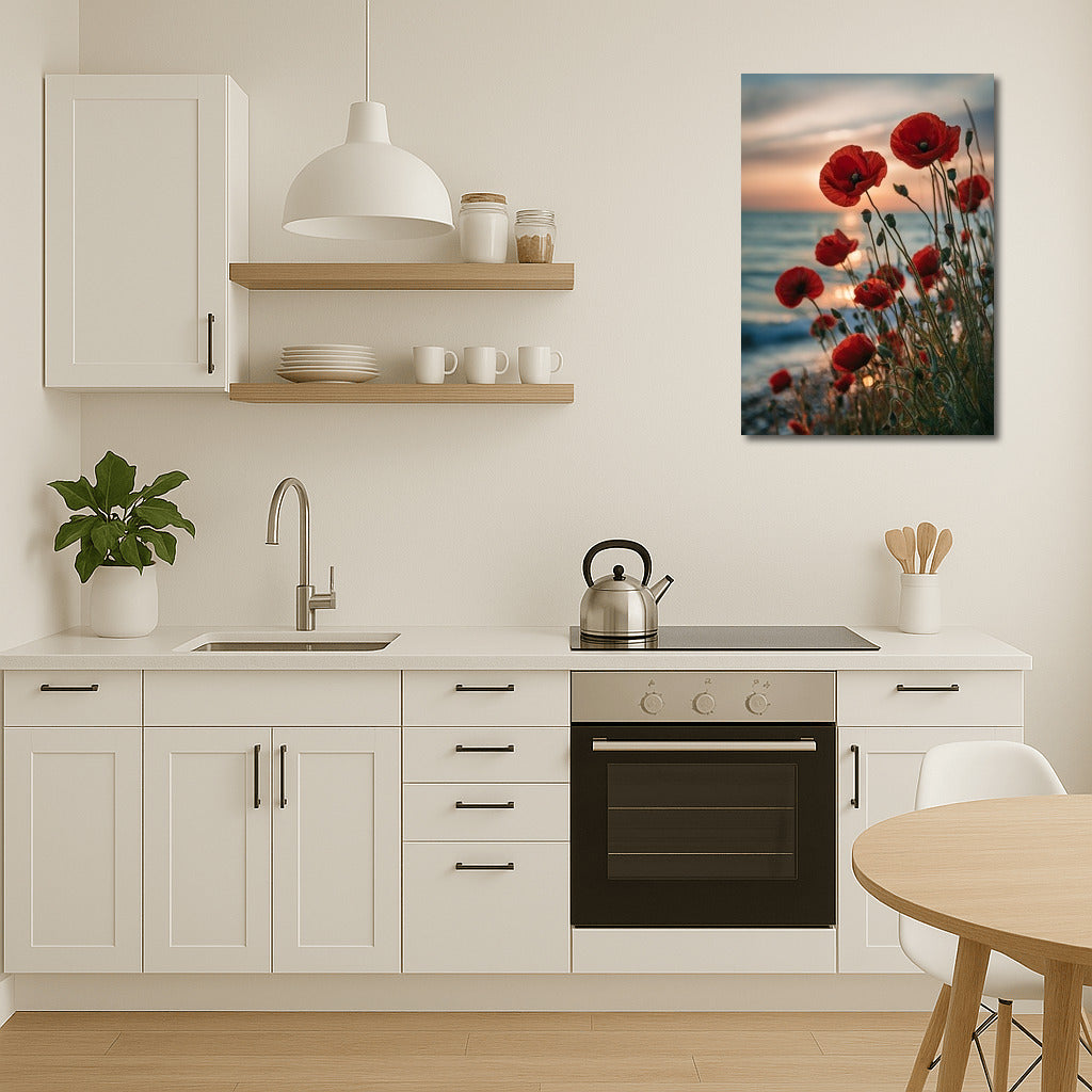 Red poppy against the sunset and sea is a wall art where flowers bloom in every ray. Fill the interior with their tenderness. See more from the collection: Flowers Art