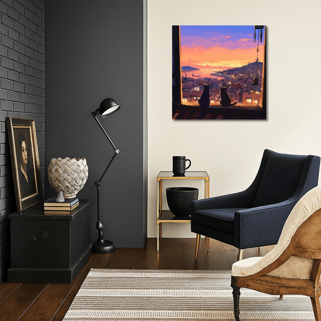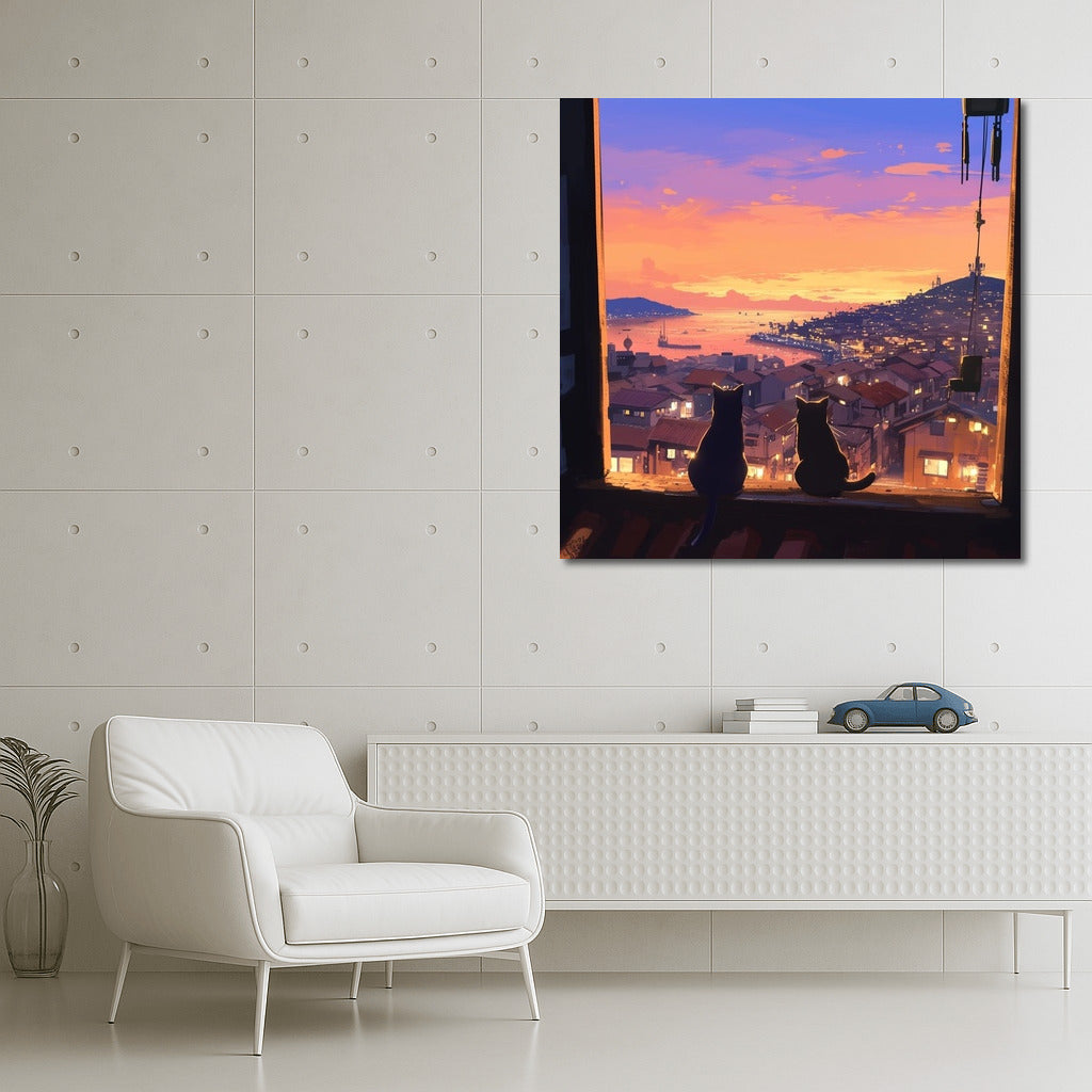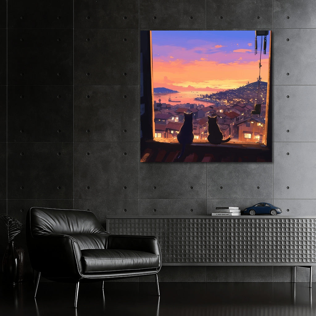 Two cats enjoying the sunset on a city rooftop. Get cozy with this poster - perfect wall art for dreamers. See more from the collection: Animals Art