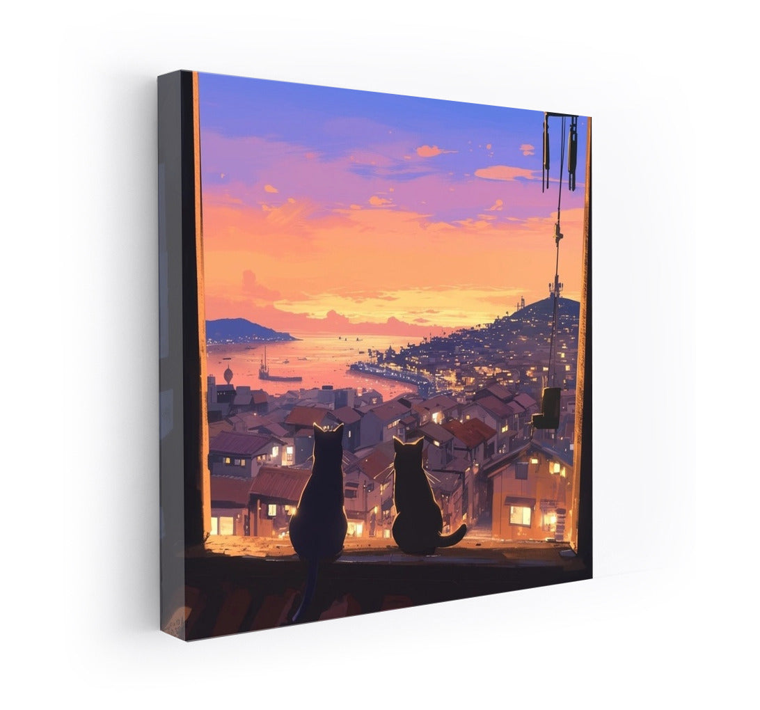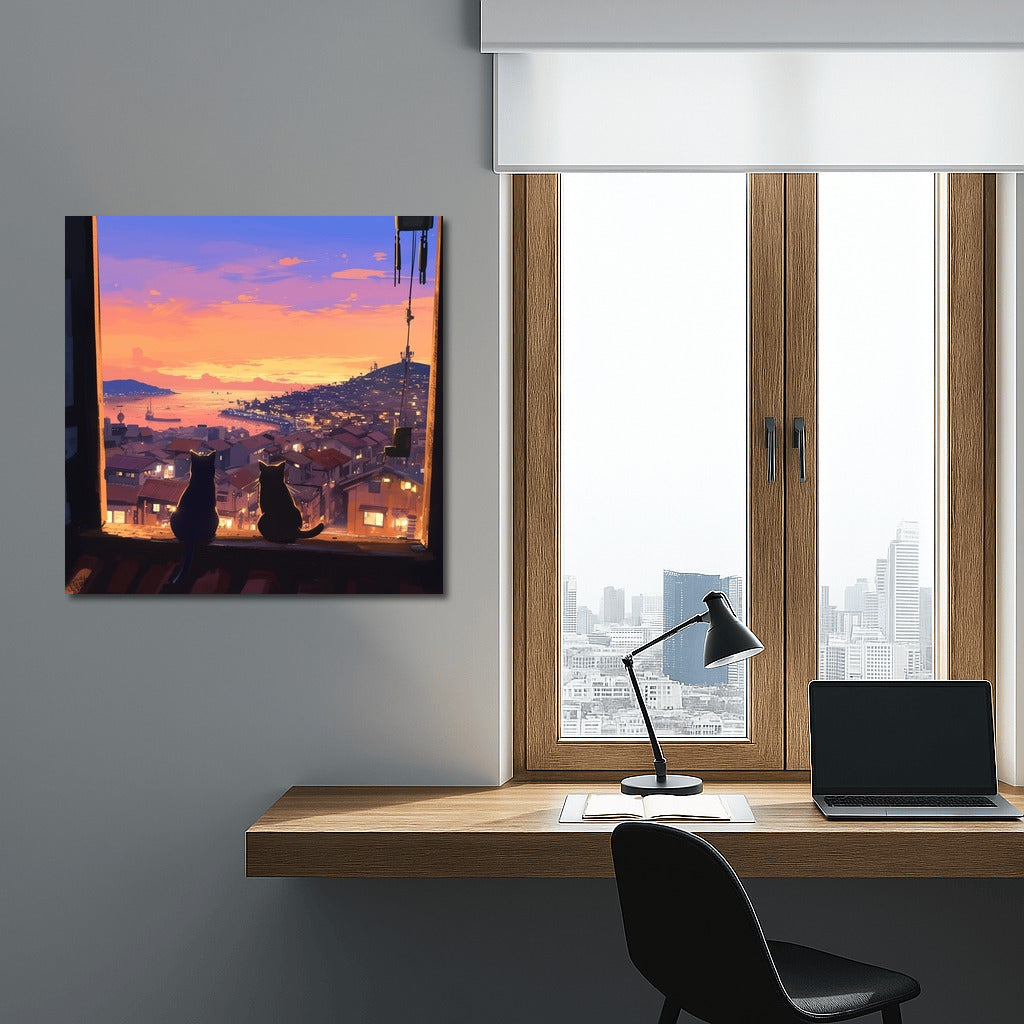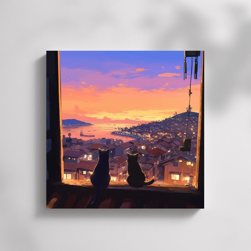 Two cats enjoying the sunset on a city rooftop. Get cozy with this poster - perfect wall art for dreamers. See more from the collection: Animals Art