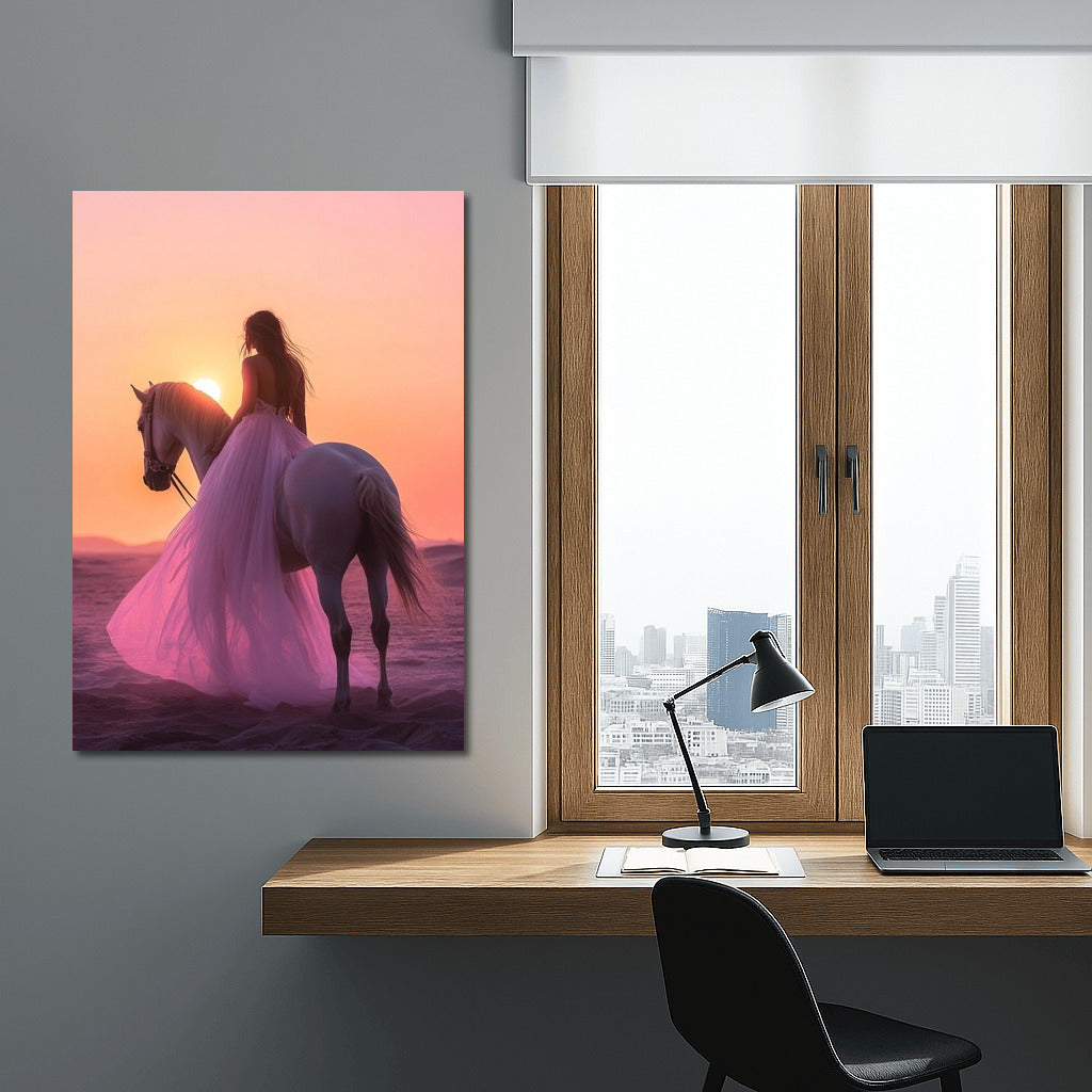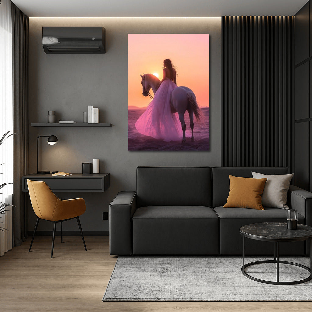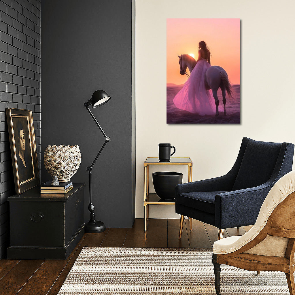 Magical evening: silhouette of a rider and a horse against the sunset. This poster will add a touch of dream and freedom to your interior. See more from the collection: Wall Art with Women