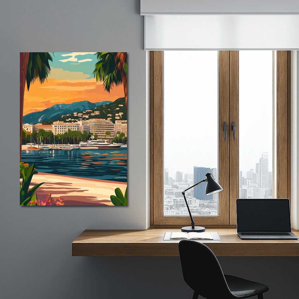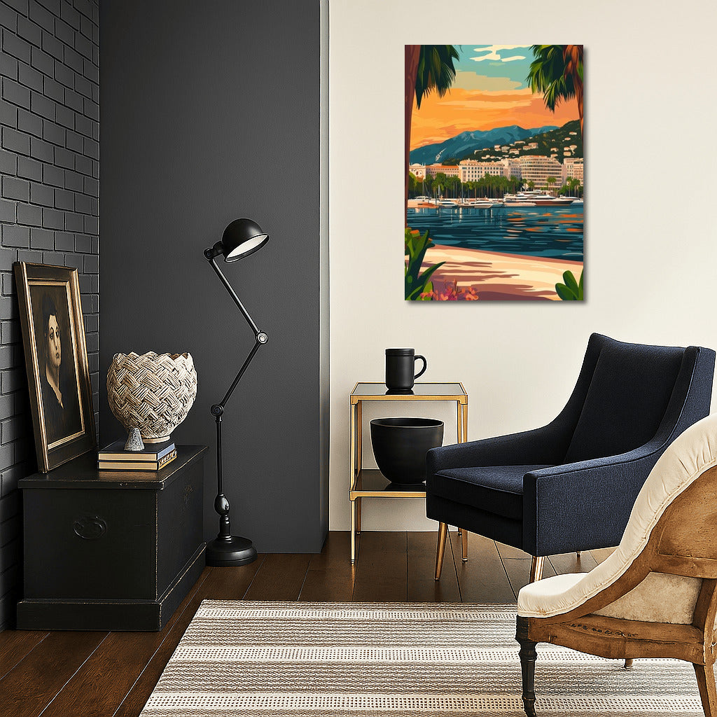 Embrace the seaside chic with this poster: a paintingsque view of the coastline bathed in sunset light. Wall art for dreamers! See more from the collection: Mixed Wall Art
