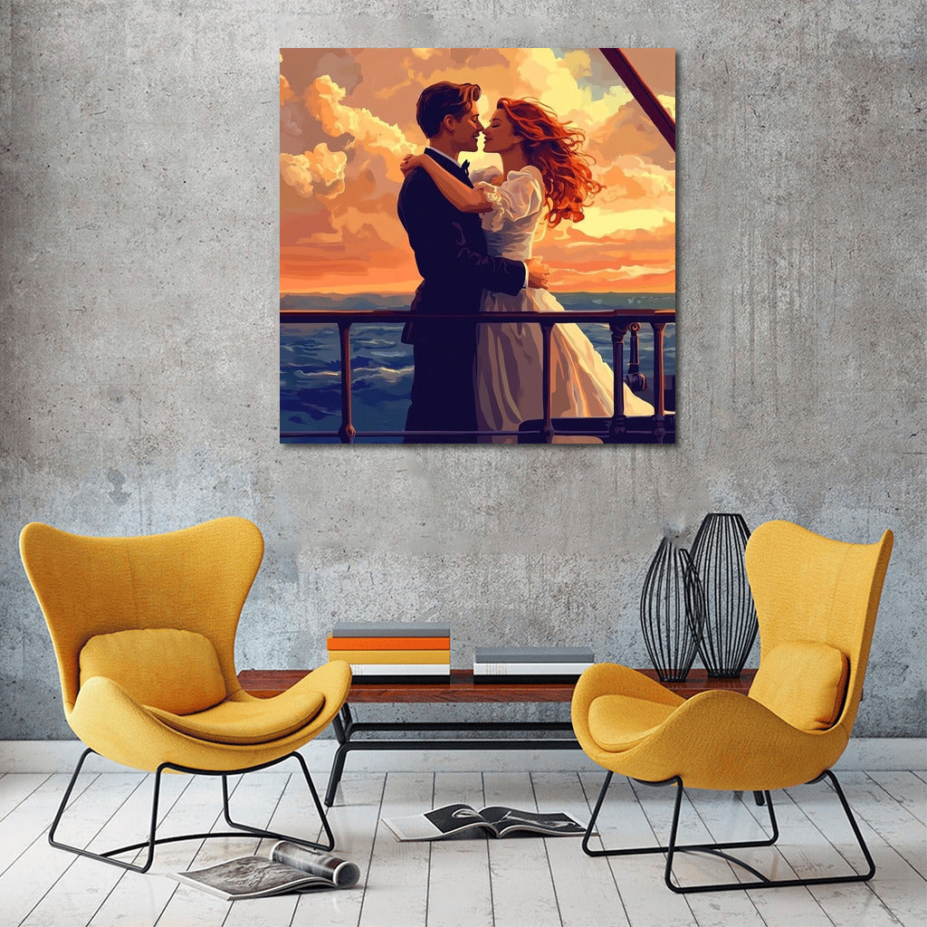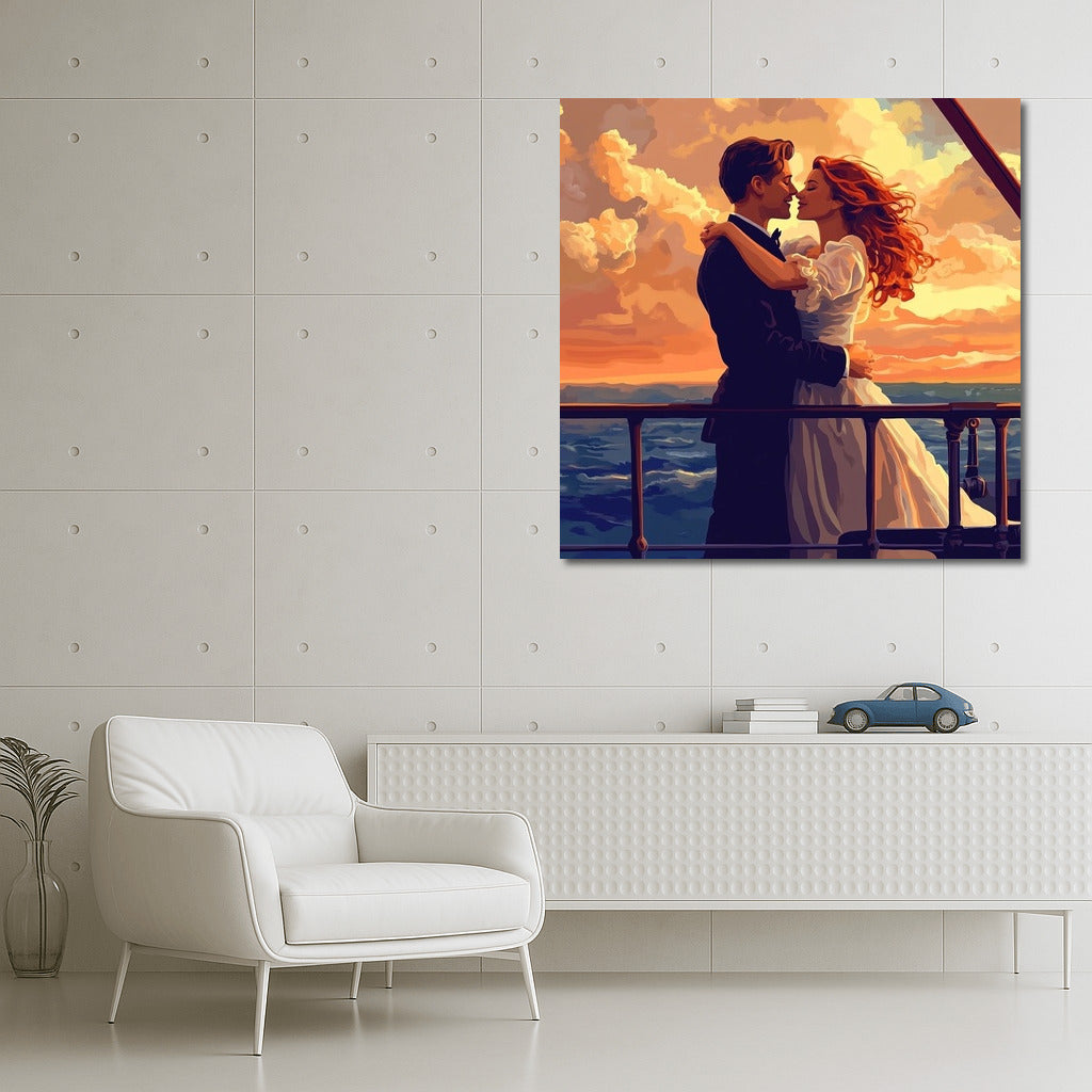 Poster with sunset magic and romance on deck. Wall art for dreamers and lovers of atmospheric plots. See more from the collection: Love Art