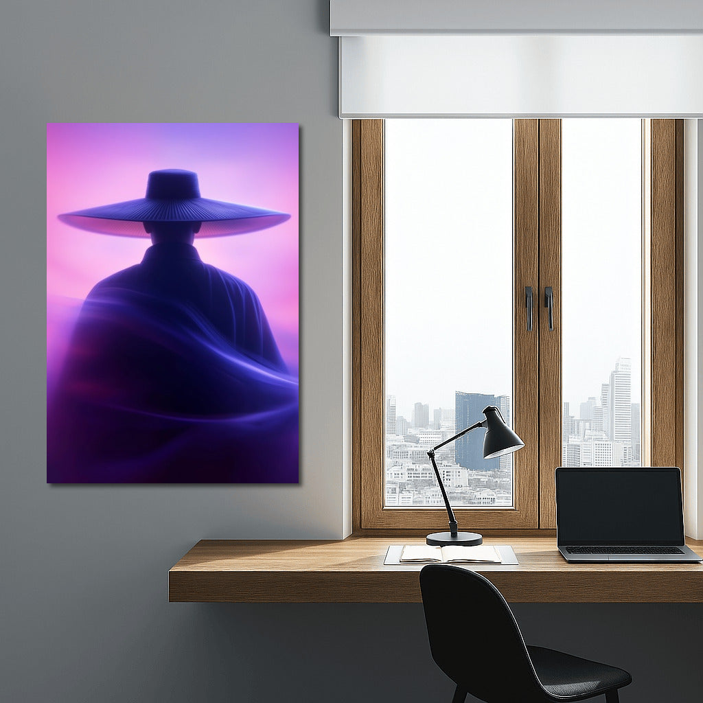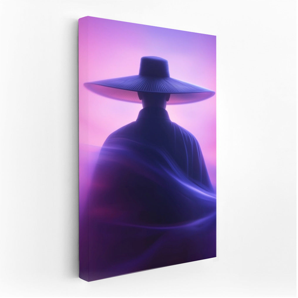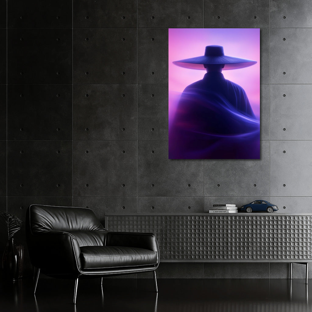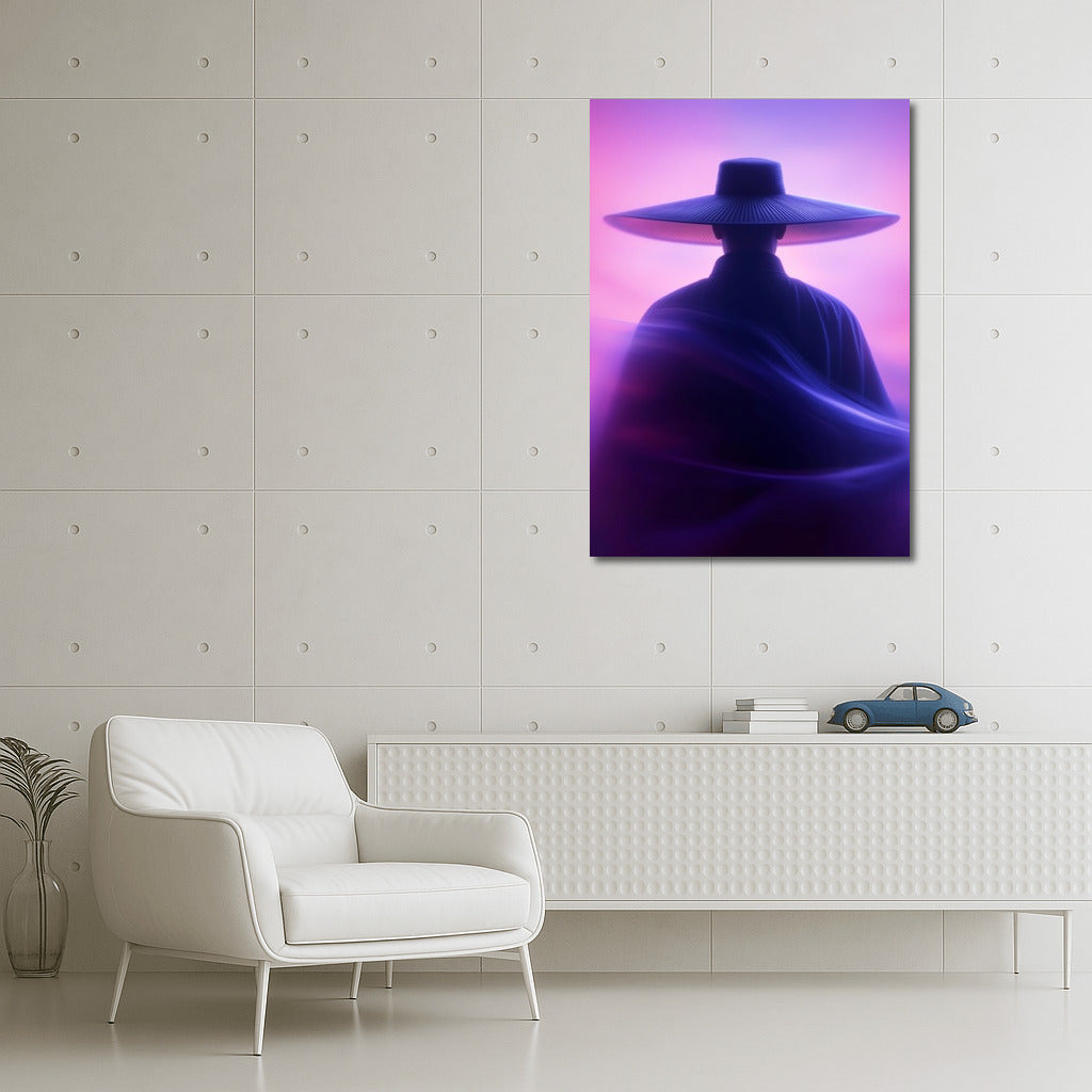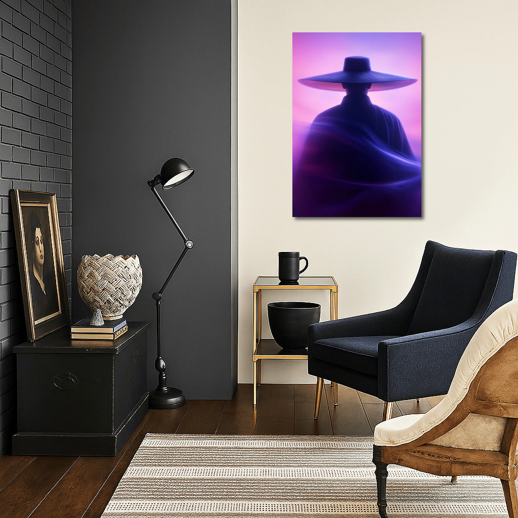 A mysterious silhouette in a hat against the sunset - immersion in a dream world. Ideal wall art for creating a mystical coziness. See more from the collection: Mixed Wall Art