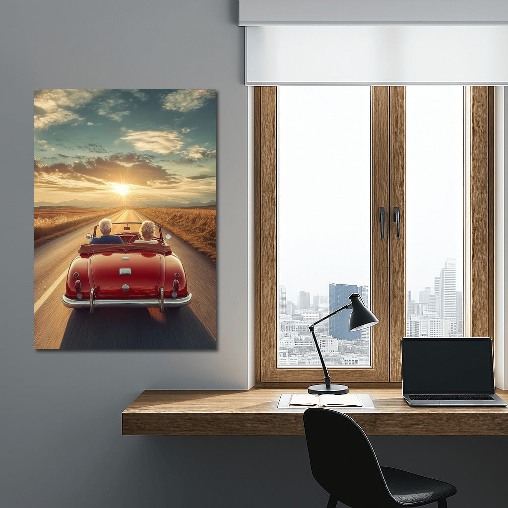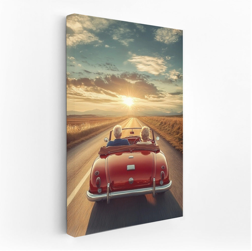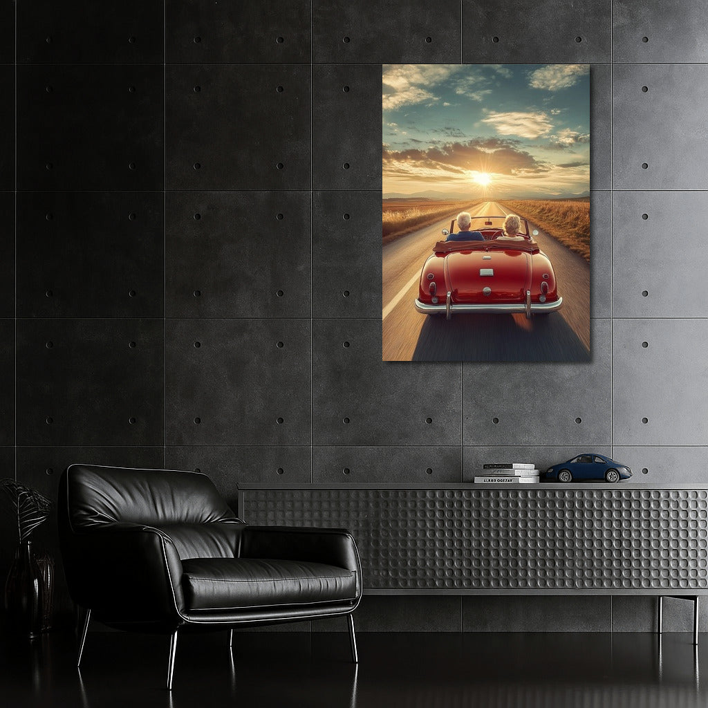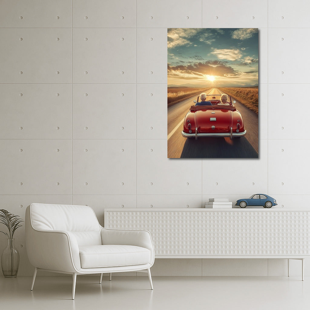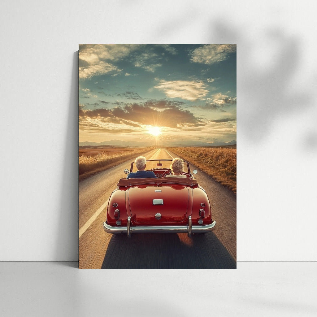 On this poster: red retro convertible, road to sunset. Feel freedom and eternal summer in your home! Wall art. See more from the collection: Retro & Classic Cars Art