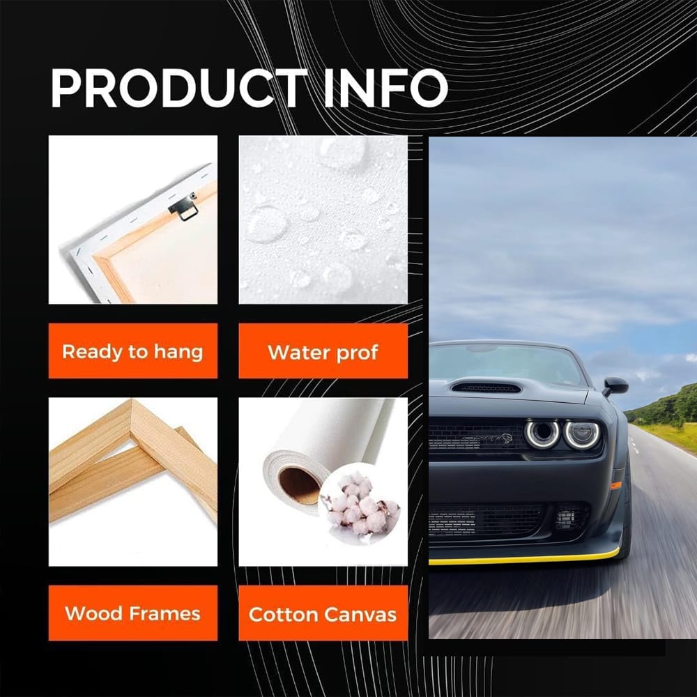 This poster is a pure adrenaline bomb for any wall. The painting of Dodge Supercharged on the road is like a sip of octane cocktail. This is wall art for those who are in the know, who know what power and speed are. A steel beast on canvas, ready to tear up the asphalt. See more from the collection: Dodge Art