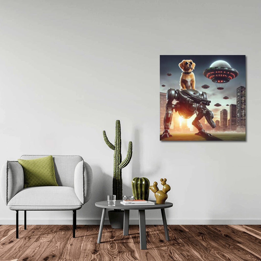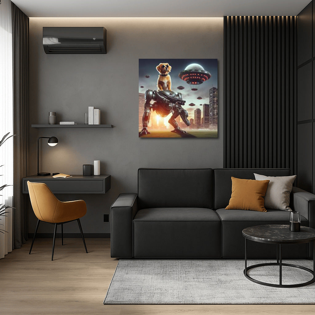A brave dog on a giant robot protects the city from aliens. This exciting poster will become a bright accent in your interior! See more from the collection: Animals Art
