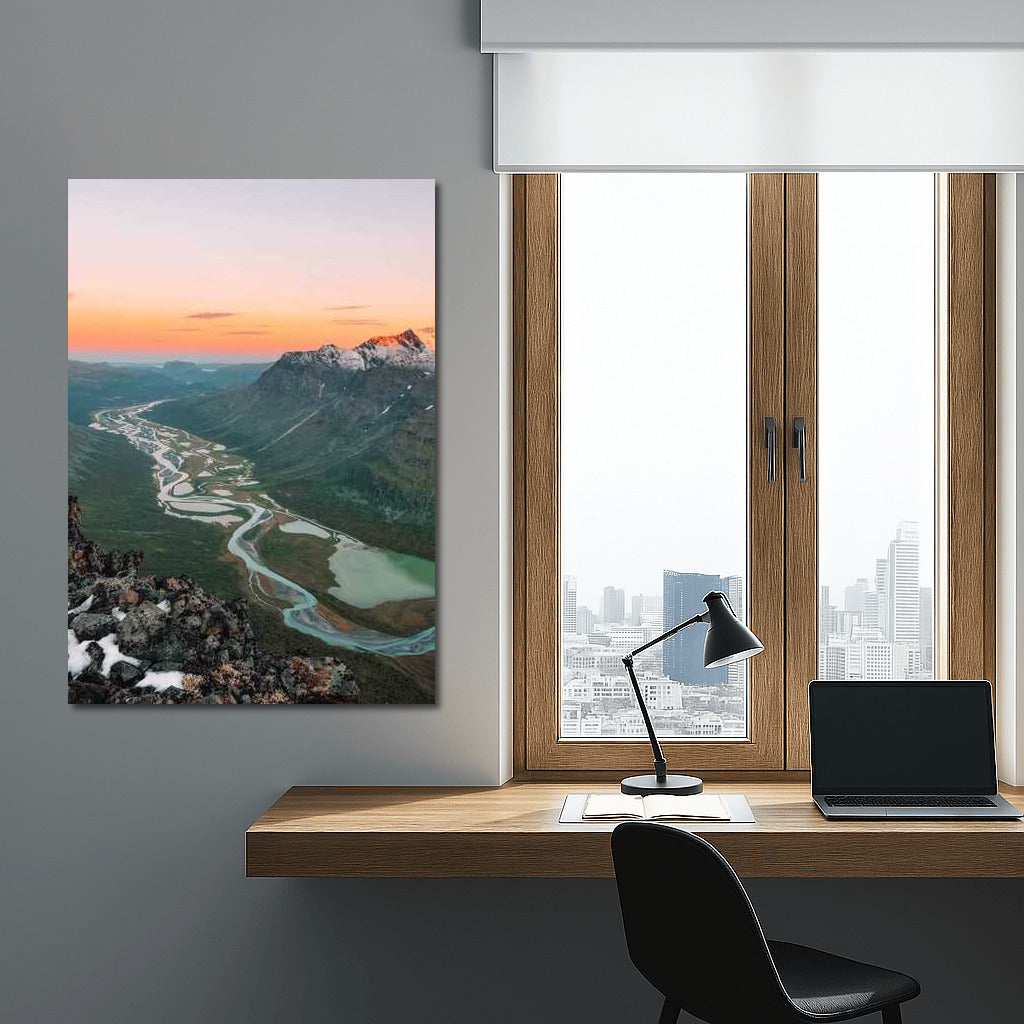 Swedish idyll on your wall: rivers and mountains in the pink glow of sunset will enliven the interior. Wall art about nature. See more from the collection: Country Art