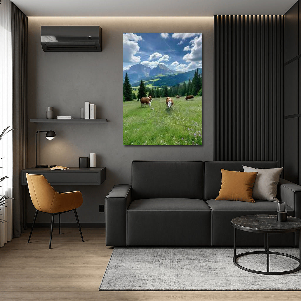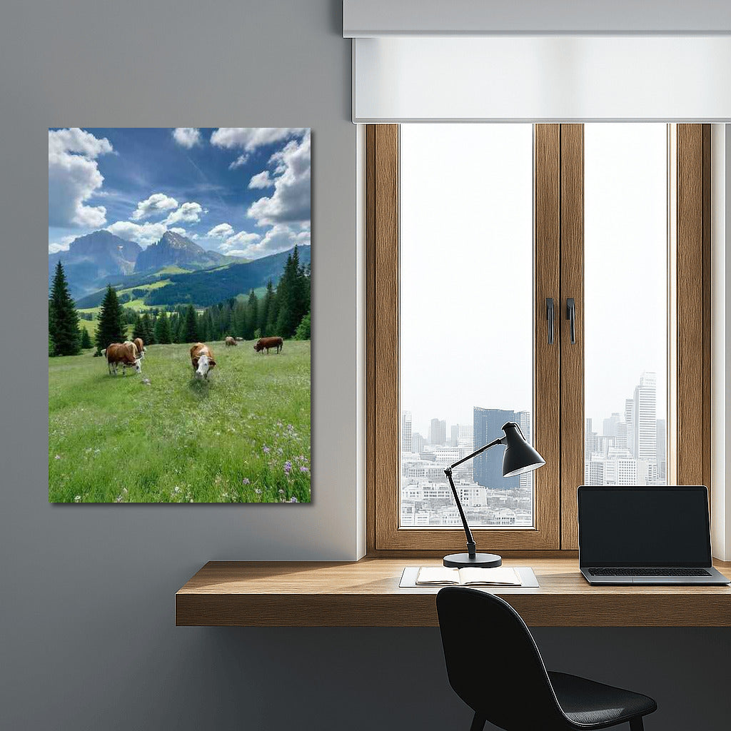 Immerse yourself in the tranquility of Swedish nature with this painting: a pastoral landscape where cows graze peacefully near majestic mountains. See more from the collection: Country Art