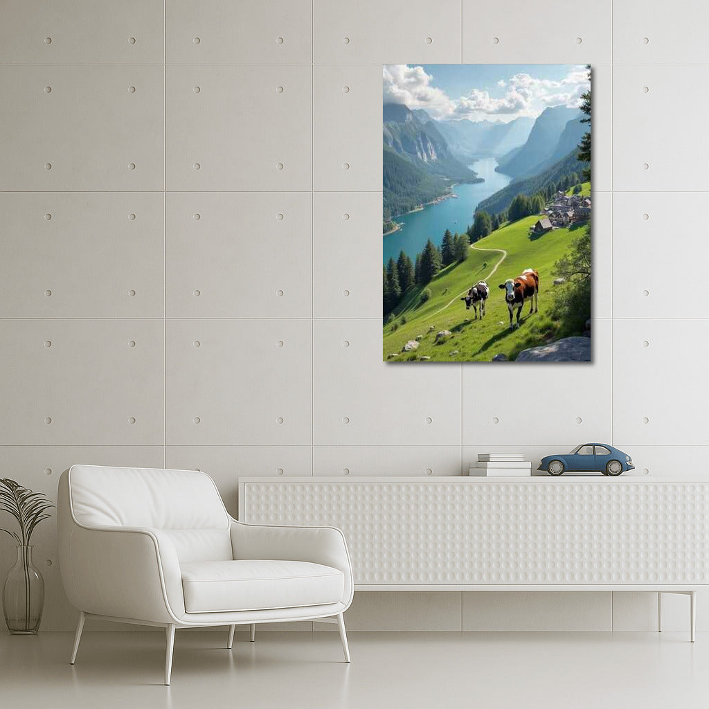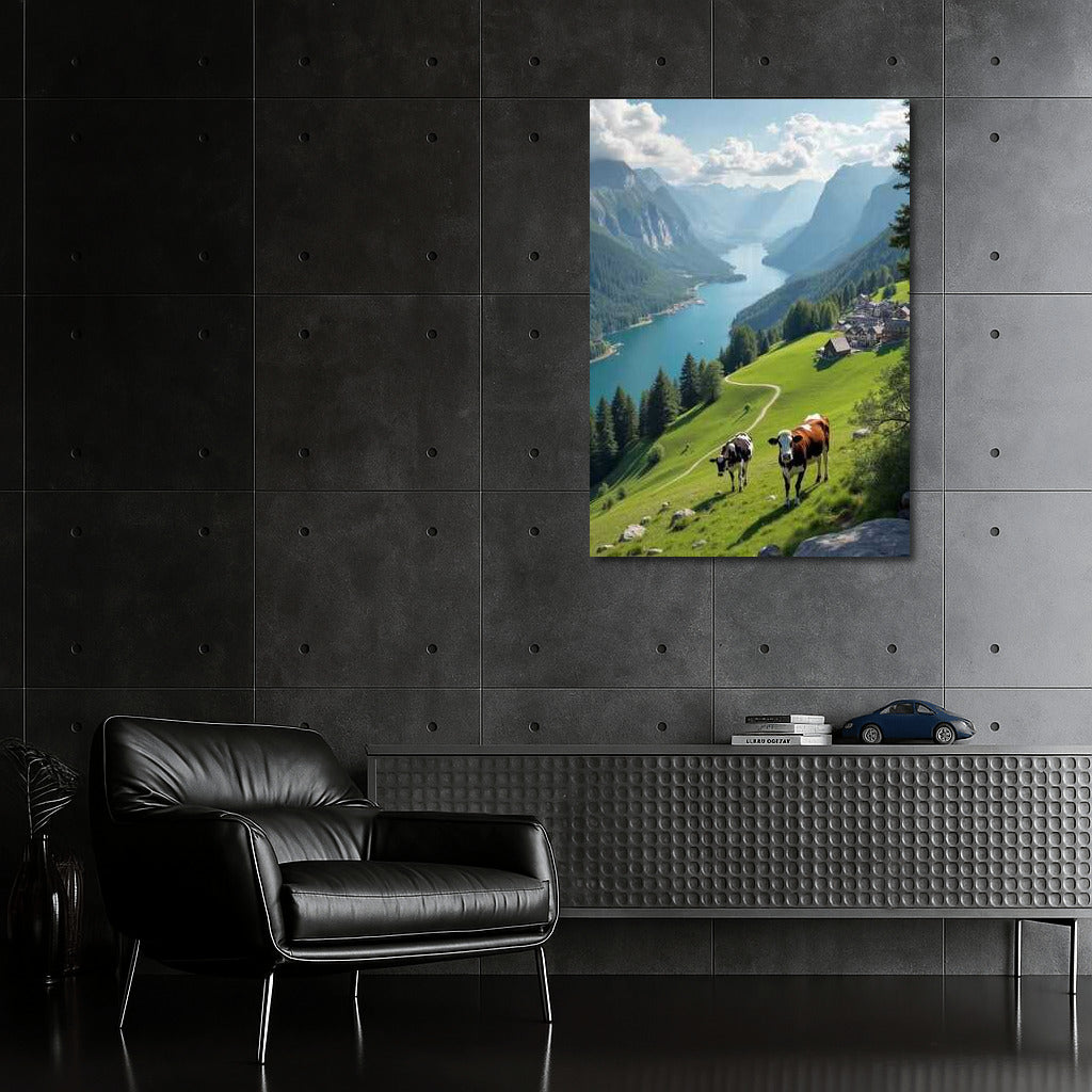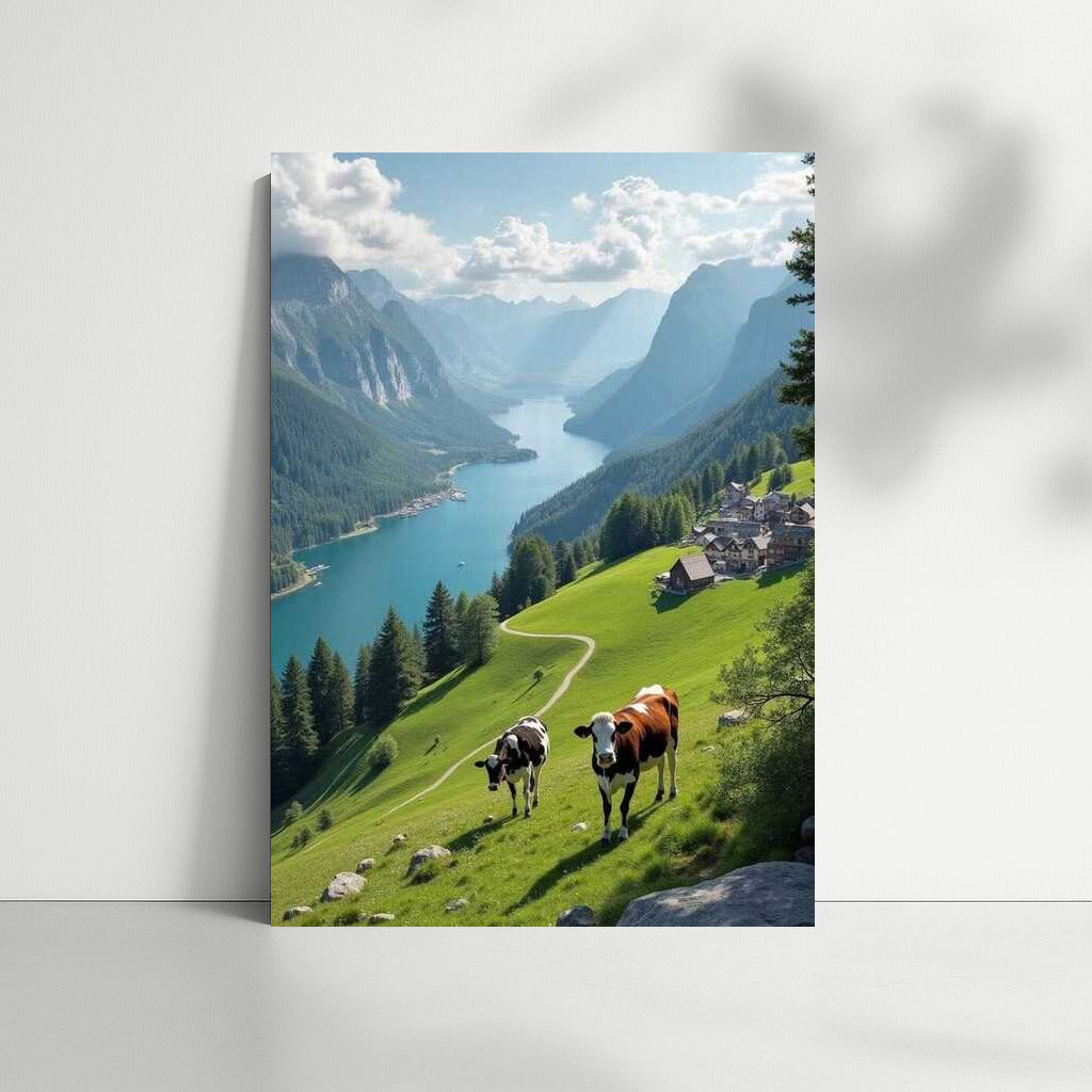 The poster immerses you in the enchanting nature of Sweden: emerald hills, peaceful cows and calm lakes. Wall art for the soul. See more from the collection: Country Art