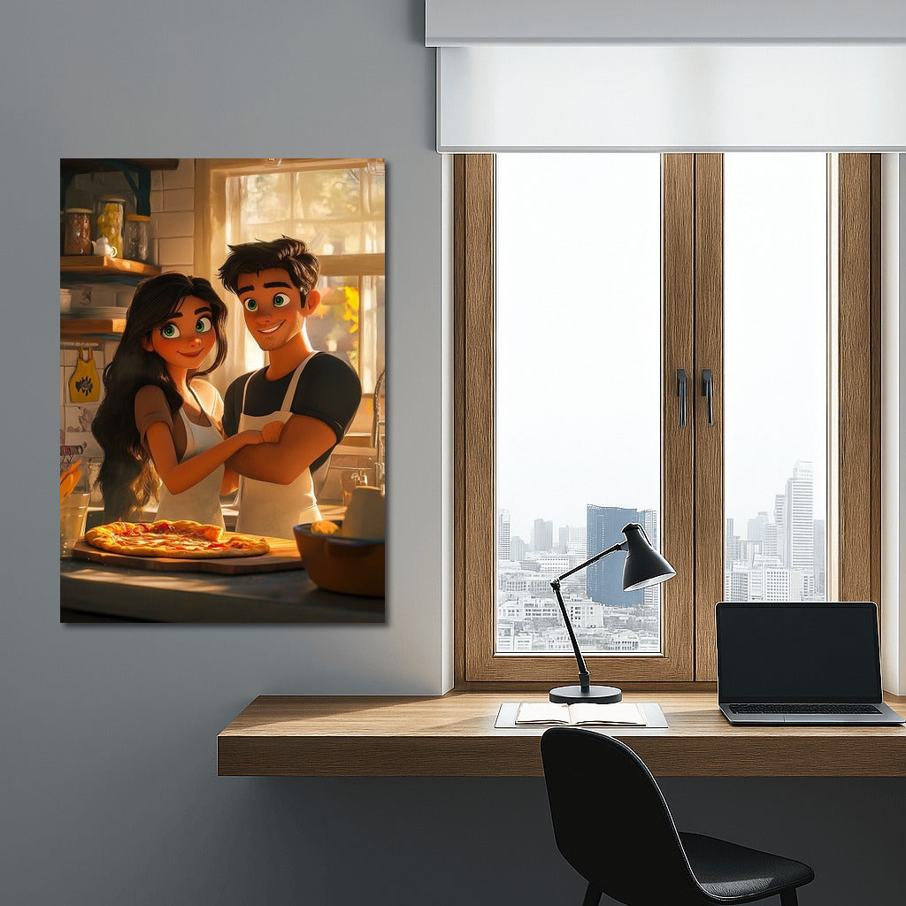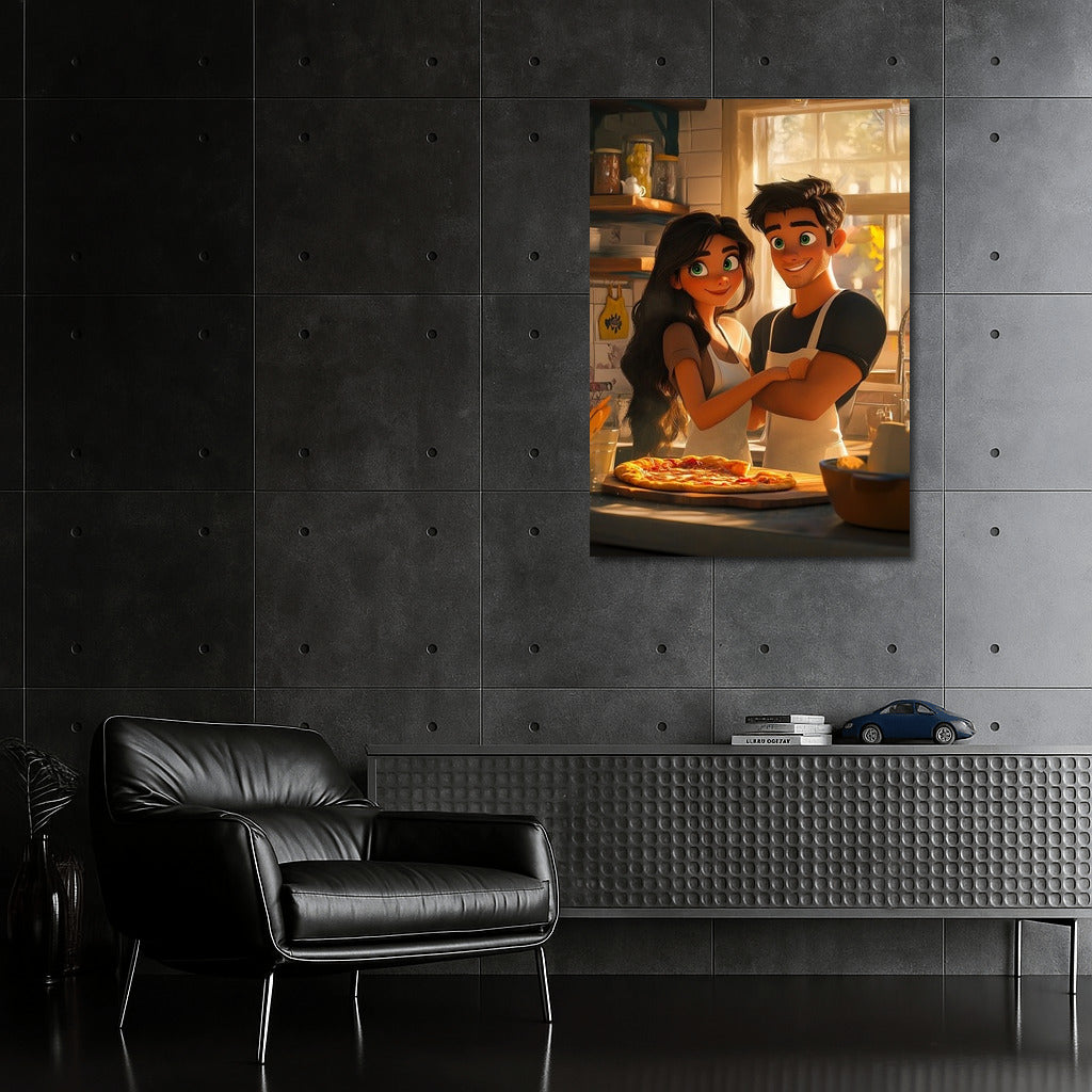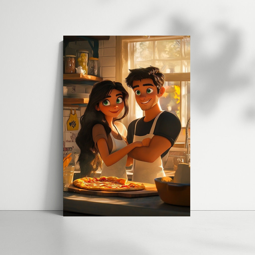 Love in every piece: This vibrant painting of a couple in a cozy kitchen will add a touch of tenderness to your wall art. See more from the collection: Cartoon Art