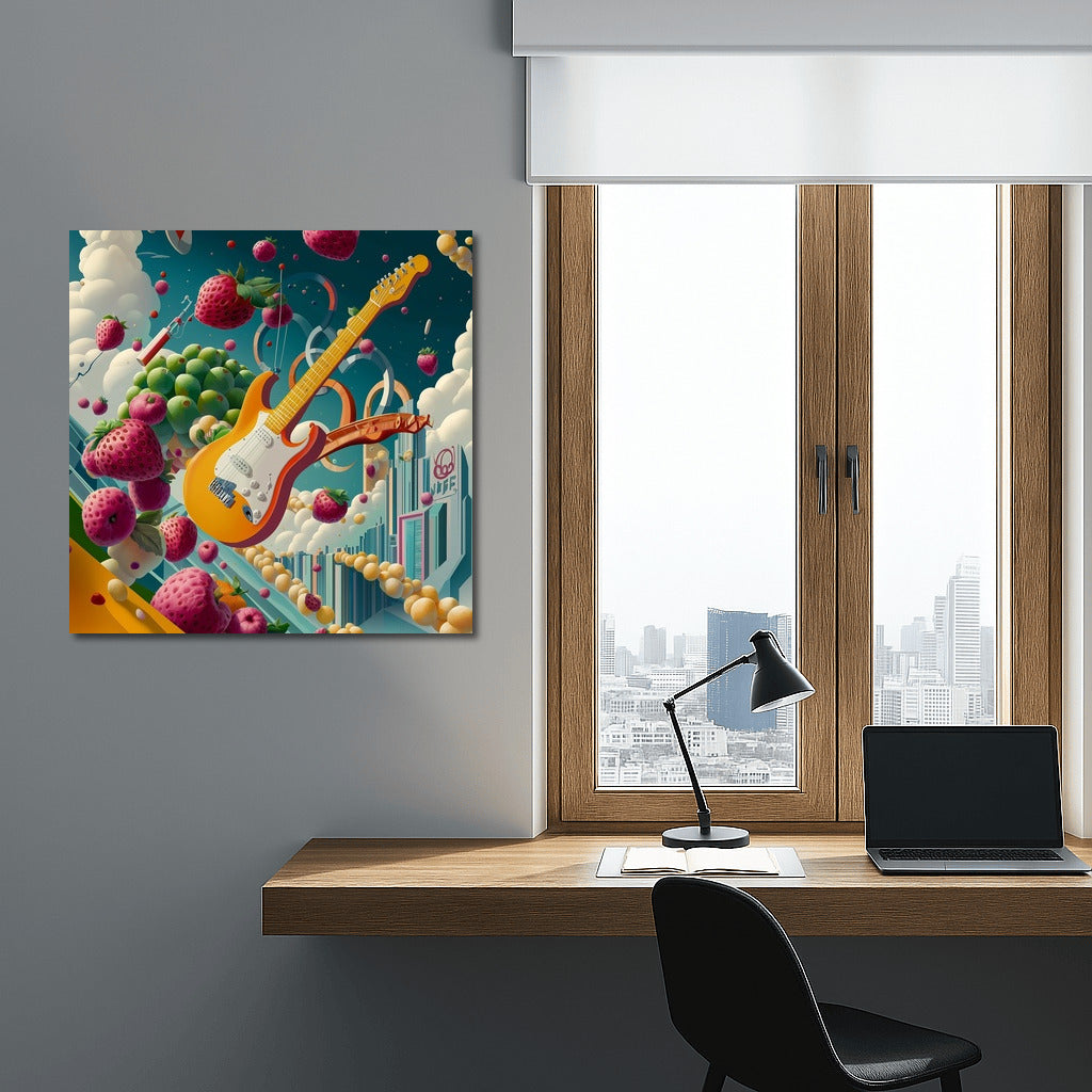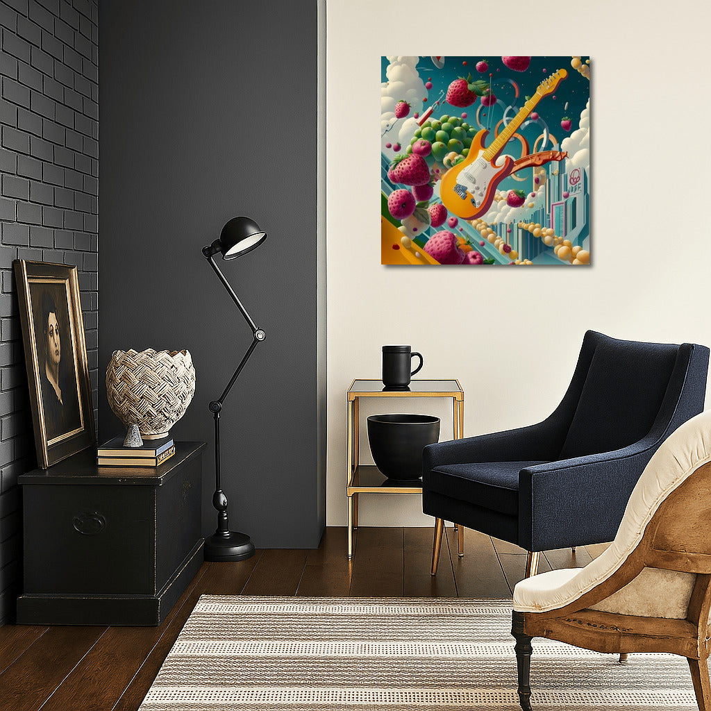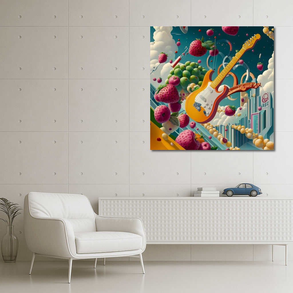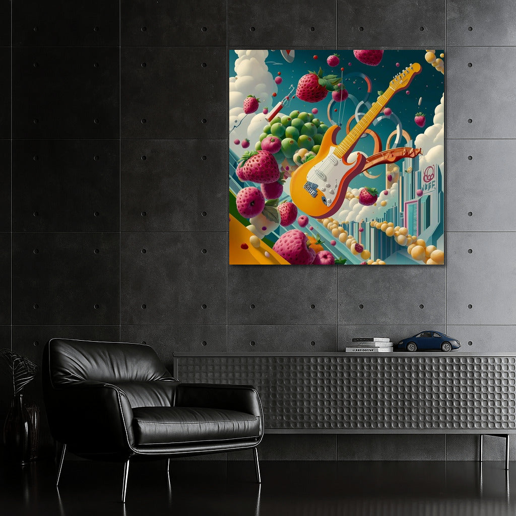 Flying guitars and berries in the sky. A bright poster for those who like to dive into the world of fantasy and color. Wall art of dreams! See more from the collection: Mixed Wall Art