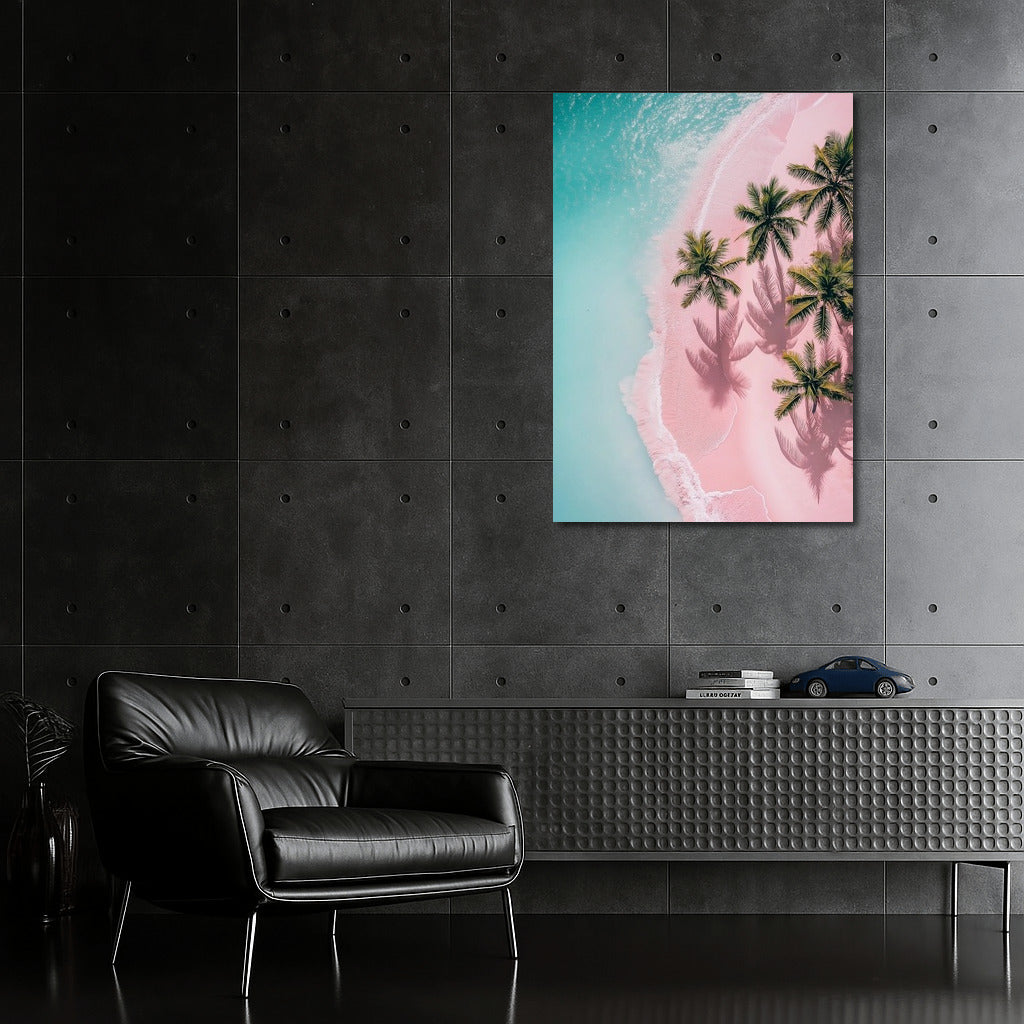 A tropical paradise on pink sand. This poster painting will bring freshness and dreaminess to any space. See more from the collection: Beaches, Oceans & Coastal Views Art
