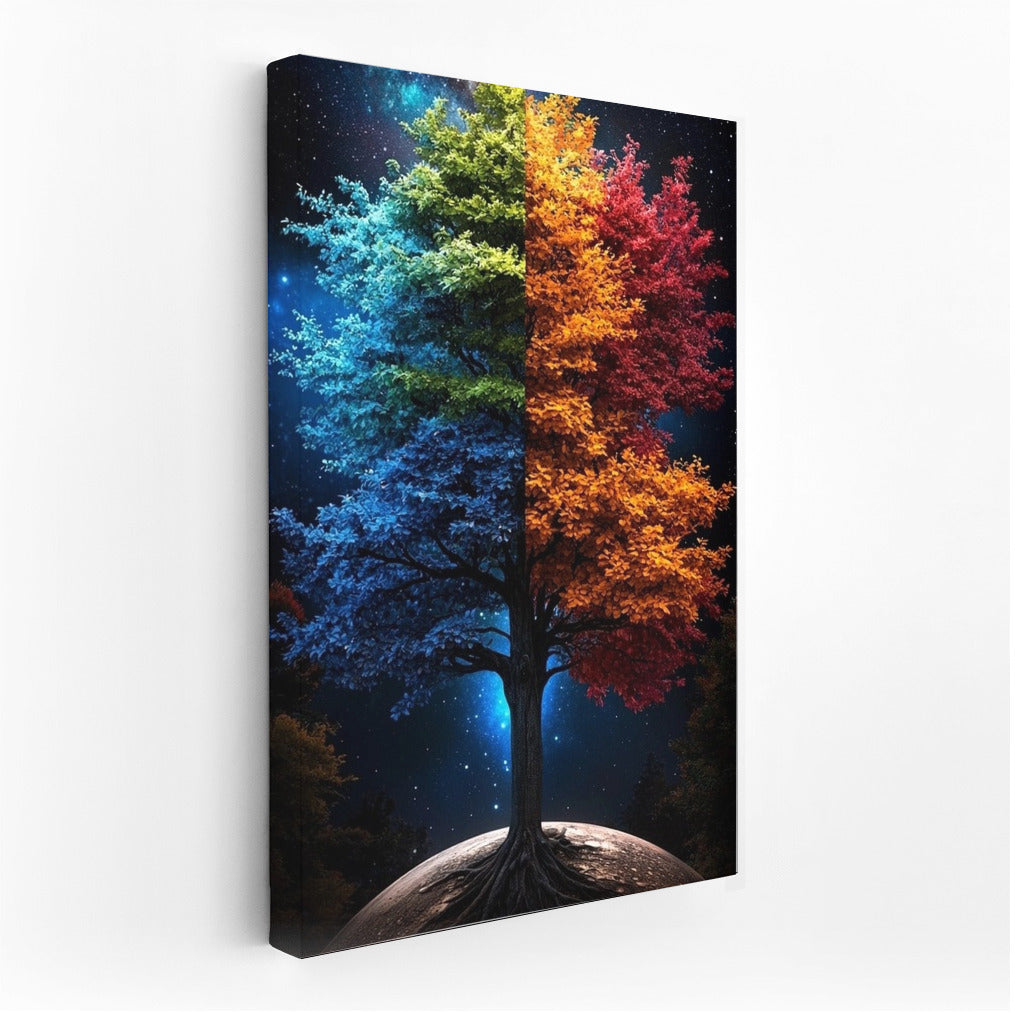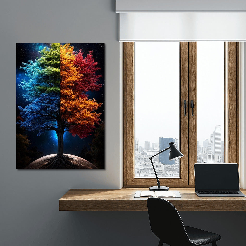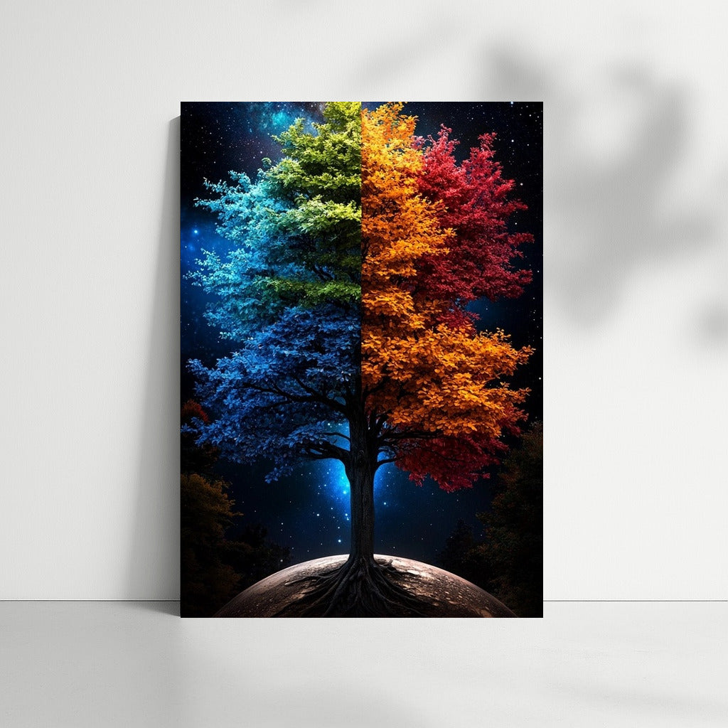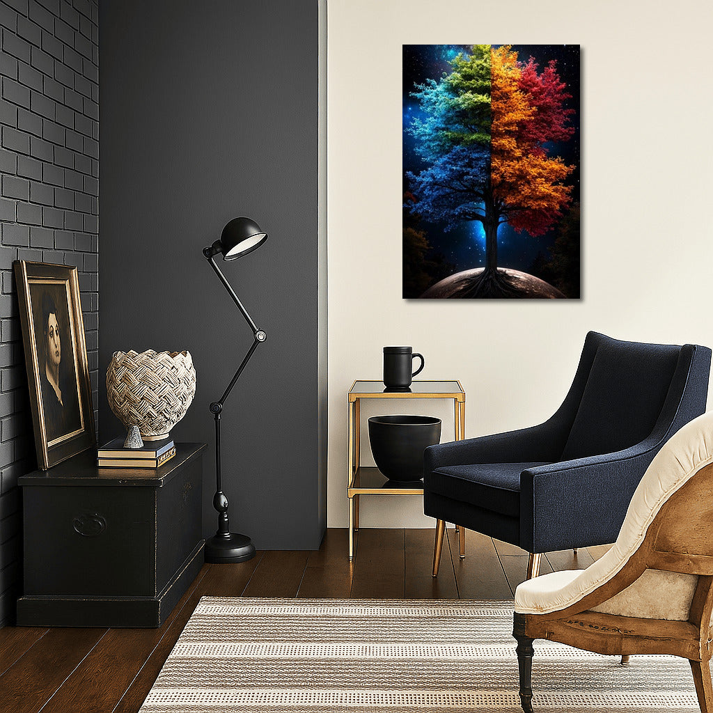 Two-faced world: Liven up your interior with a vibrant poster where a tree connects night and day, color and darkness. Wall art that inspires dreams. See more from the collection: Mixed Wall Art