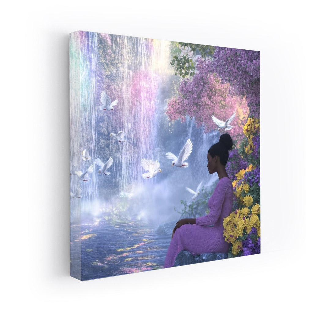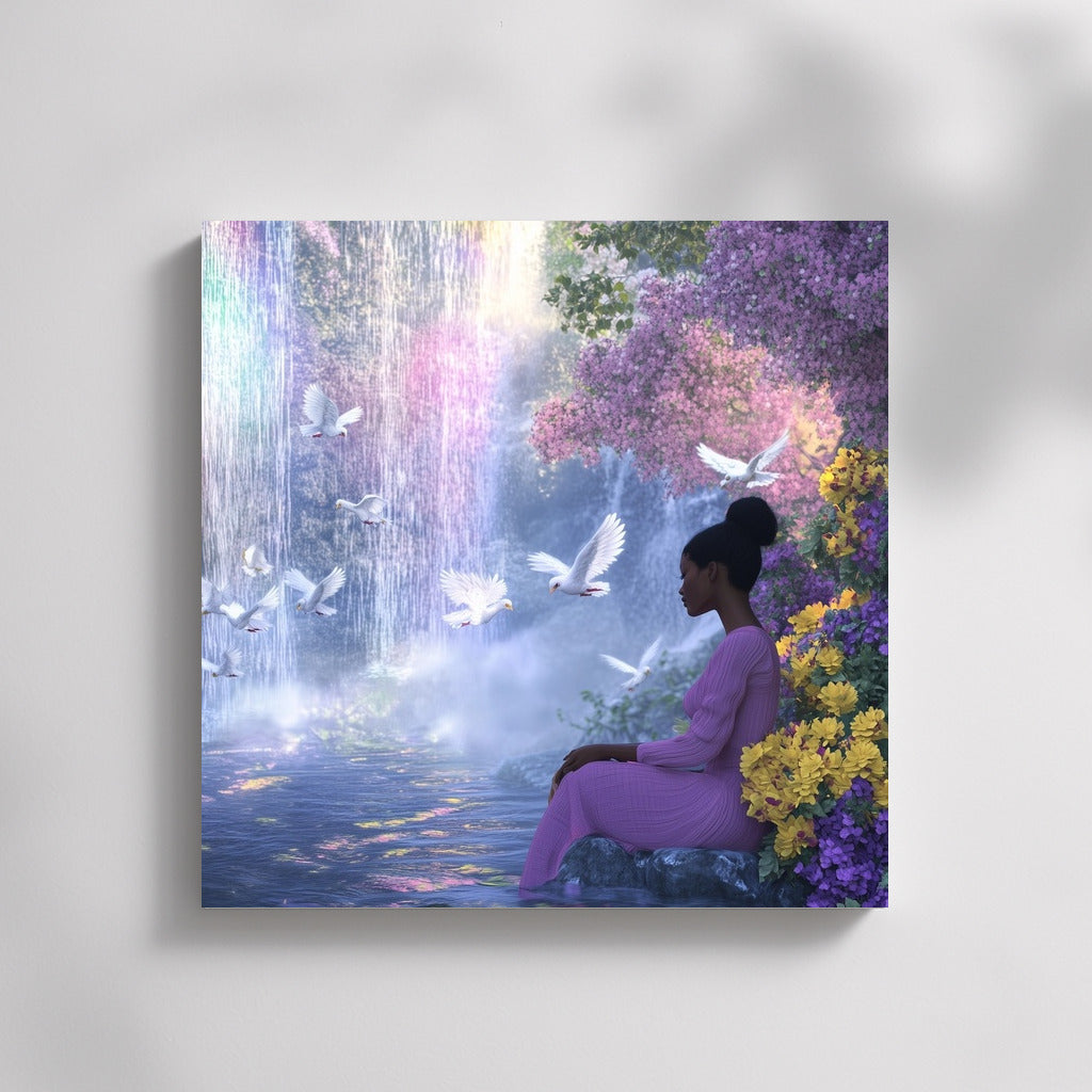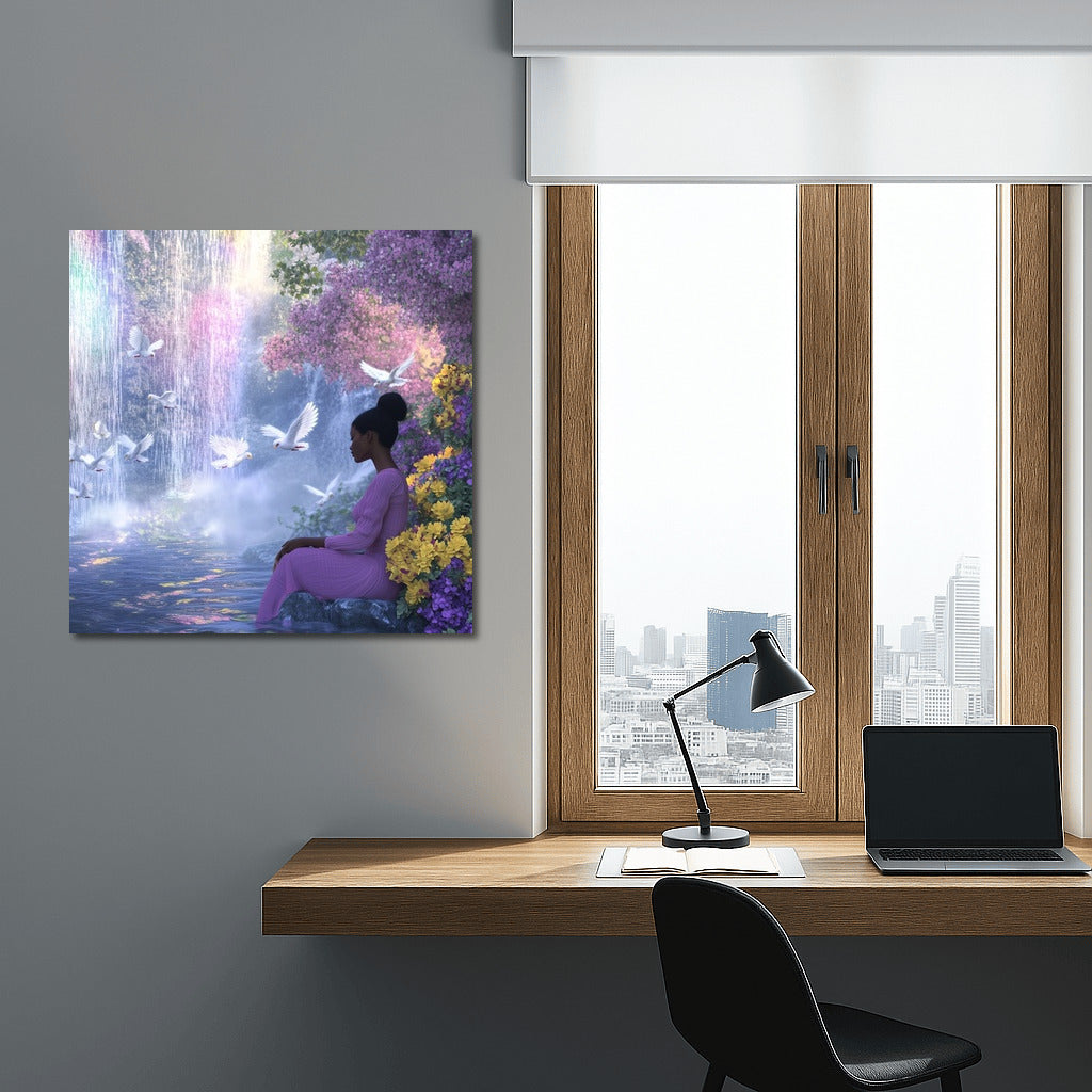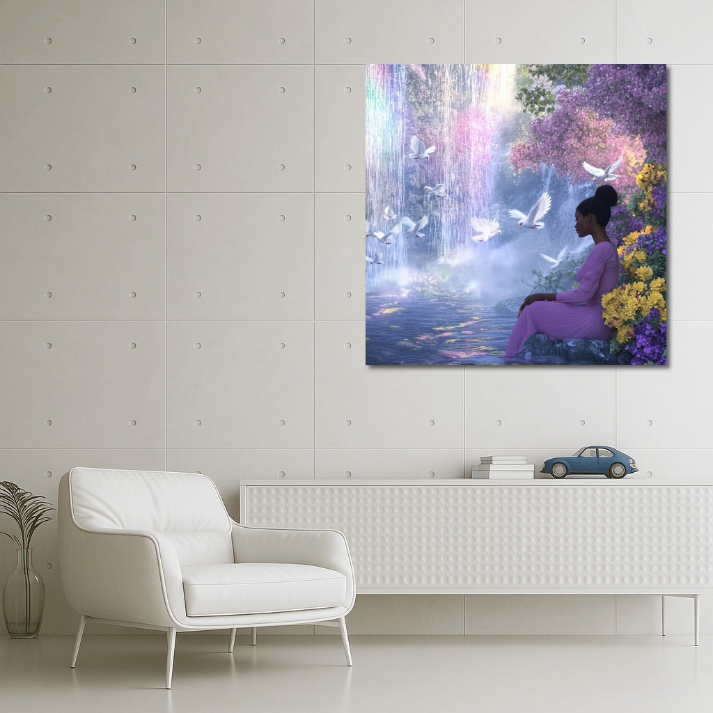 Magical poster: mesmerizing waterfall and aerial dance of birds. Enjoy the tranquility and beauty of wall art! See more from the collection: Mixed Wall Art