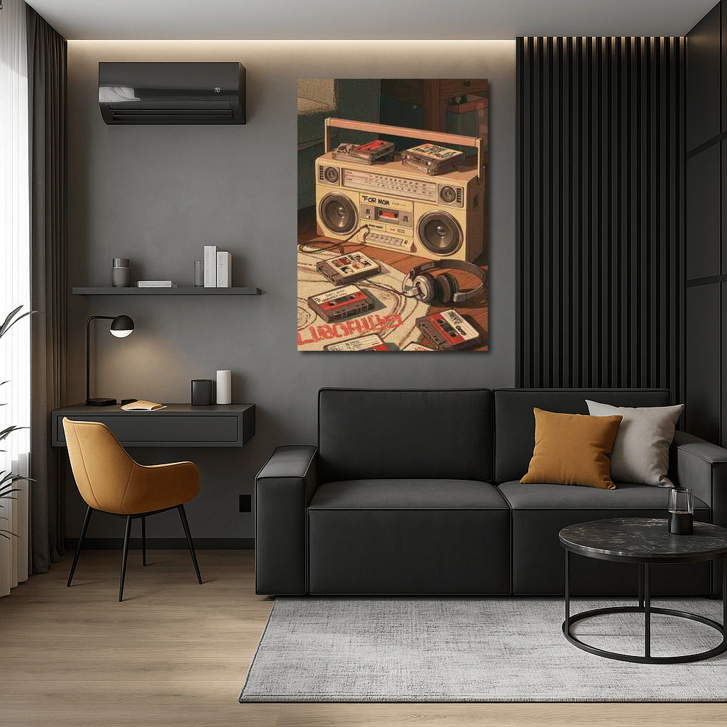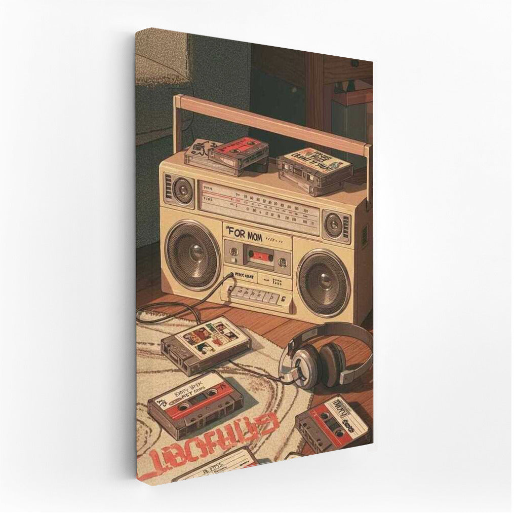 Dive into the nostalgia of the 90s with a retro poster: cassette tapes, a tape recorder and the cozy atmosphere of the past. Wall art of time. See more from the collection: Retro 90s & Nostalgia Art