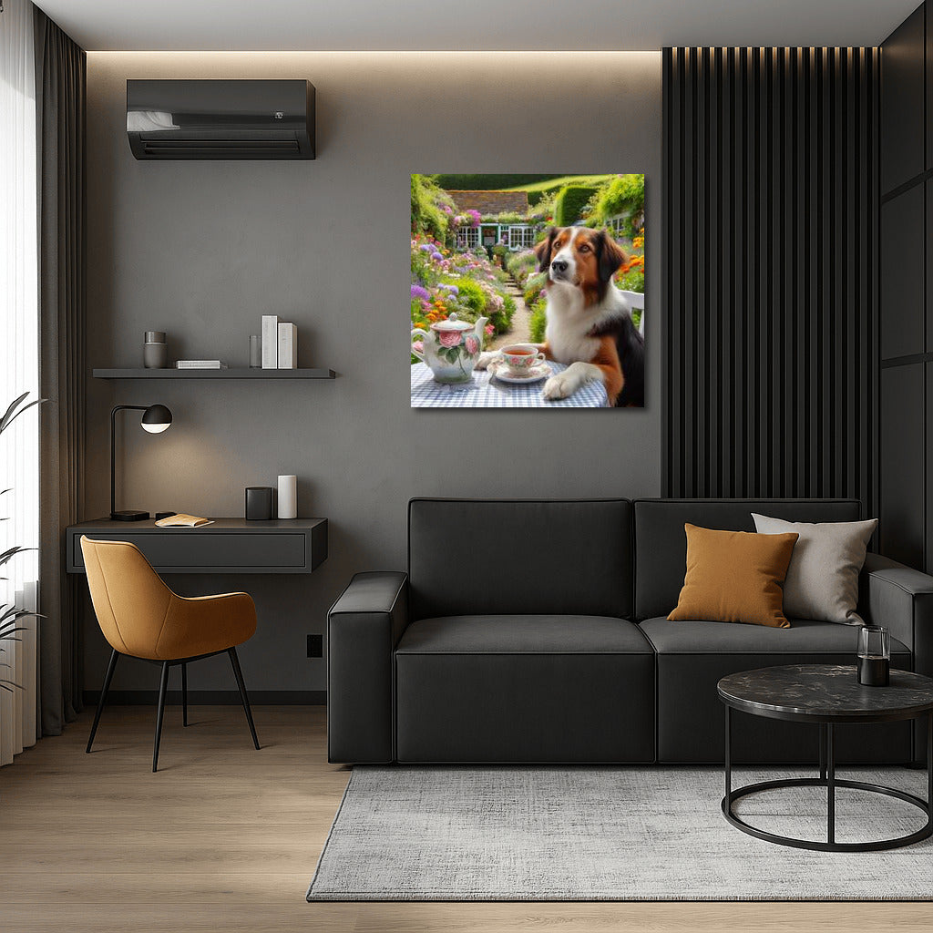 A gentle poster for nature lovers: a dog in a blooming garden, a tea set - bring coziness and beauty to your wall art. See more from the collection: Animals Art