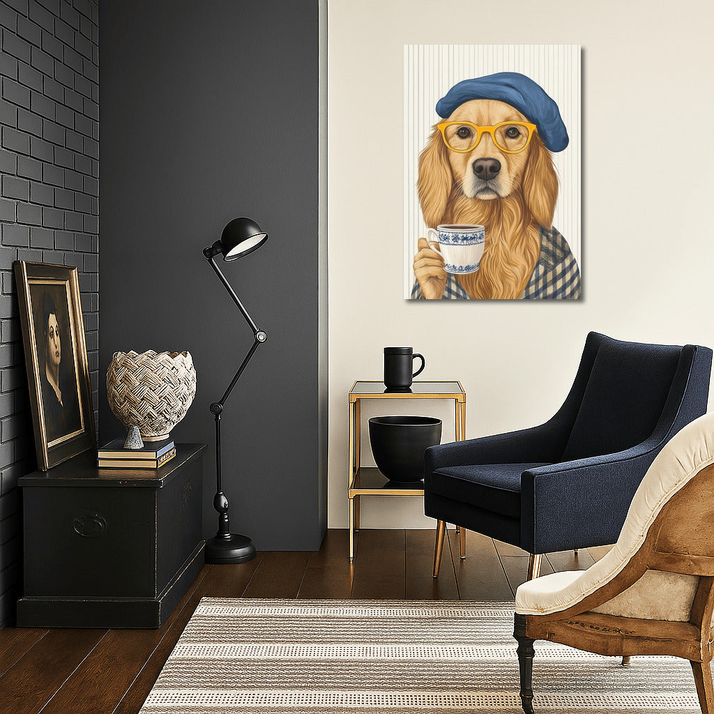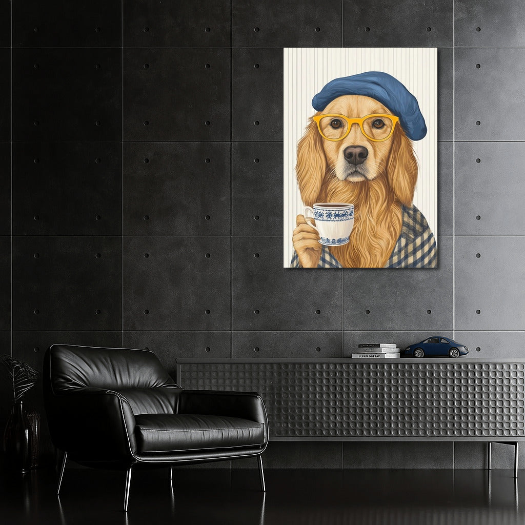 Adorable poster: a stylish dog in a beret and glasses with a cup of tea will add coziness to your wall art. See more from the collection: Golden Retriever Art