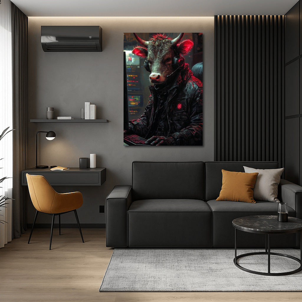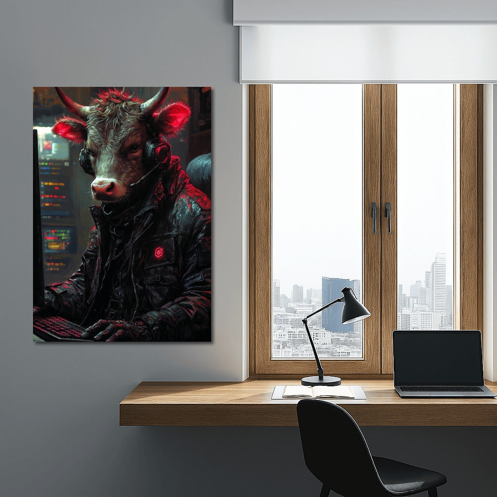 Cyber Bull at Work: A Futuristic Poster for Fans of Unusual Wall Art. Be transported to the world of technology and fantasy! See more from the collection: Cryptocurrency Art