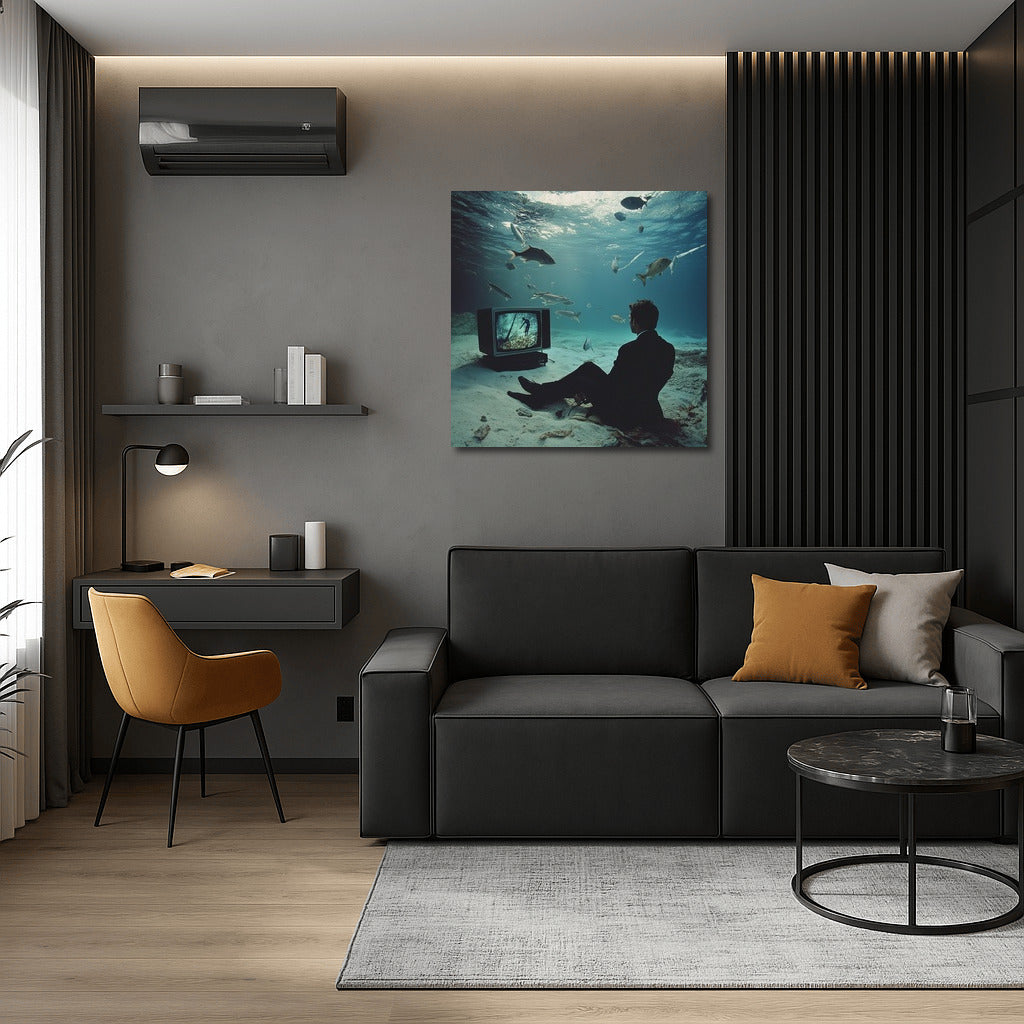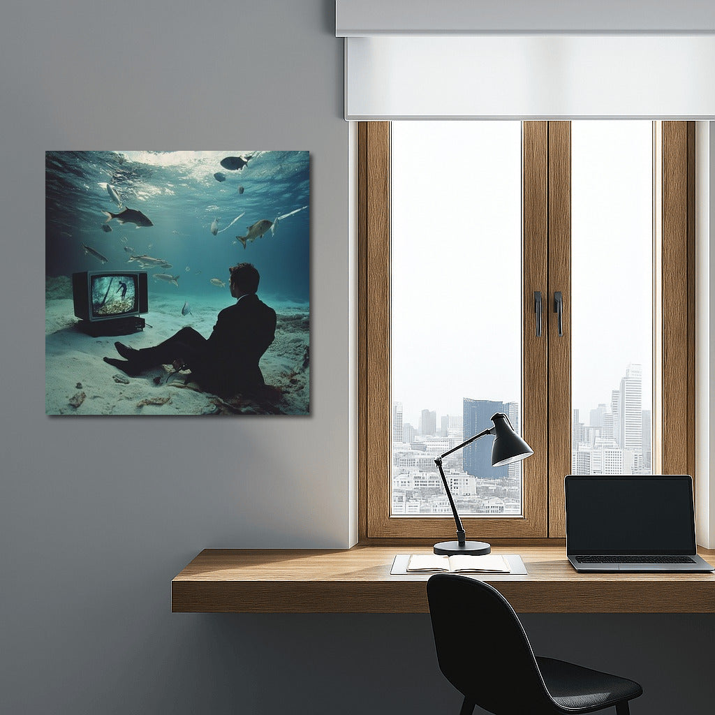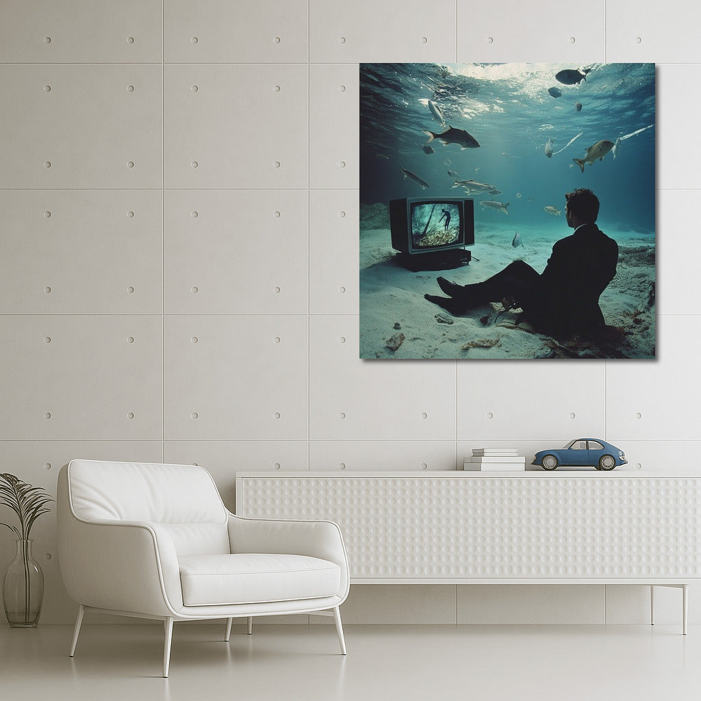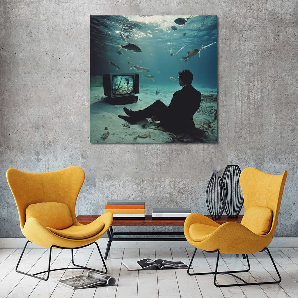 Dive into a world of surrealism: a mysterious figure among fish and an old TV create unique wall art. See more from the collection: Mixed Wall Art