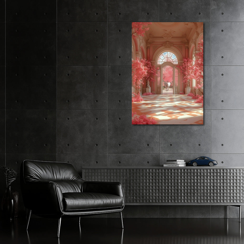 Romantic Wall Art: Majestic Pink Hall with Blooming Trees. Open the Doors to Dreams with This Painting! See more from the collection: Mixed Wall Art