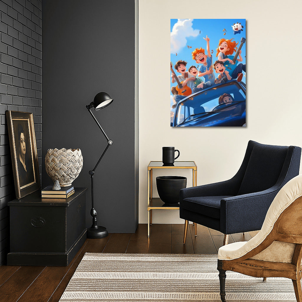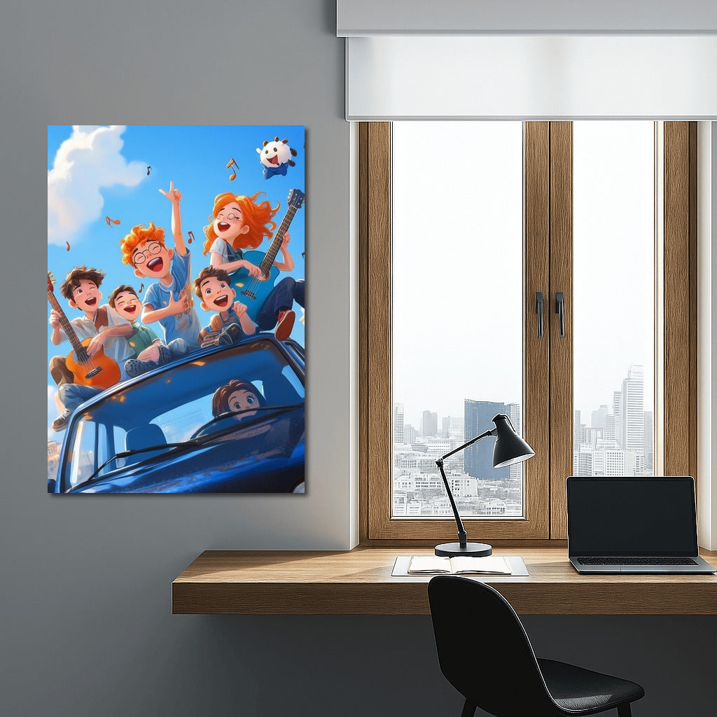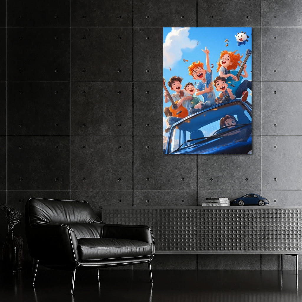 Fun and music on the hood! Bright poster with smiling children and tools for your interior. Dream wall art. See more from the collection: Cartoon Art