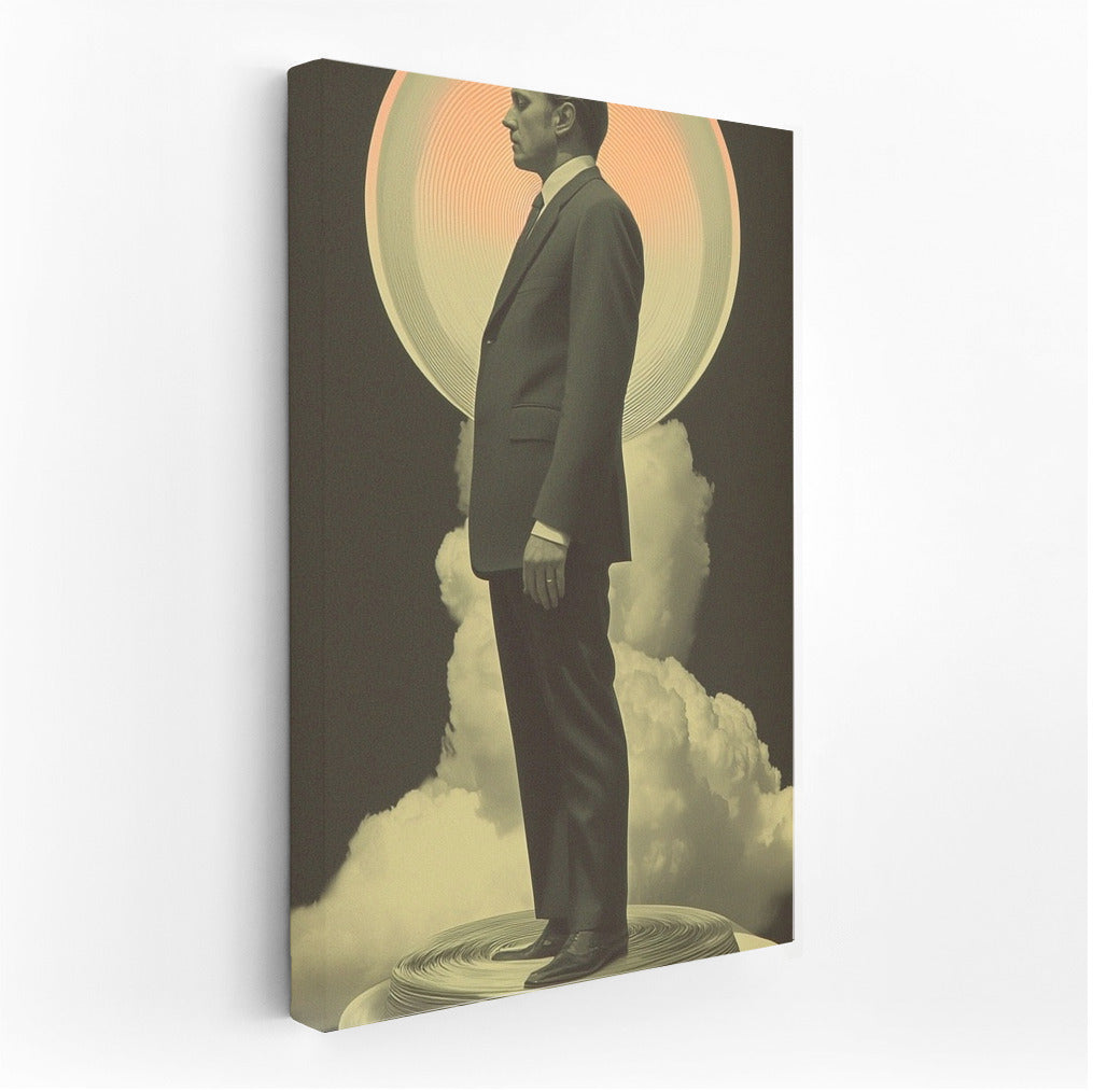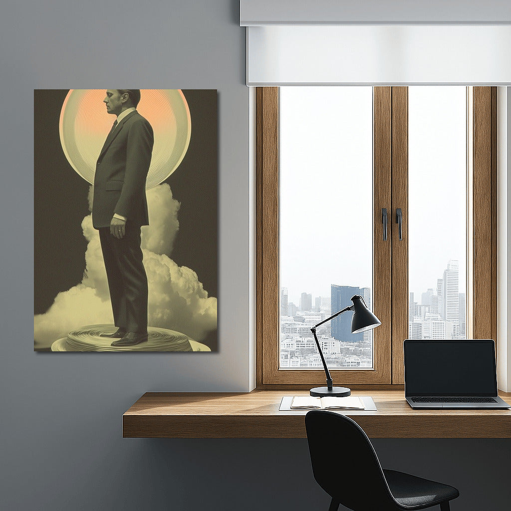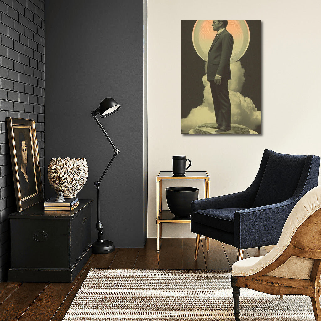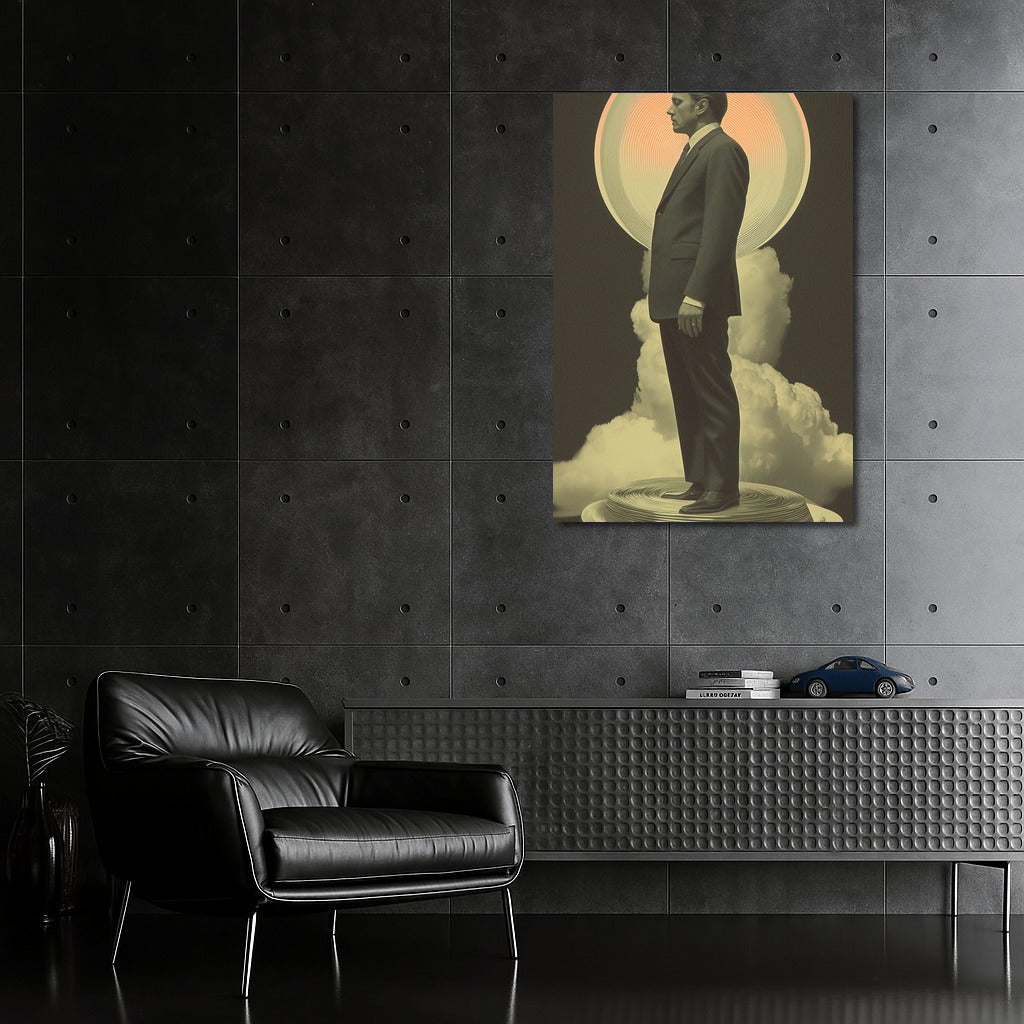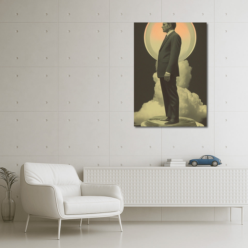 Wall art: silhouette in a classic suit among clouds, surrounded by a shining halo. A poster that inspires dreams. See more from the collection: Surreal Art