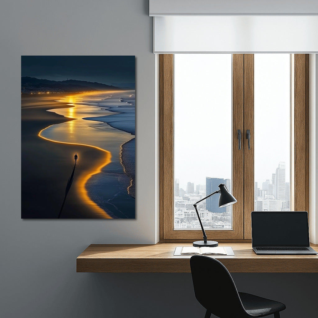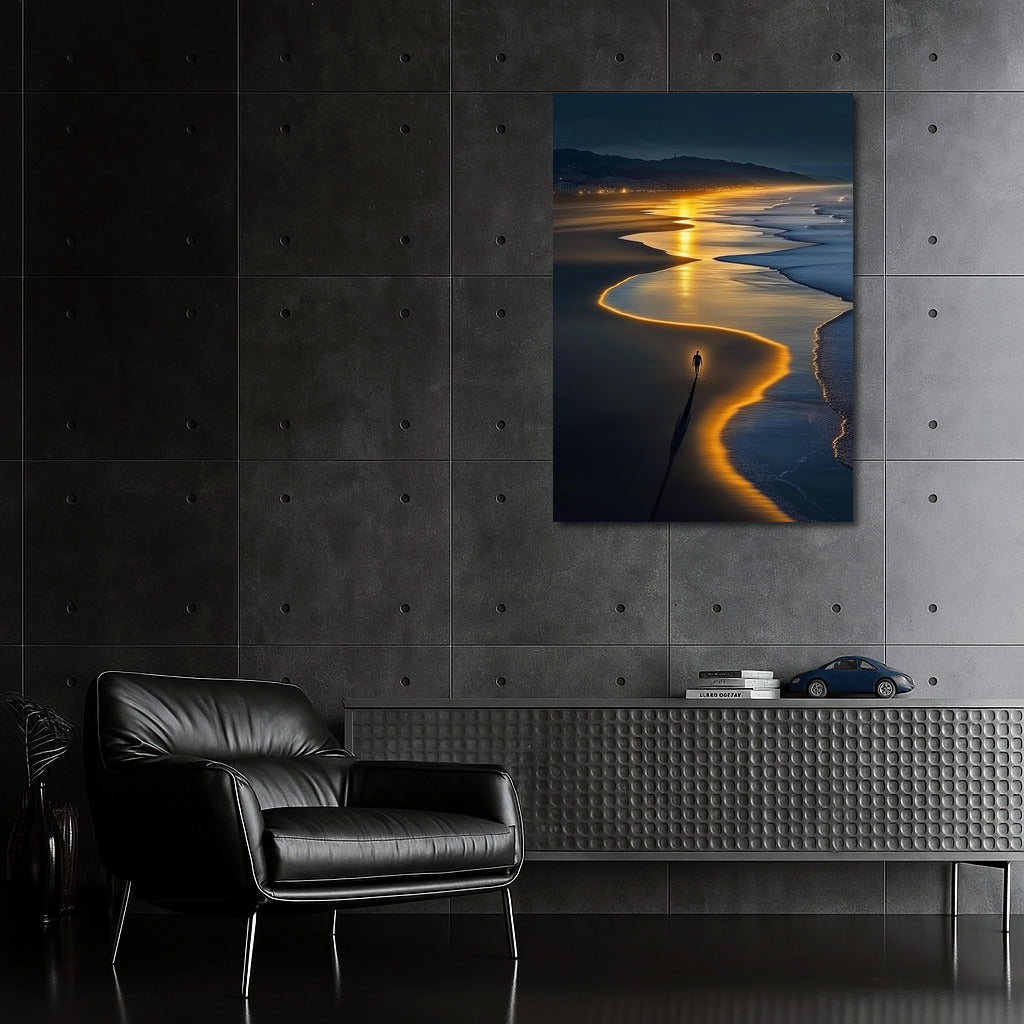 A poster of a lonely figure on a shining shore. The magic of light and shadow brings nature and silence to life in this wall art. See more from the collection: Beaches, Oceans & Coastal Views Art