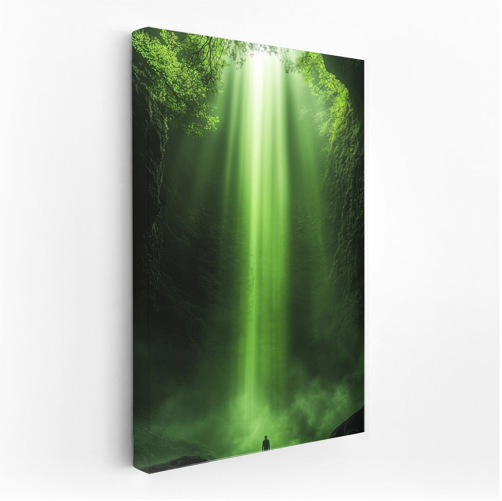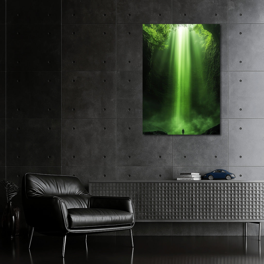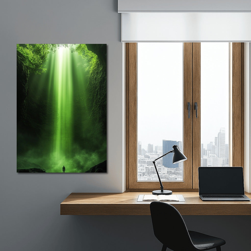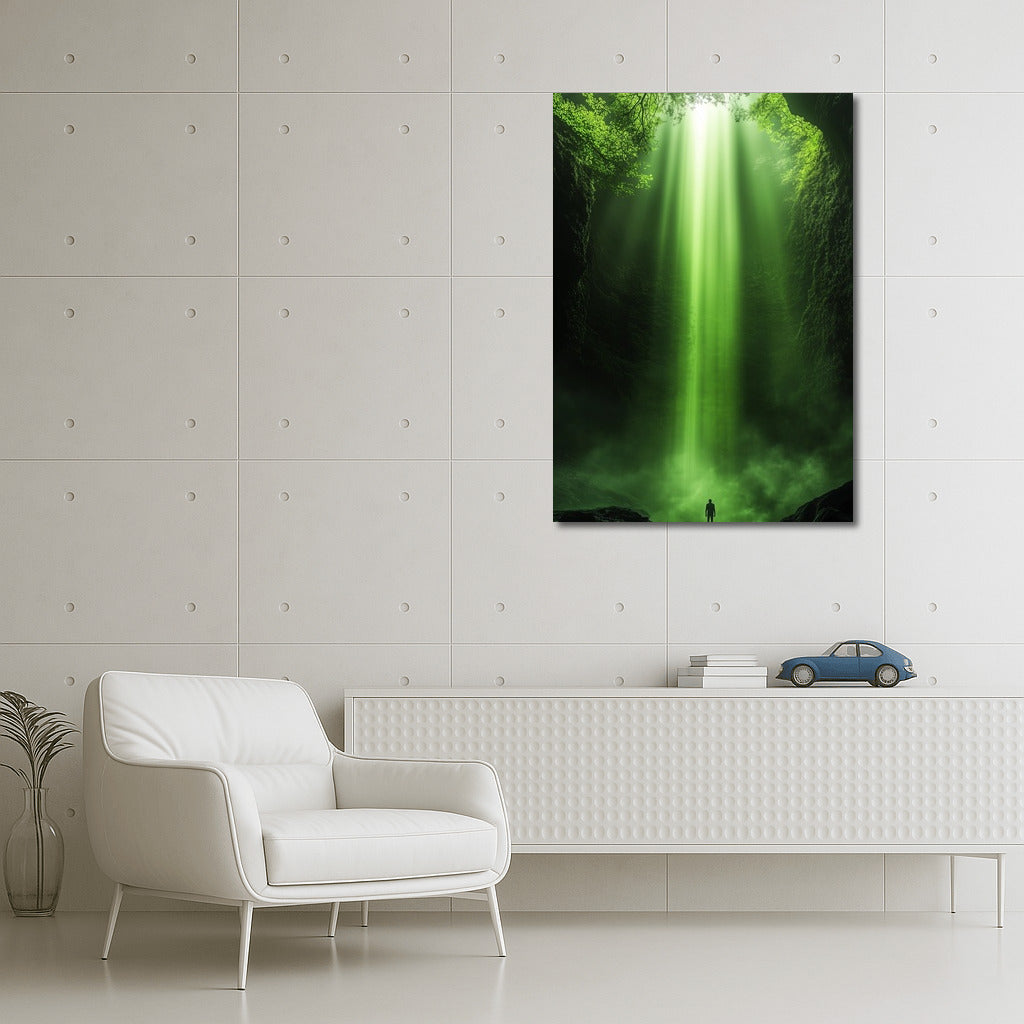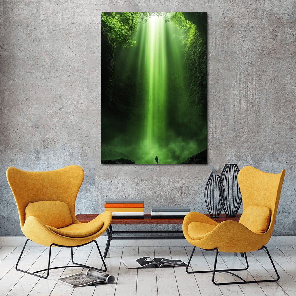 Mysterious poster: man in green forest under rays of light. Wall art that brings space to life with natural magic. ?✨ See more from the collection: Mixed Wall Art