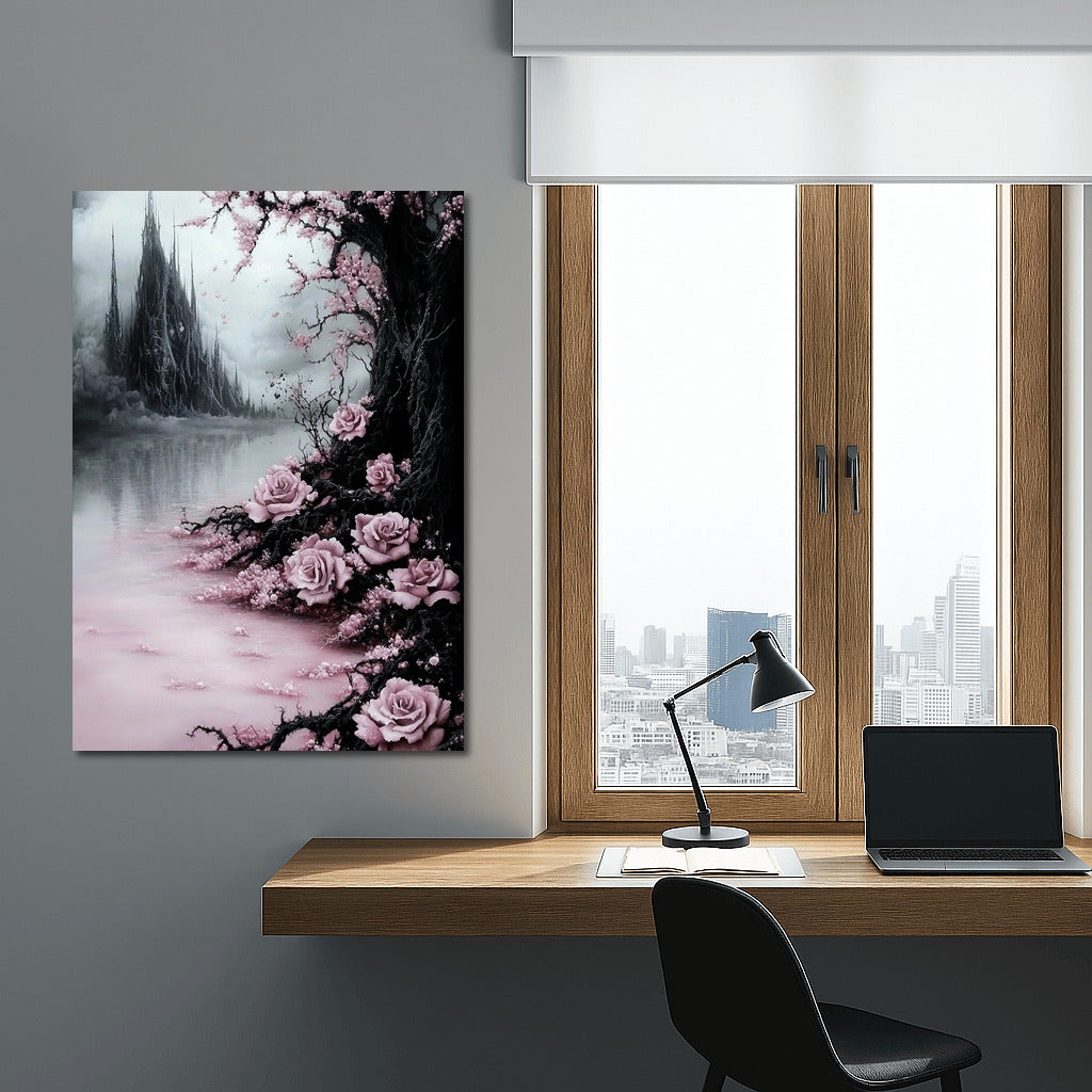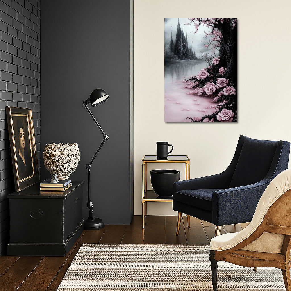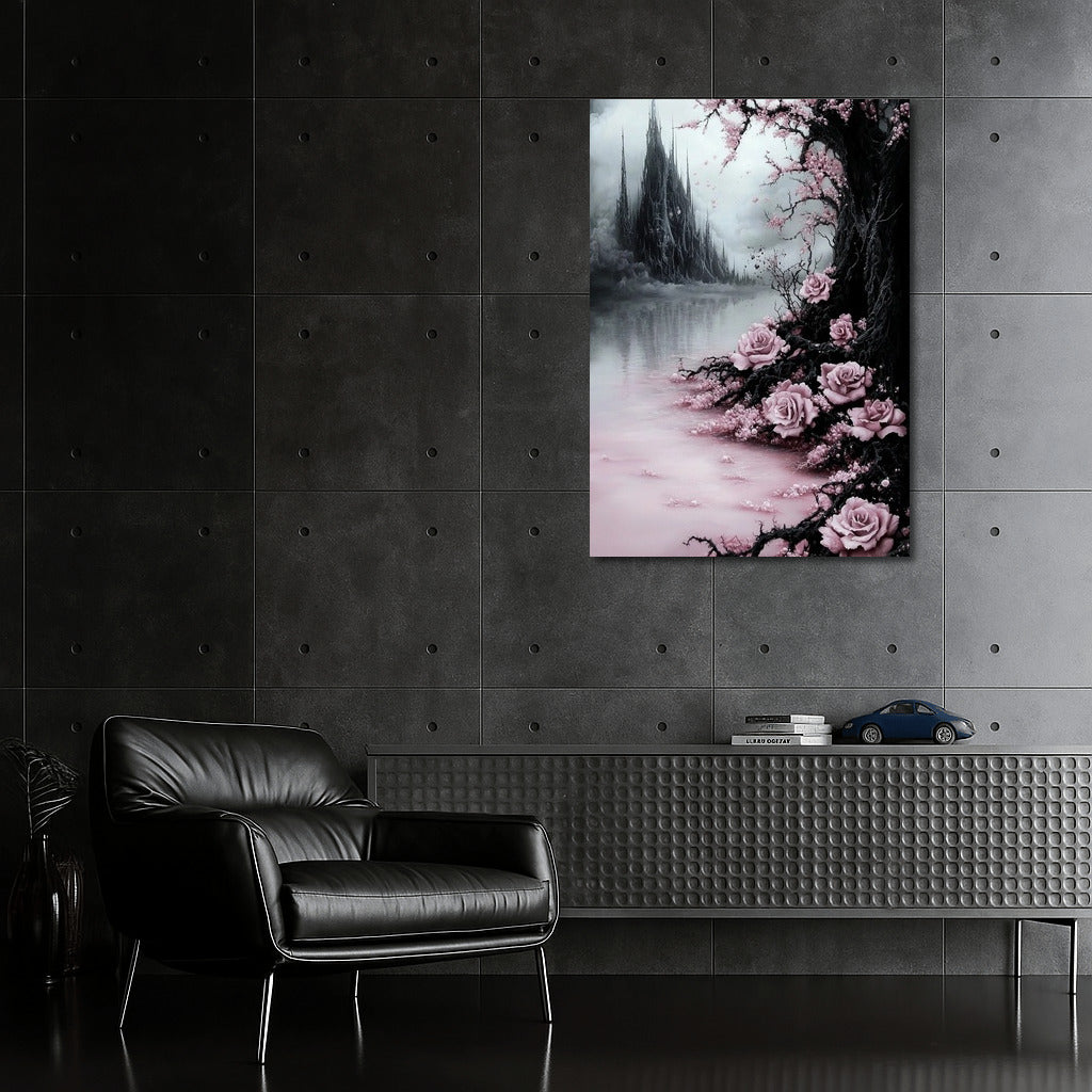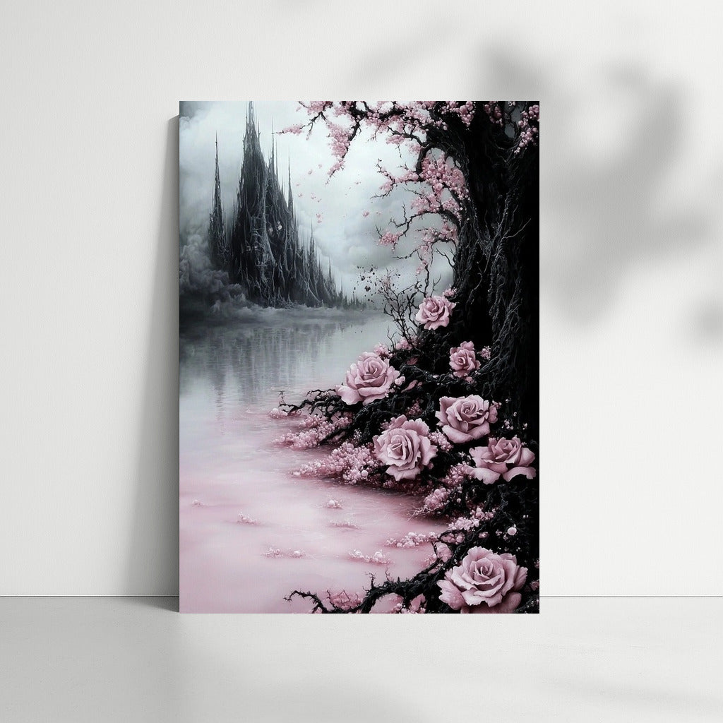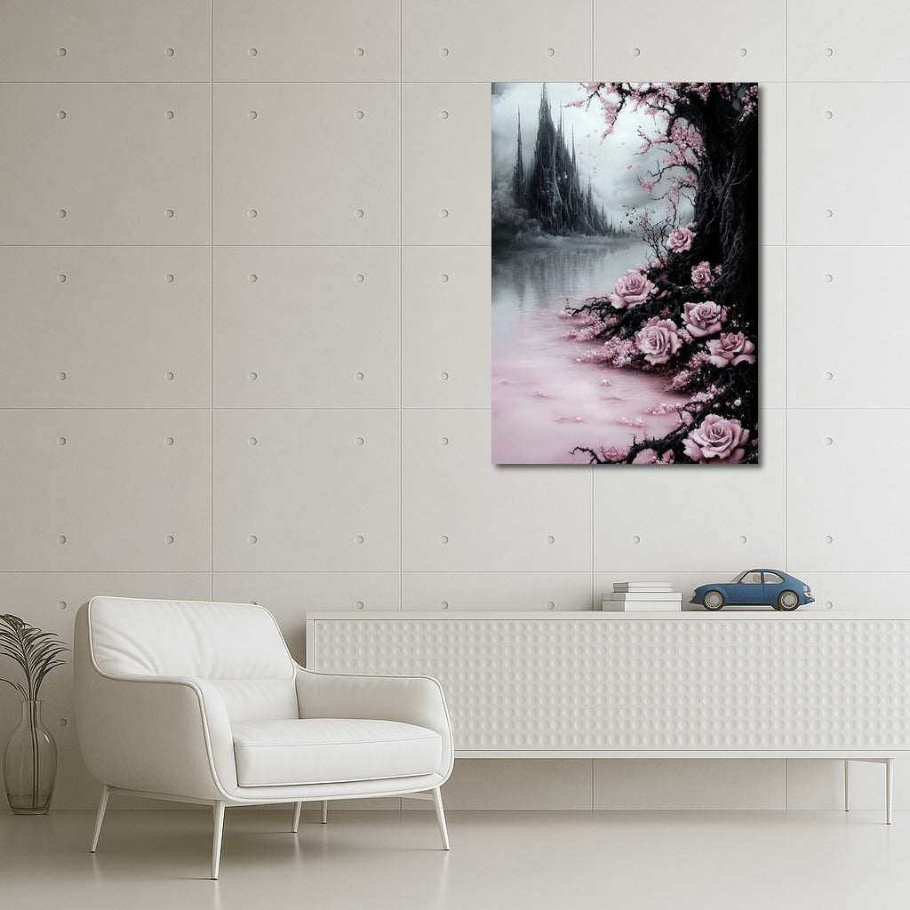 Mysterious castle and pink flowers on the fog background. This painting turns dreams into reality. Wall art for inspiration. See more from the collection: Mixed Wall Art