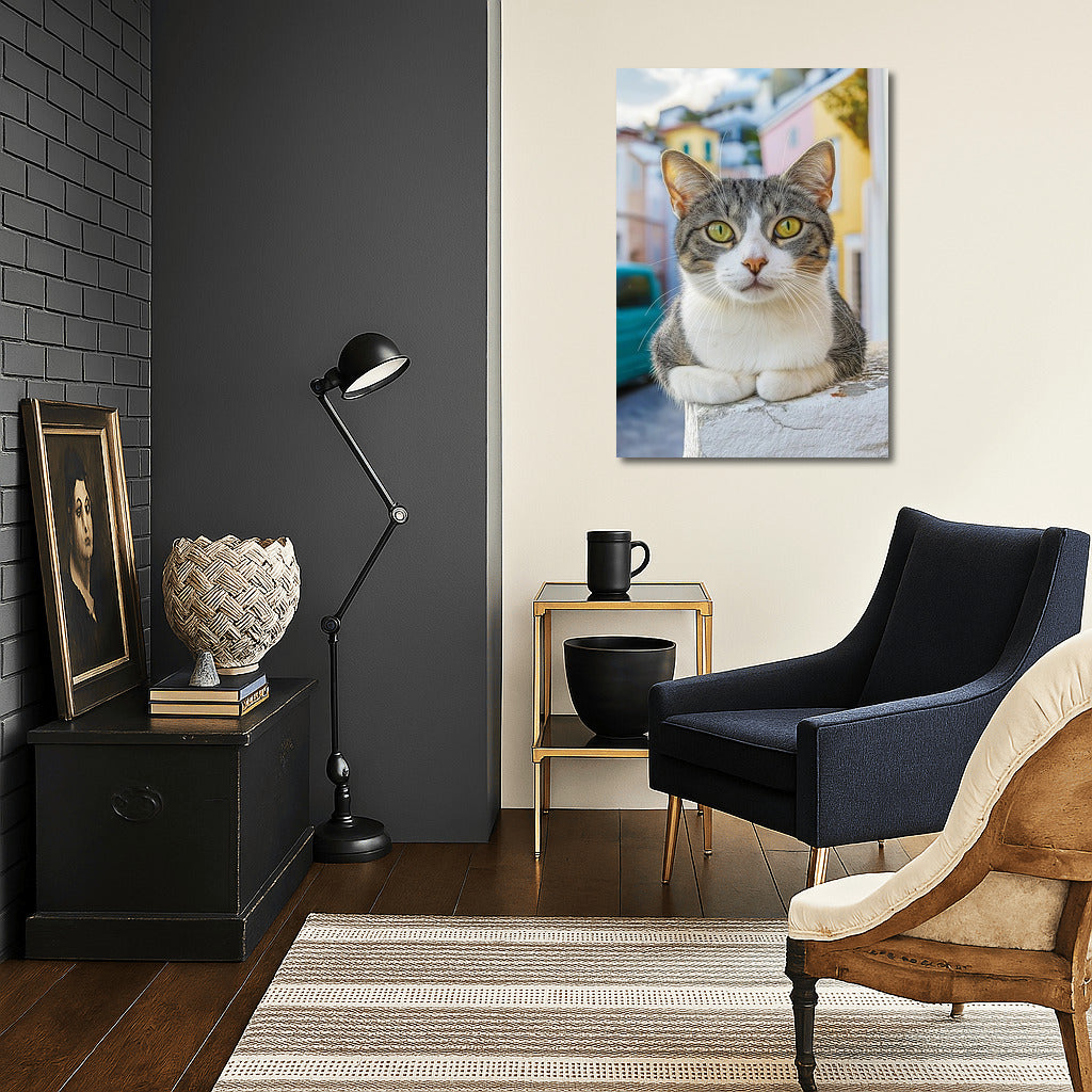 A bright poster with a charming cat against the background of colorful houses. Wall art for lovers of coziness and harmony in the interior. See more from the collection: Animals Art