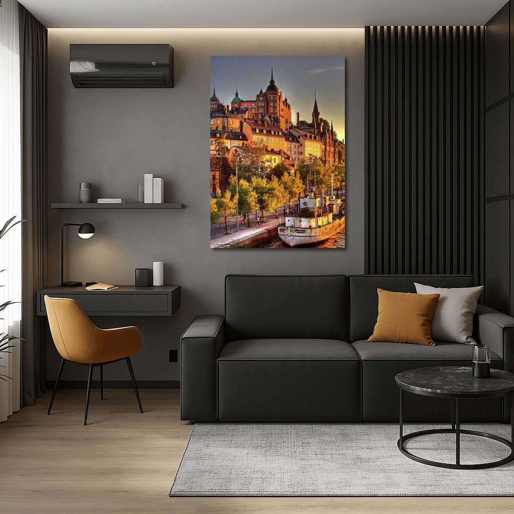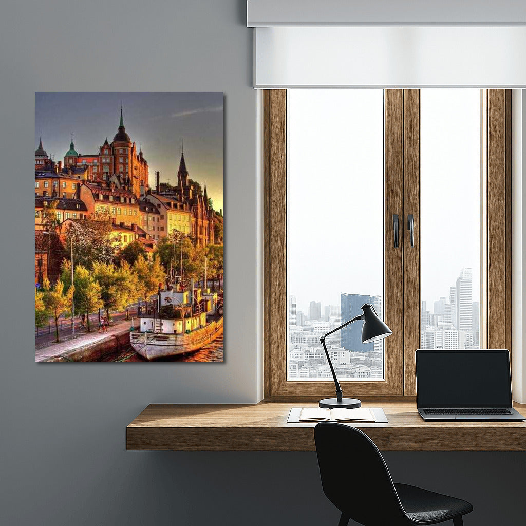 Capture the spirit of Sweden: the warm light of the old streets and charming buildings in this painting. Perfect wall art! See more from the collection: Country Art