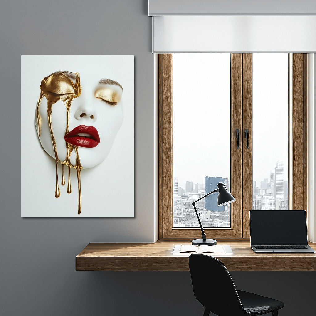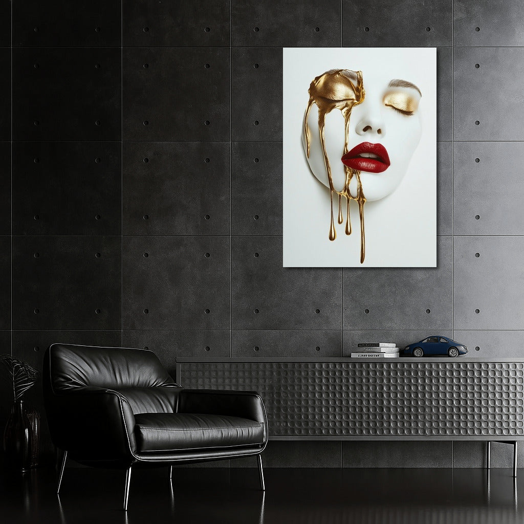 The golden glow and velvet lips on the painting create a magical effect. Modern wall art for a bold interior. See more from the collection: Mixed Wall Art