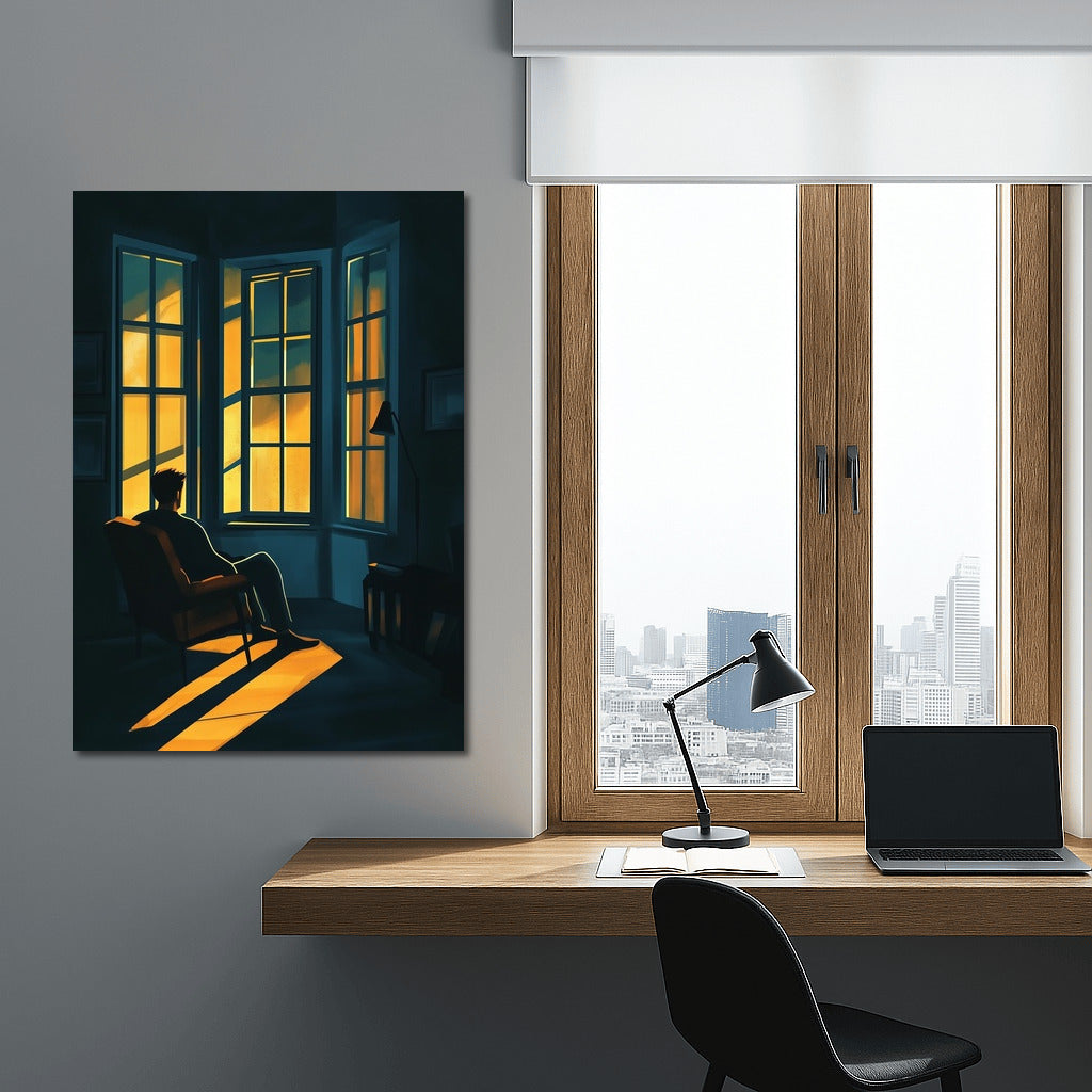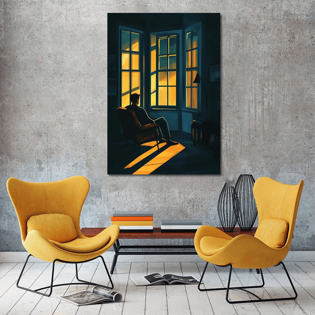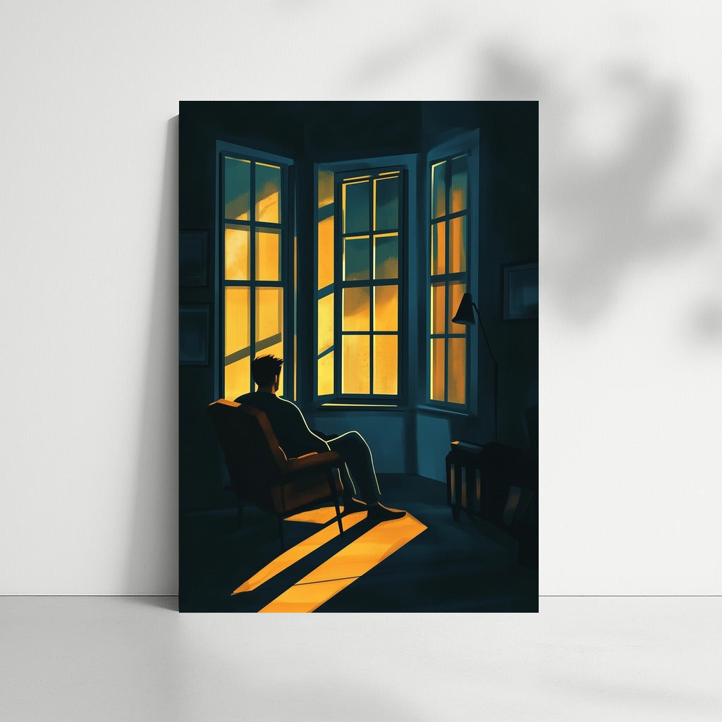 Mysterious wall art: a figure in a chair, lost in thought in the warm light of the sunset. The perfect accent for the interior. See more from the collection: Mixed Wall Art