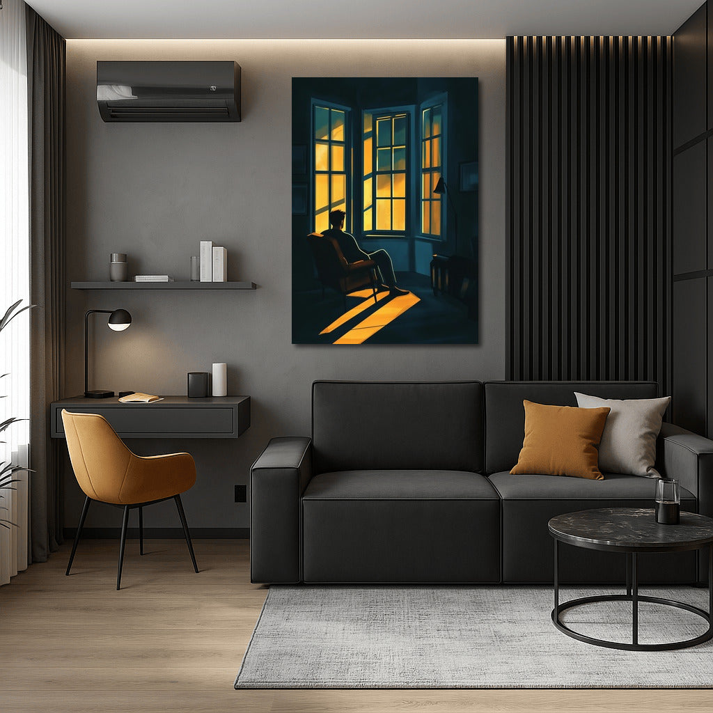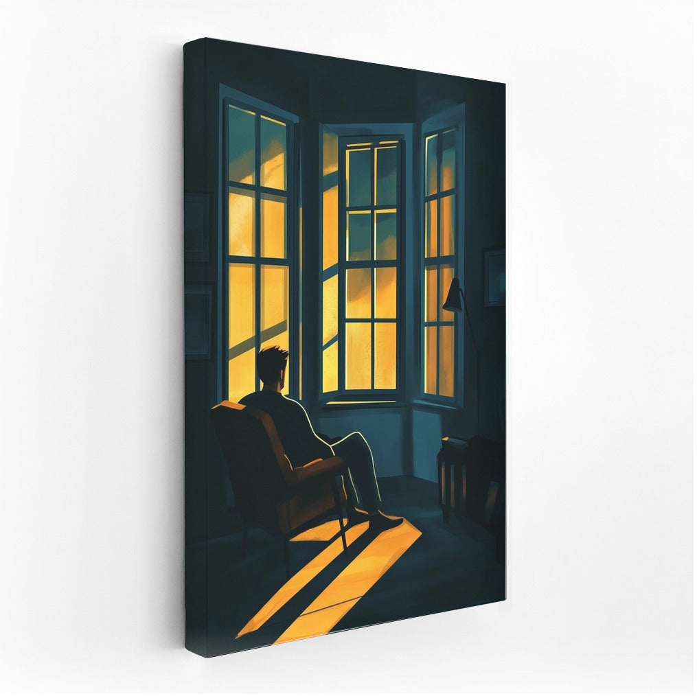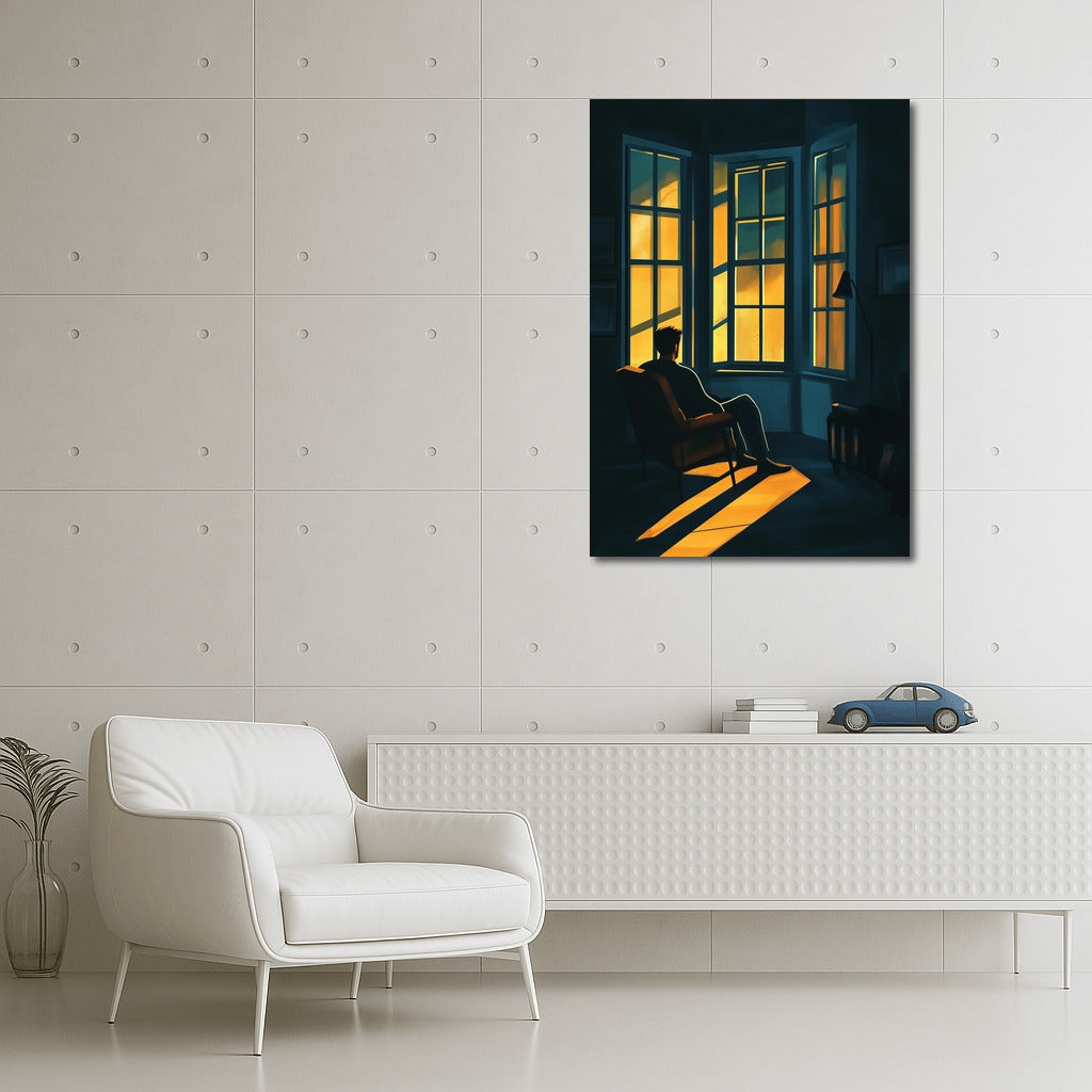 Mysterious wall art: a figure in a chair, lost in thought in the warm light of the sunset. The perfect accent for the interior. See more from the collection: Mixed Wall Art