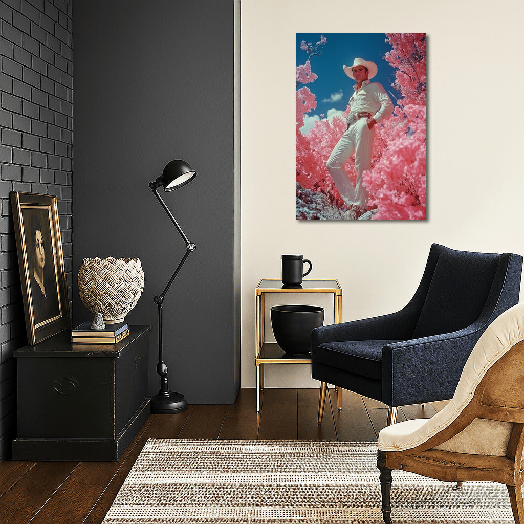 Stylish cowboy among pink trees. This bright poster will become a spectacular accent of wall art of your interior. See more from the collection: Mixed Wall Art