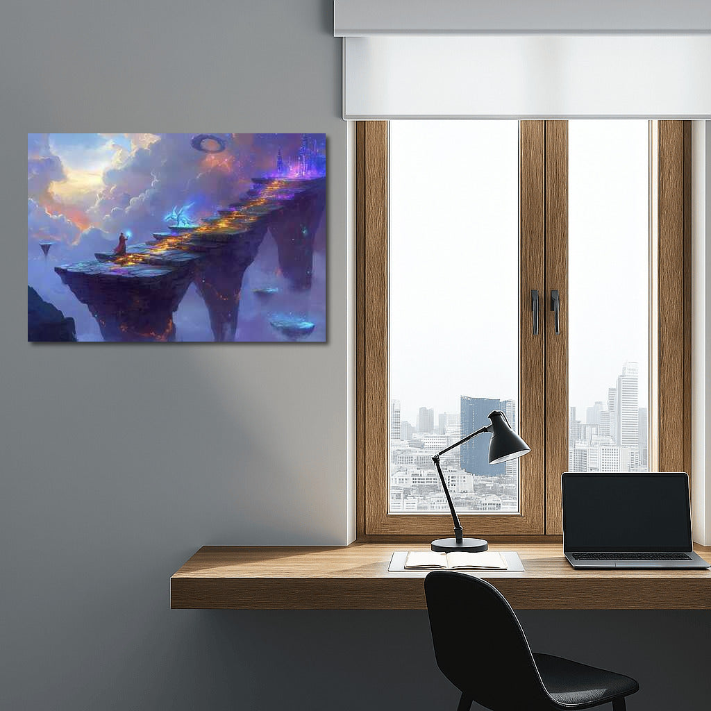 Immerse yourself in a fantasy world with this painting: a mysterious figure and a dragon on their way to a magical castle among the clouds in the sky. See more from the collection: Fantasy Art