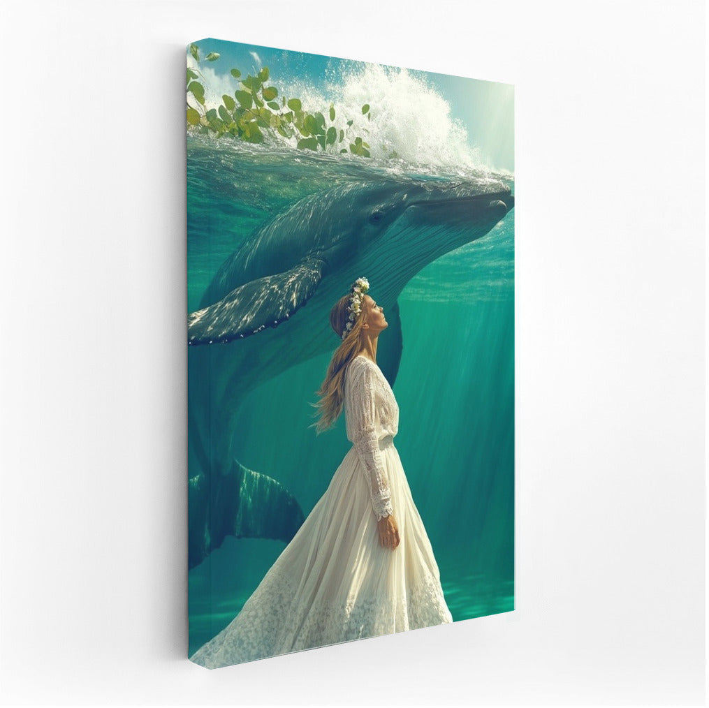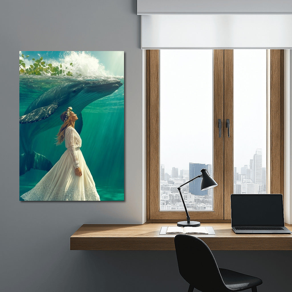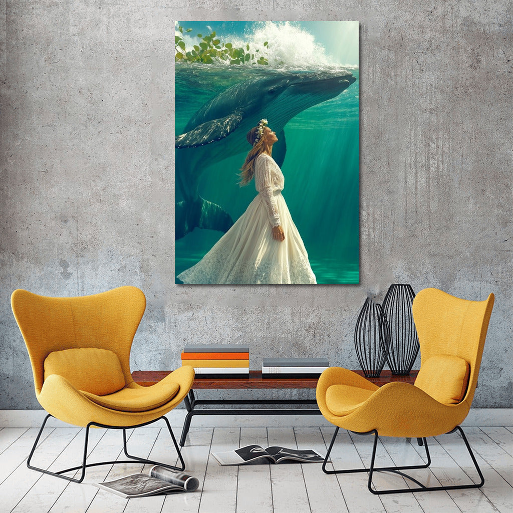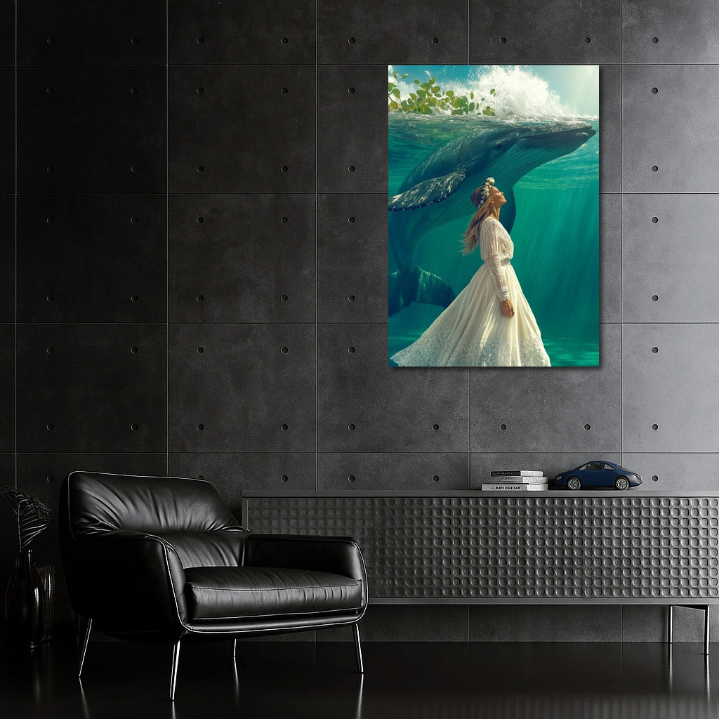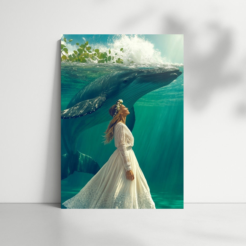 Dreamy painting: girl in white dress with whale behind her. Turn your wall into magic with this amazing poster! See more from the collection: Mixed Wall Art