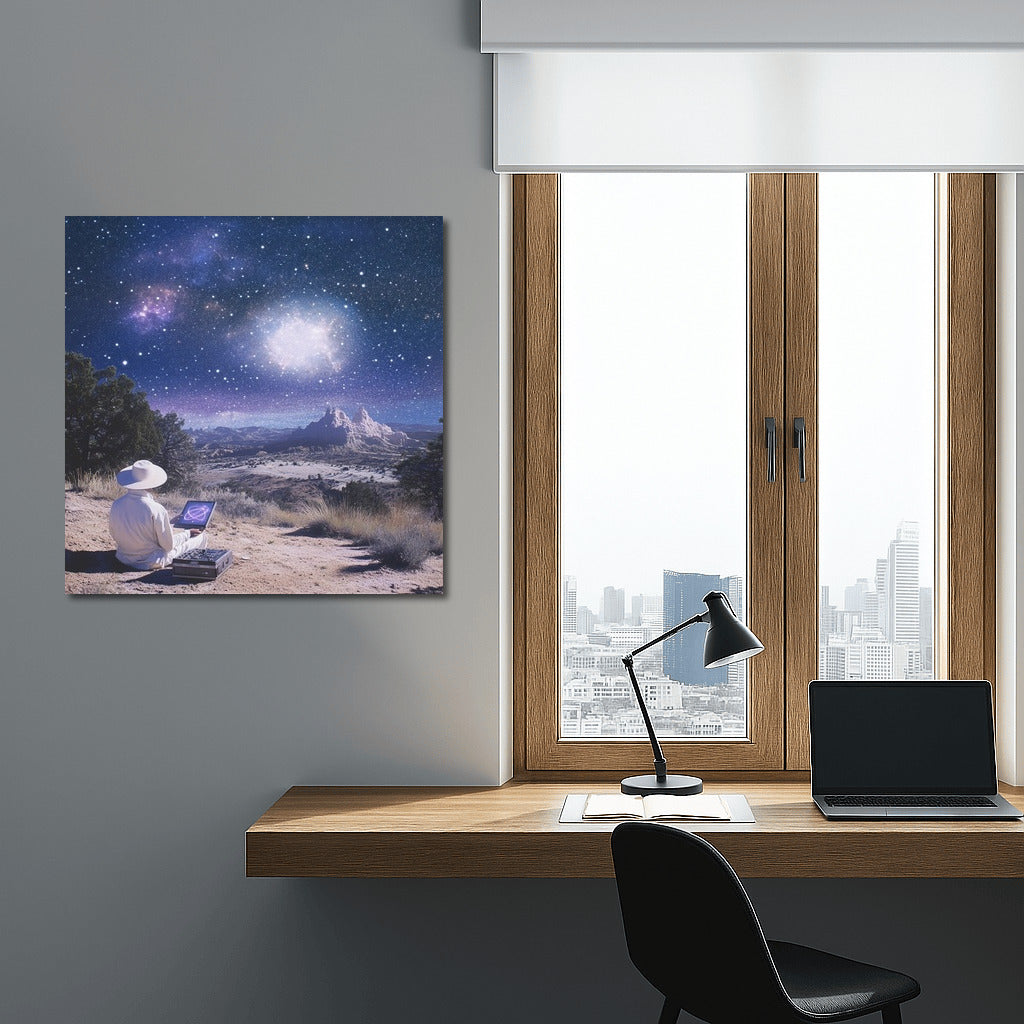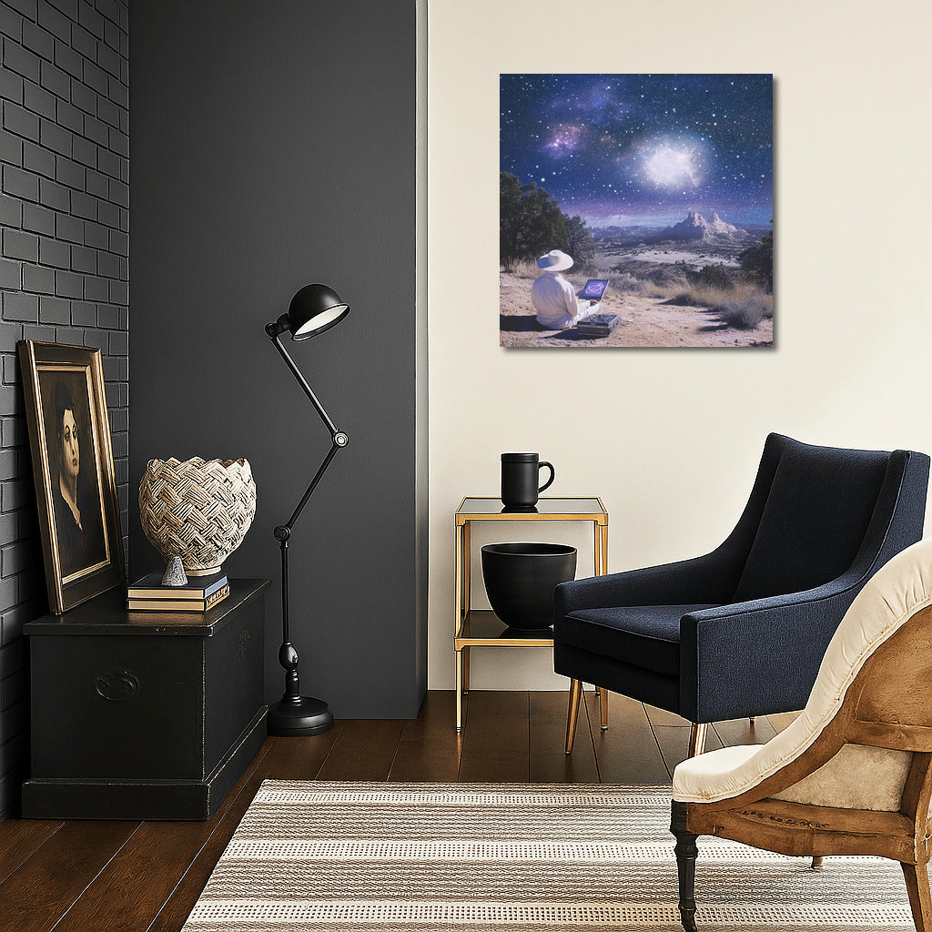 Contemplate the starry universe in this poster where a mysterious observer is lost in his dreams. Perfect wall art for inspiration. See more from the collection: Mixed Wall Art