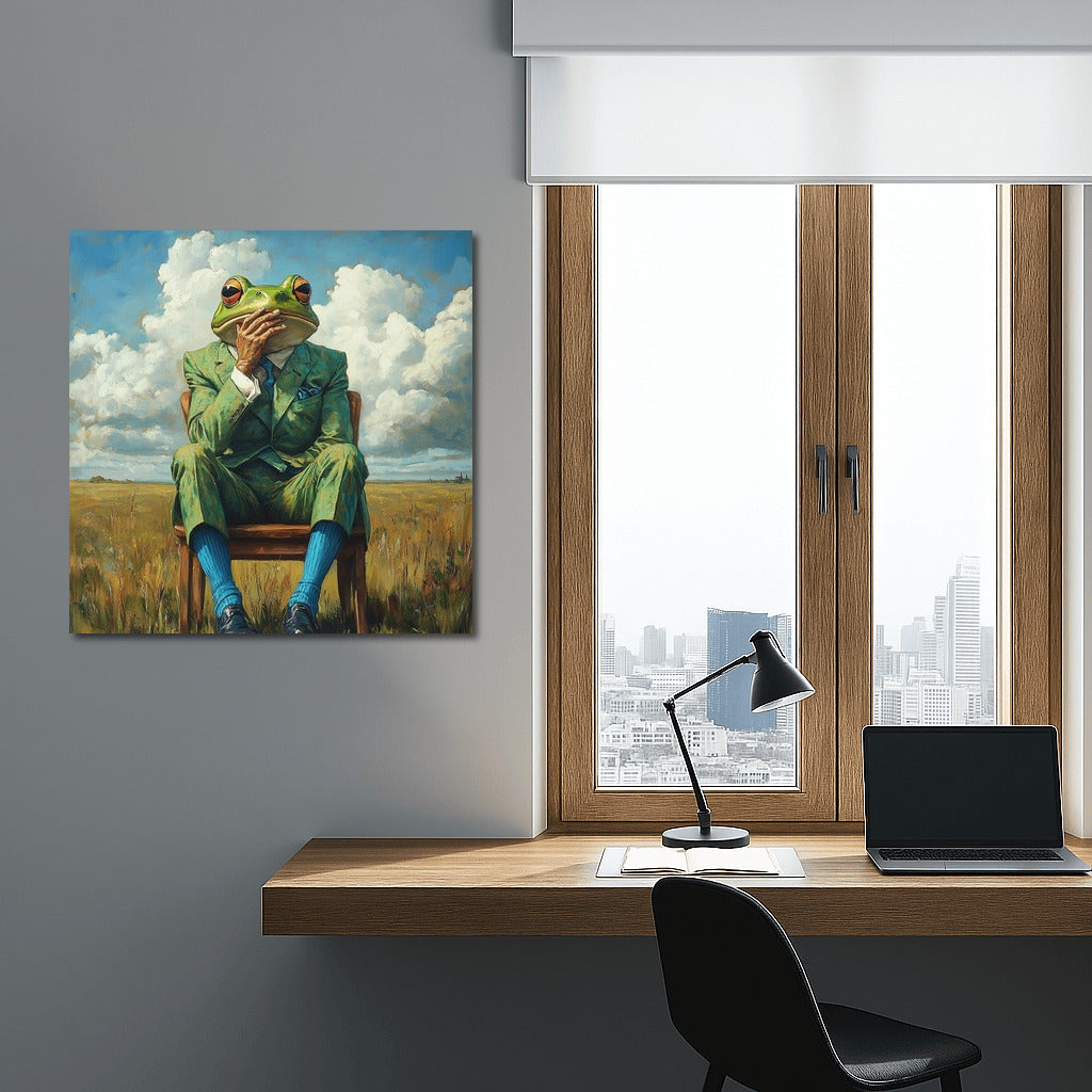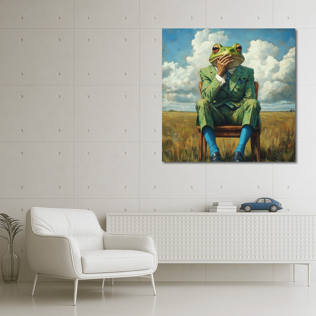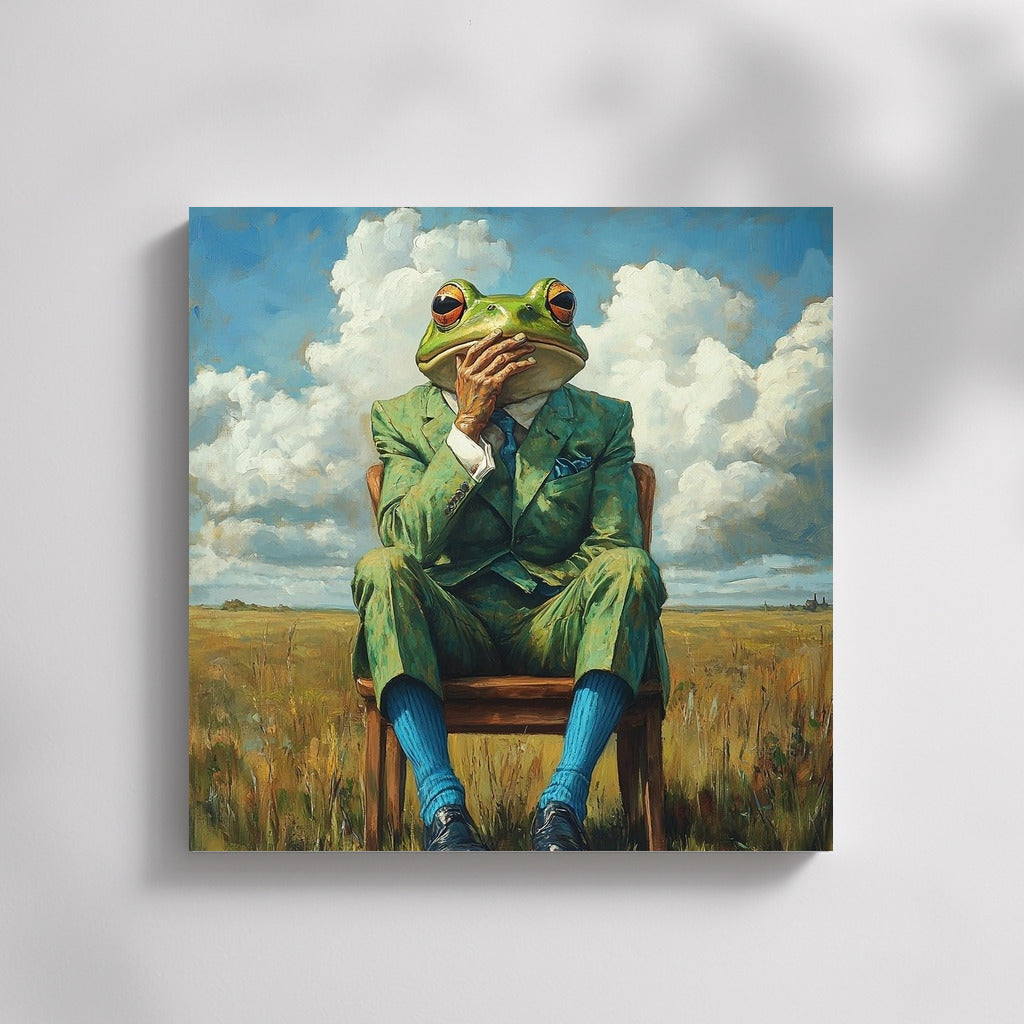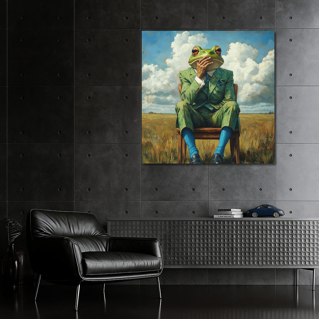 Dive into surrealism with this unique painting: a frog in a suit in the middle of a field. The perfect poster for a creative interior! See more from the collection: Surreal Art