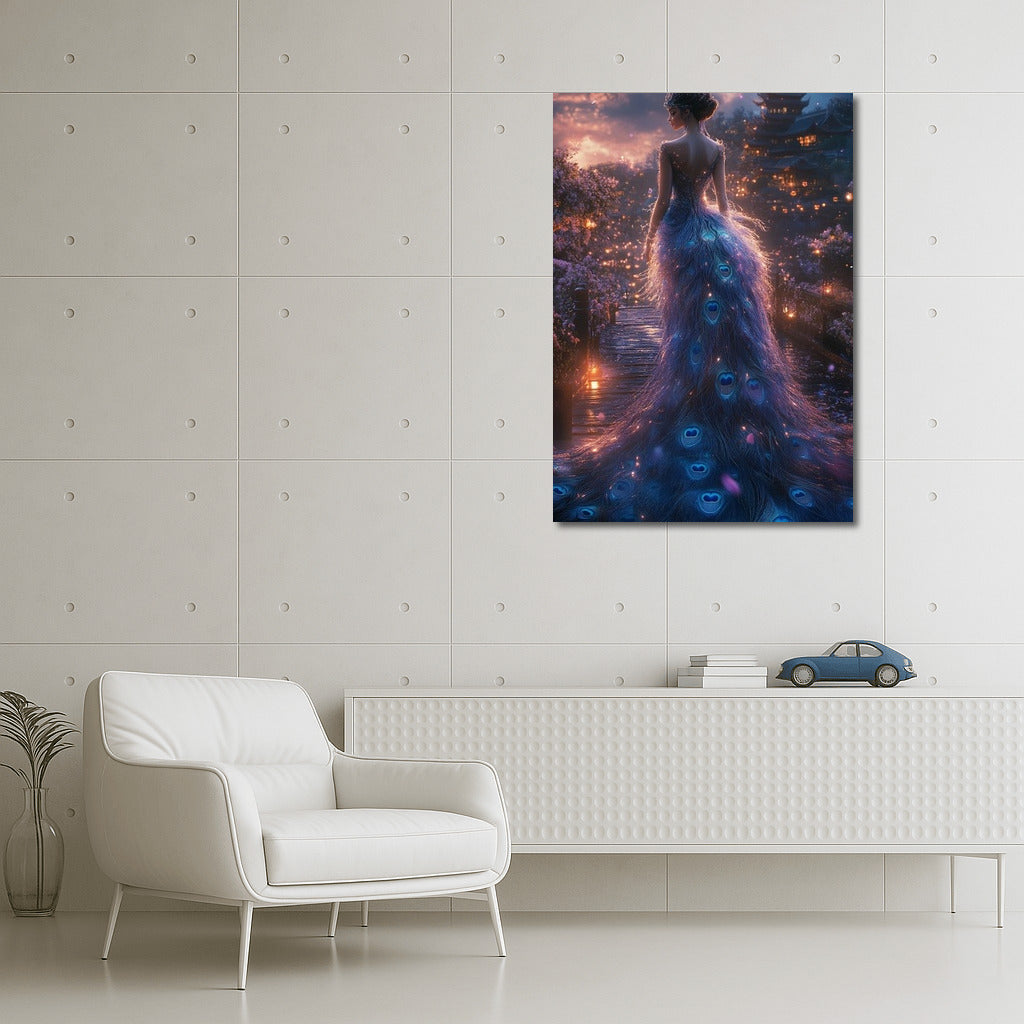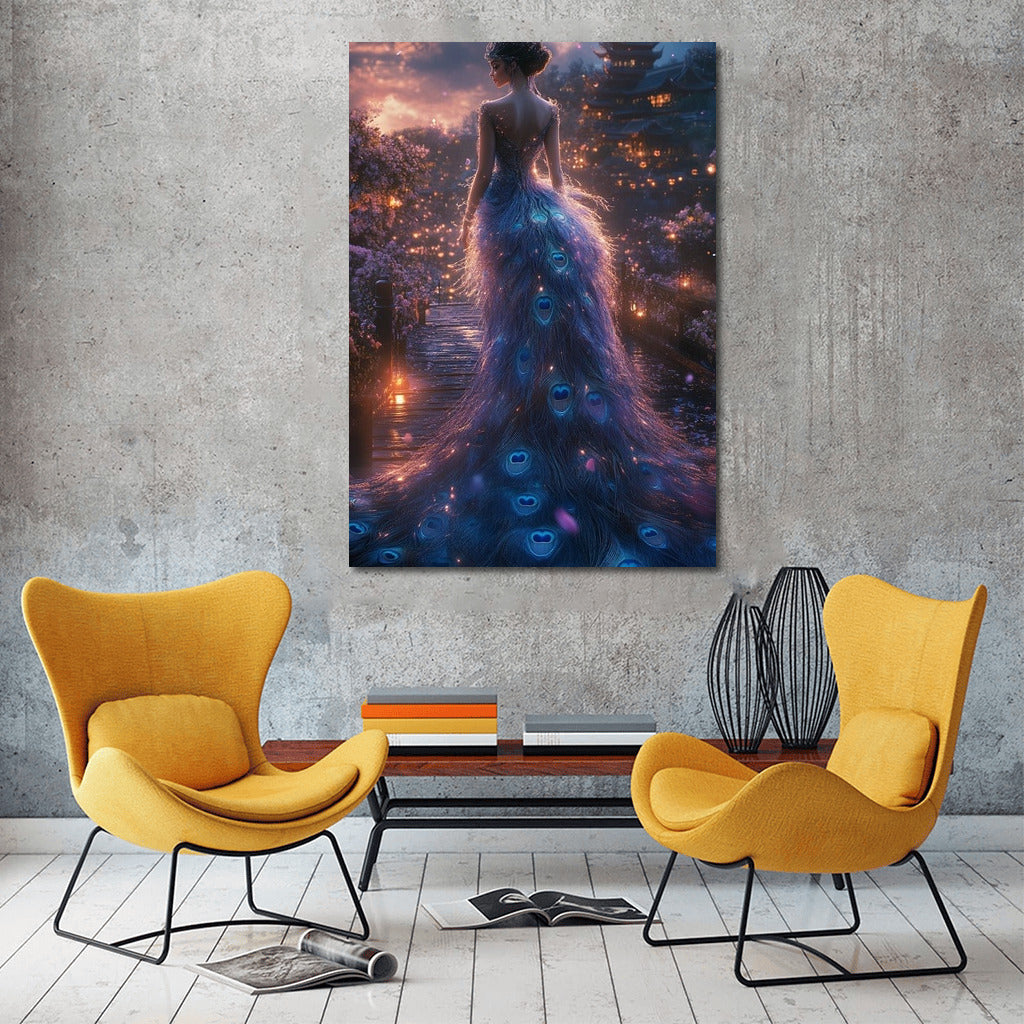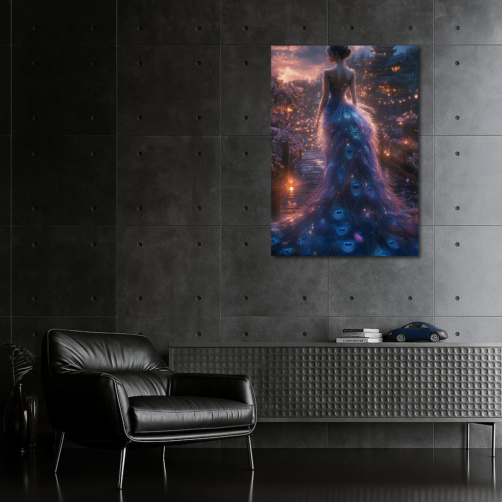 Magical poster: a mysterious creature in a peacock dress, shimmering in a fairytale garden. Art that brings dreams to life! See more from the collection: Mixed Wall Art