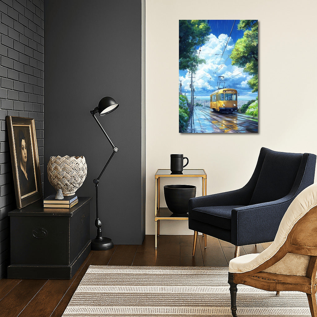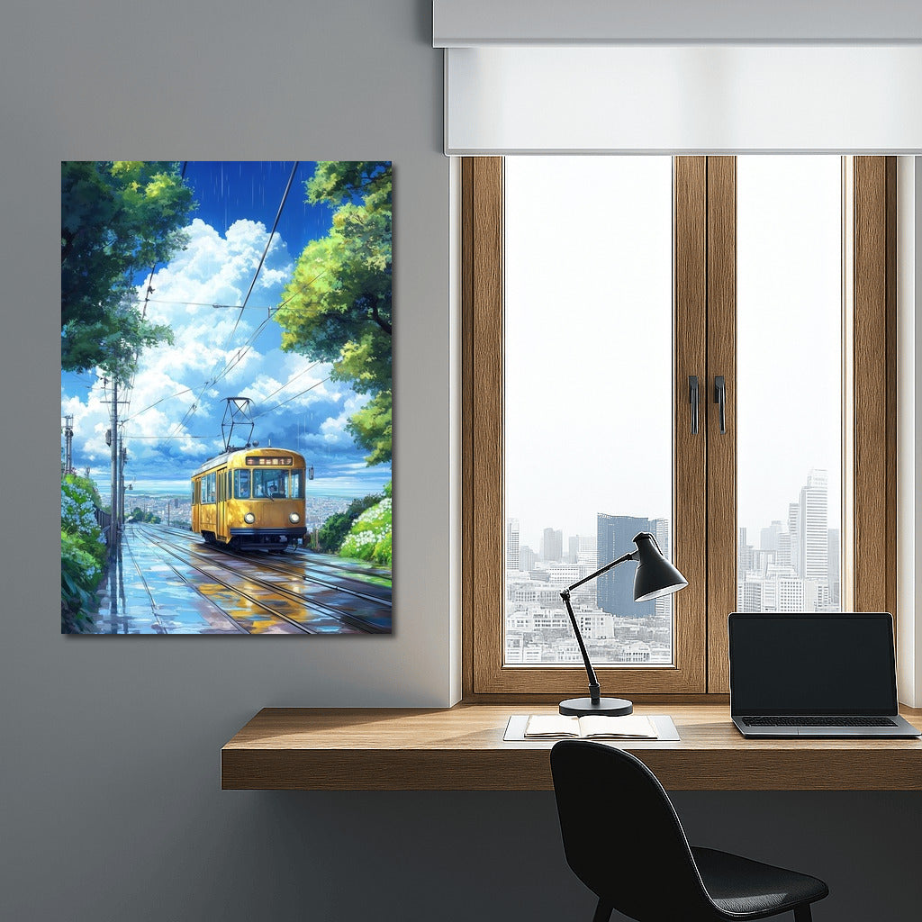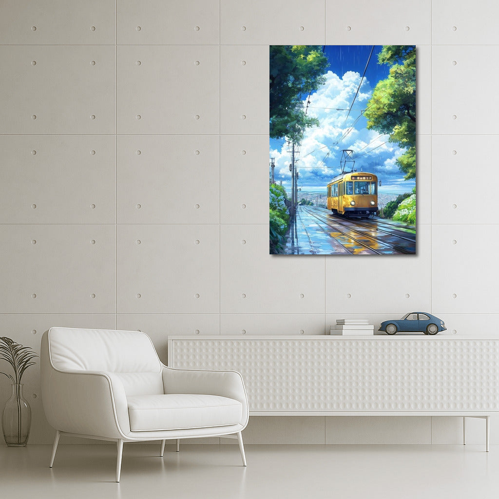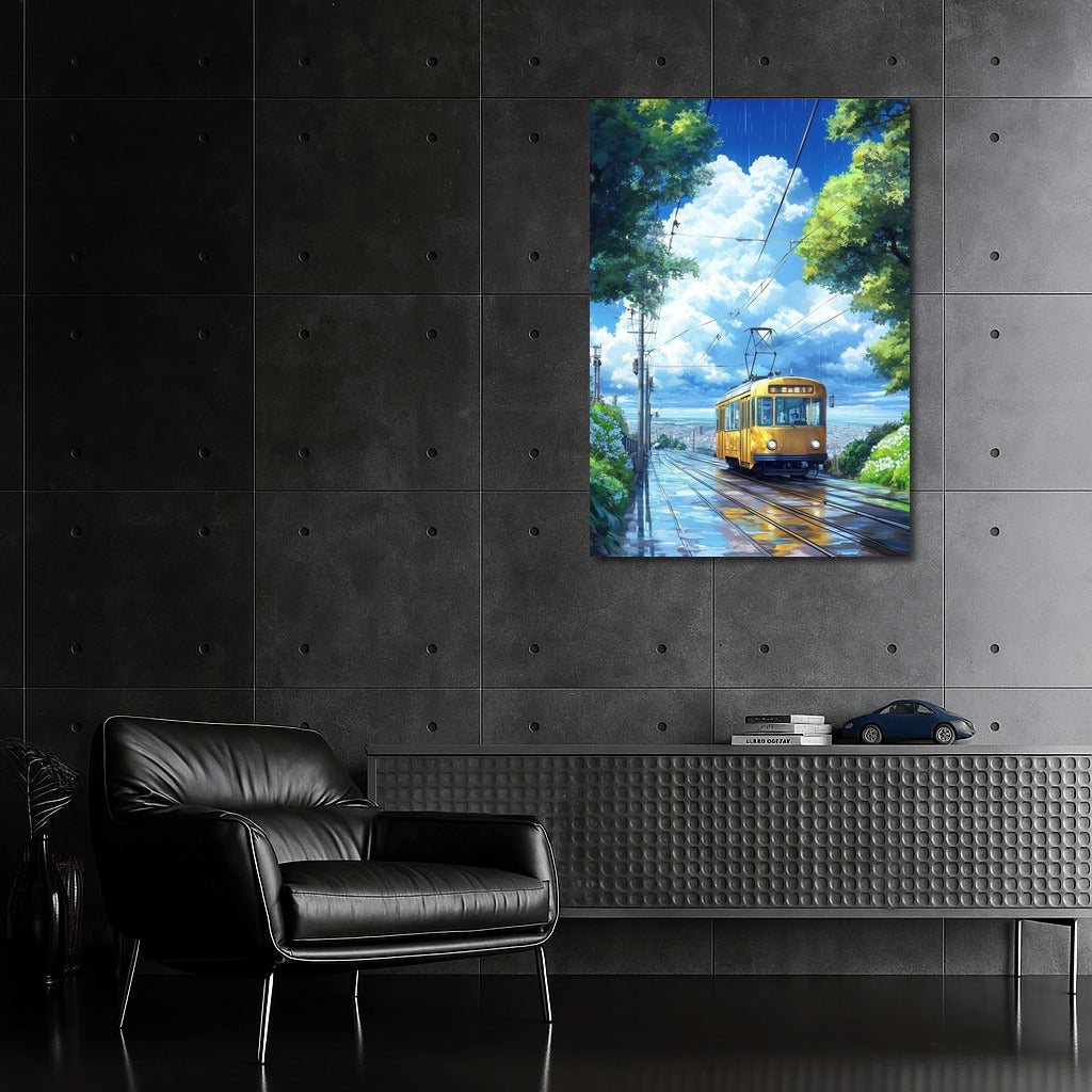 Tram of Dreams: A vibrant poster of a yellow tram sliding through the rain. Wall art for urban dreamers. See more from the collection: Nature & Landscapes Art