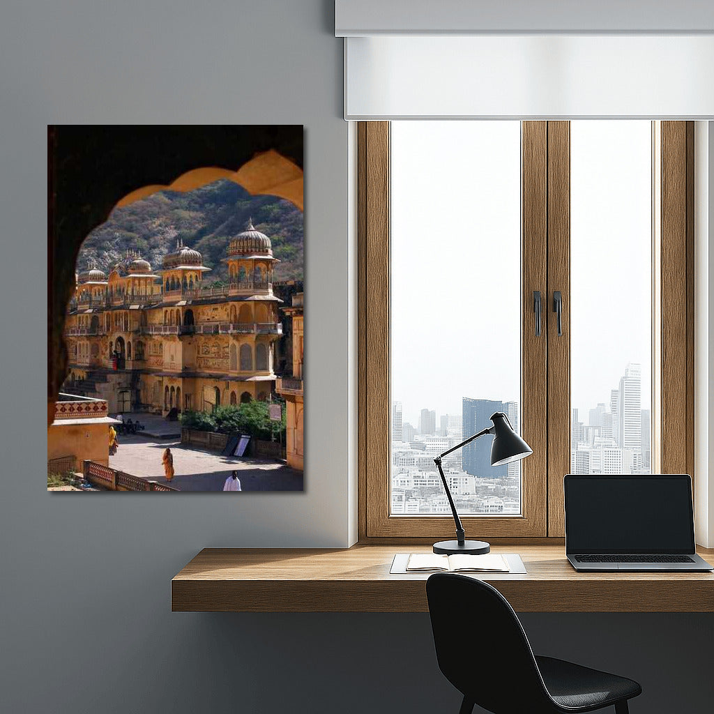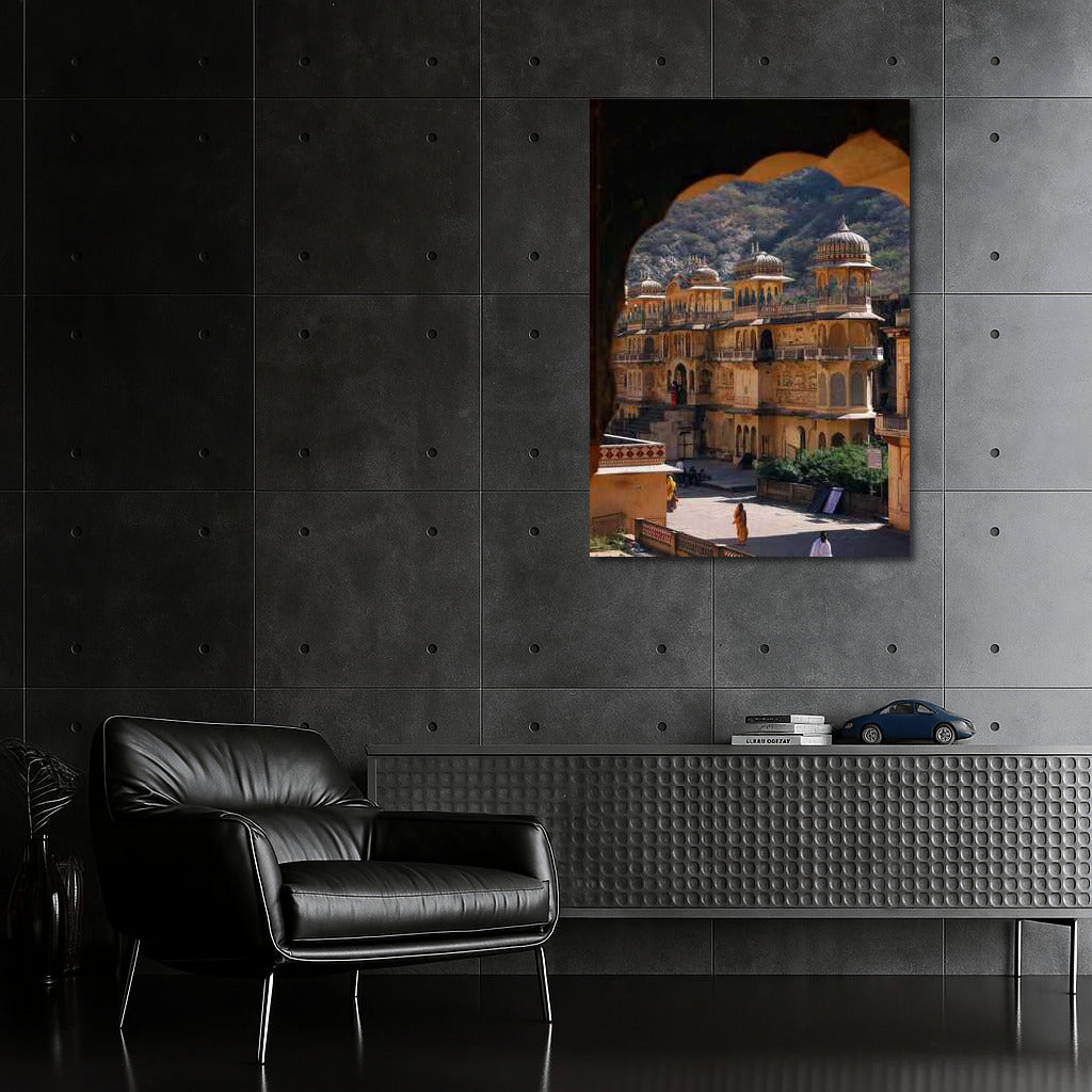 An arch opens up to a majestic palace in India: immerse yourself in the exotic and historical atmosphere with this poster. See more from the collection: Country Art